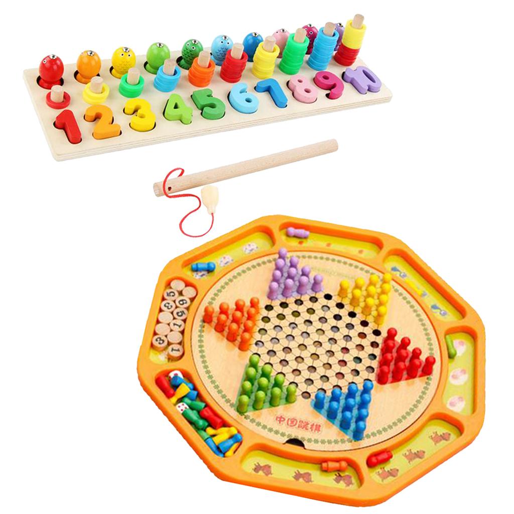 Chinese Checkers 12" Wooden Chessboard with Wooden Fishing Toy for Kids Play