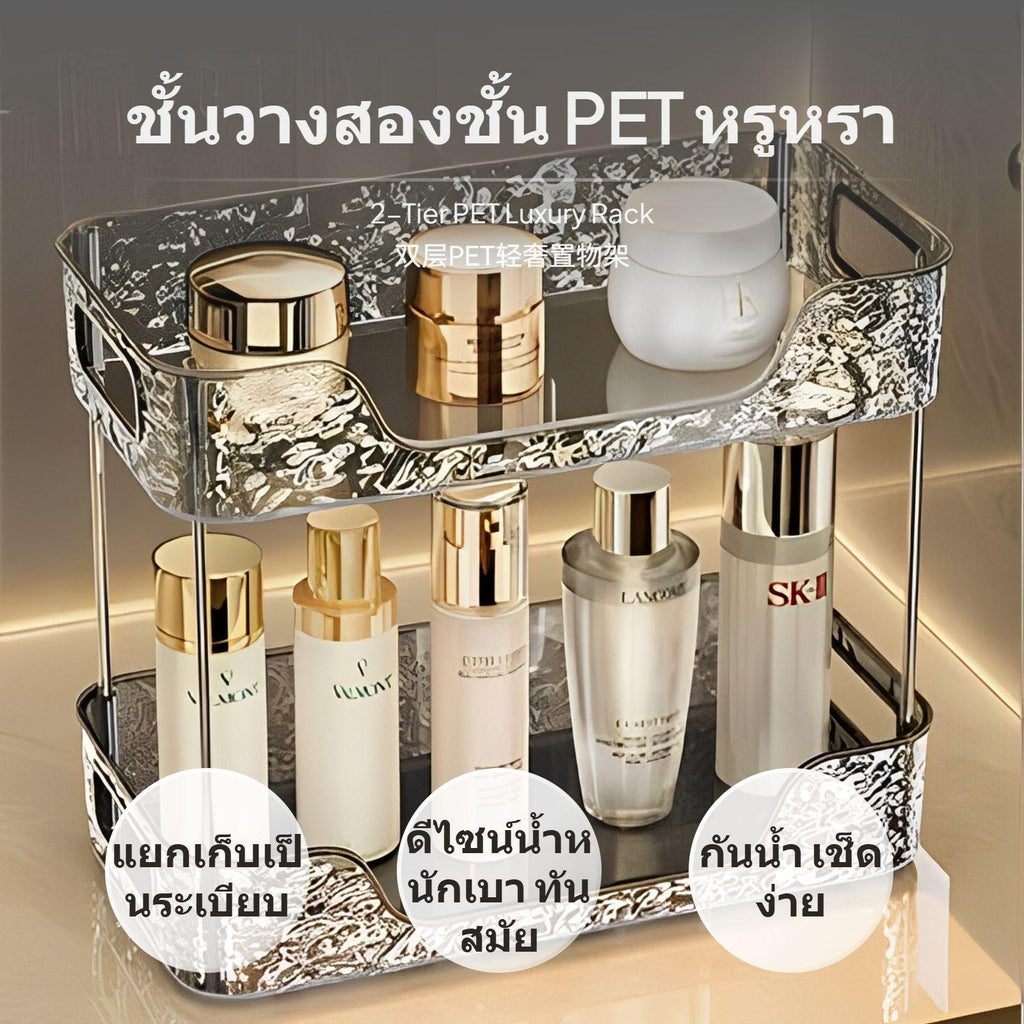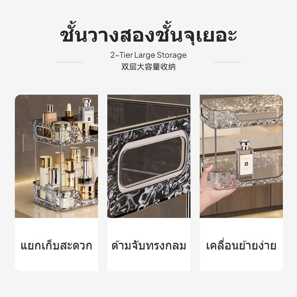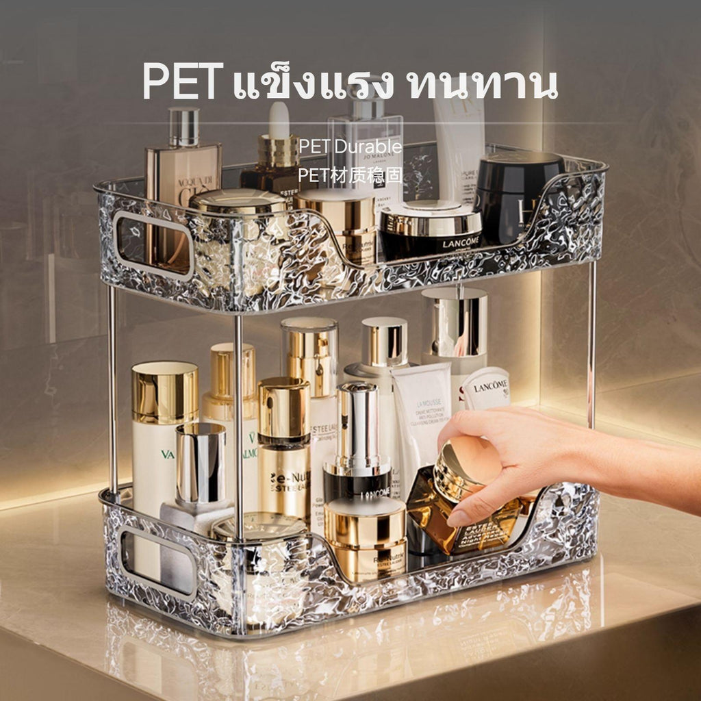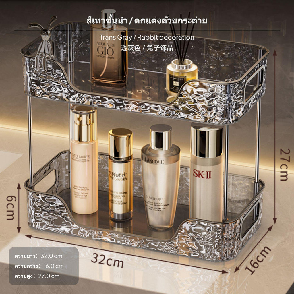 [Efficient bi-leveltier Storage Solution] This 2-tier vanity organizer provides organized storage for makeup, skincare products, and bathroom essentials, maximizing upright space for a tidy countertop.[Premium PET Material & Sturdy Steel Frame] Crafted from thickened PET with a brushed stainless steel frame design, it ensures enduring transparency and strength for dependable holding of heavier items.[Modern Wave Texture & Sleek Design] distinctive creative wave pattern and minimalist solid color effortlessly enhance luxurious and modern decor, adding visual appeal to your dressing table or bathroom.[Spacious Open Compartments] Large doubletier capacity with heightened spacing comfortably stores bottles up to 21cm, including creams and serums, while the open design makes frequent retrieval easy.[adaptable Decorative] Perfect for bathroom, countertop, vanity, or clothing storage cabinet; the refined shape, optional decorative hare figurine, and choice of clear or smoky gray effortlessly enhance organization and aesthetic.Specification:
