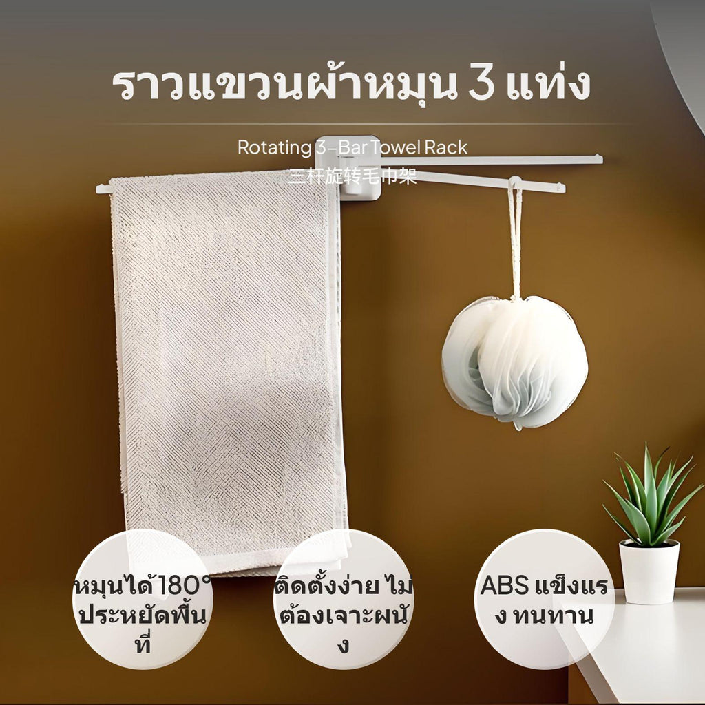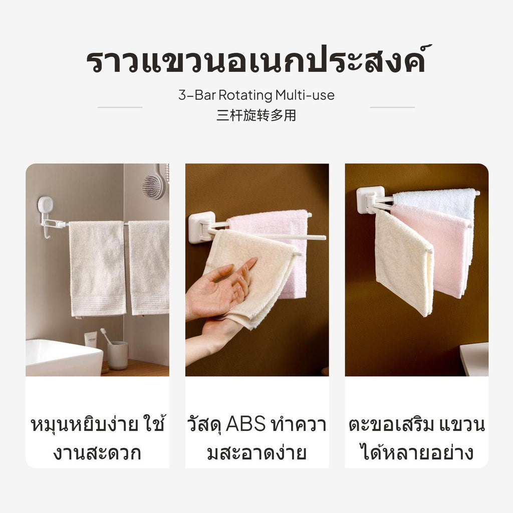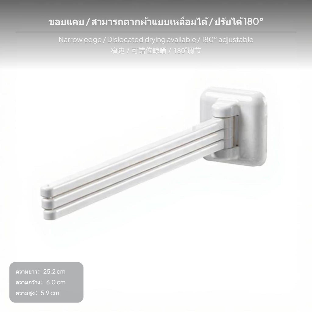 [Smart Space-Saving Organization] Maximize your kitchen and bathroom storage with this 3-bar rotating rack, designed for efficient cloth drying and easy reach.[Flexible 180° Rotation Function] Enjoy customized drying positions thanks to each bar’s separate 180° rotation, allowing for staggered airing and quick water drainage.[No-Drill Strong bonding agent Installation] Installs easily with powerful bonding agent backing, leaving your walls intact and supporting hassleeffortless setup in narrow edges or corners.[Anti-Slip Design for stable Hanging] The ends of each bar feature anti-slip dots to prevent towels or cleaning cloths from falling, offering dependable hold for everyday use.[Multi-Purpose Application] Perfect for homes, dorms, or any space where organization matters—optimal for storing kitchen cloths, towels, or bathroom accessories.Specification: