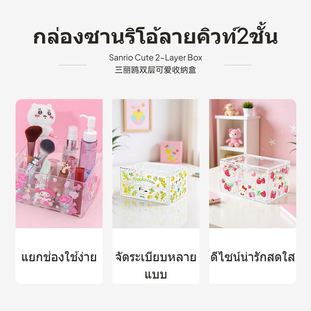 [Efficient Multi-Compartment Storage] This 3-compartment organizer box combines popular Sanrio cartoon design with practical multitier design, making it perfect for sorting cosmetics, stationery, and small items on your desktop or bathroom counter.[Sturdy PS Material] Crafted from robust PS material, the transparent design allows quick item identification and adds a dash of elegance to your workspace or entryway.[Cute Cartoon Theme] Featuring beloved Sanrio characters paired with new floral designs, this organizer brings cheerful vibes to any setting and matches cute, new décor styles.[Drawer Functionality] The integrated drawer offers convenient additional space for individual items and helps maintain privacy, perfect for keeping things neat and tidy.[adaptable Placement] small-sized size accommodates various scenes such as desktop, entryway, bathroom, or vanity. Random character designs emphasize distinctive design; actual pattern/design sent at random.Specification: