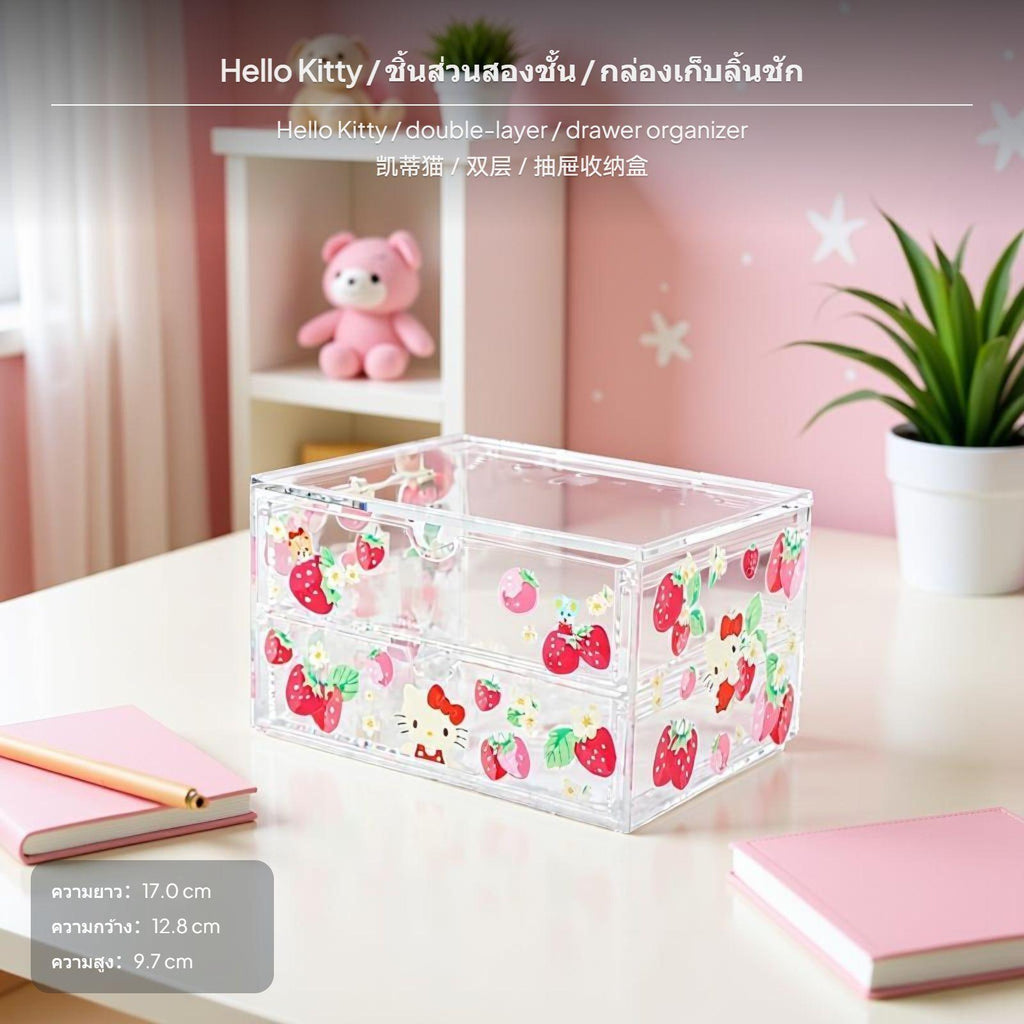 [Efficient Multi-Compartment Storage] This 3-compartment organizer box combines popular Sanrio cartoon design with practical multitier design, making it perfect for sorting cosmetics, stationery, and small items on your desktop or bathroom counter.[Sturdy PS Material] Crafted from robust PS material, the transparent design allows quick item identification and adds a dash of elegance to your workspace or entryway.[Cute Cartoon Theme] Featuring beloved Sanrio characters paired with new floral designs, this organizer brings cheerful vibes to any setting and matches cute, new décor styles.[Drawer Functionality] The integrated drawer offers convenient additional space for individual items and helps maintain privacy, perfect for keeping things neat and tidy.[adaptable Placement] small-sized size accommodates various scenes such as desktop, entryway, bathroom, or vanity. Random character designs emphasize distinctive design; actual pattern/design sent at random.Specification:
