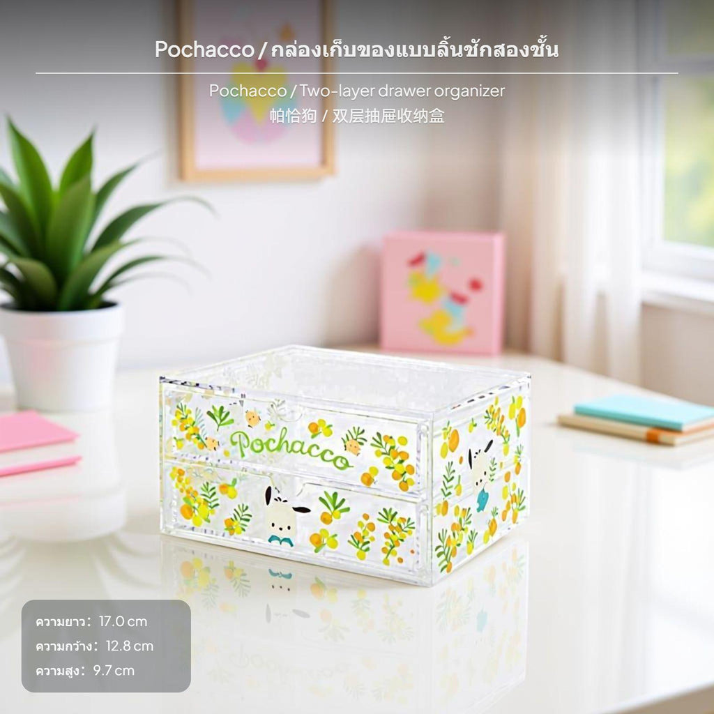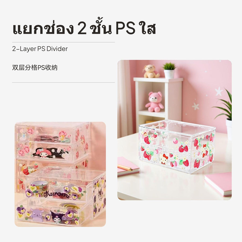 [Efficient Multi-Compartment Storage] This 3-compartment organizer box combines popular Sanrio cartoon design with practical multitier design, making it perfect for sorting cosmetics, stationery, and small items on your desktop or bathroom counter.[Sturdy PS Material] Crafted from robust PS material, the transparent design allows quick item identification and adds a dash of elegance to your workspace or entryway.[Cute Cartoon Theme] Featuring beloved Sanrio characters paired with new floral designs, this organizer brings cheerful vibes to any setting and matches cute, new décor styles.[Drawer Functionality] The integrated drawer offers convenient additional space for individual items and helps maintain privacy, perfect for keeping things neat and tidy.[adaptable Placement] small-sized size accommodates various scenes such as desktop, entryway, bathroom, or vanity. Random character designs emphasize distinctive design; actual pattern/design sent at random.Specification:
