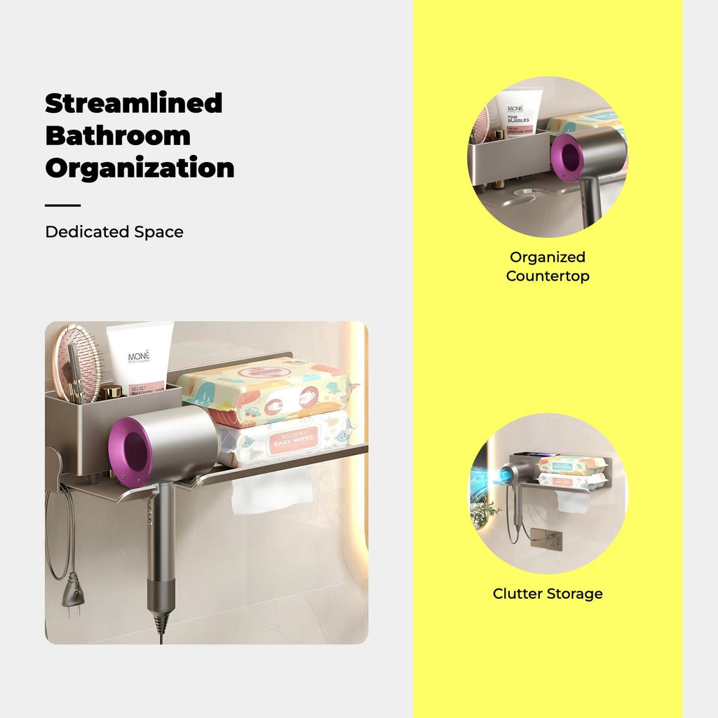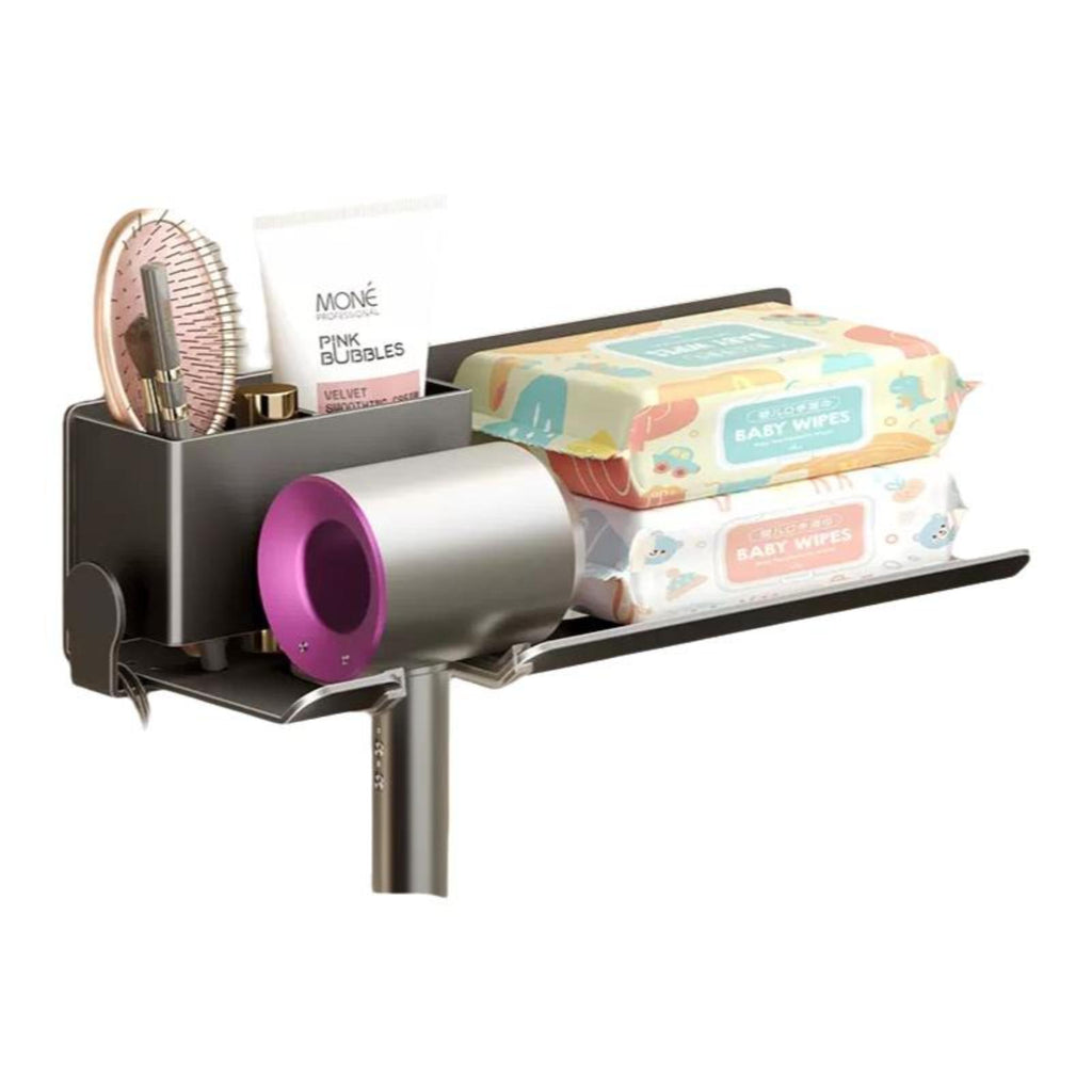 Blow Dryer Holder, Bathroom No-Drill Organizer, Space Saving Black With Shelf B