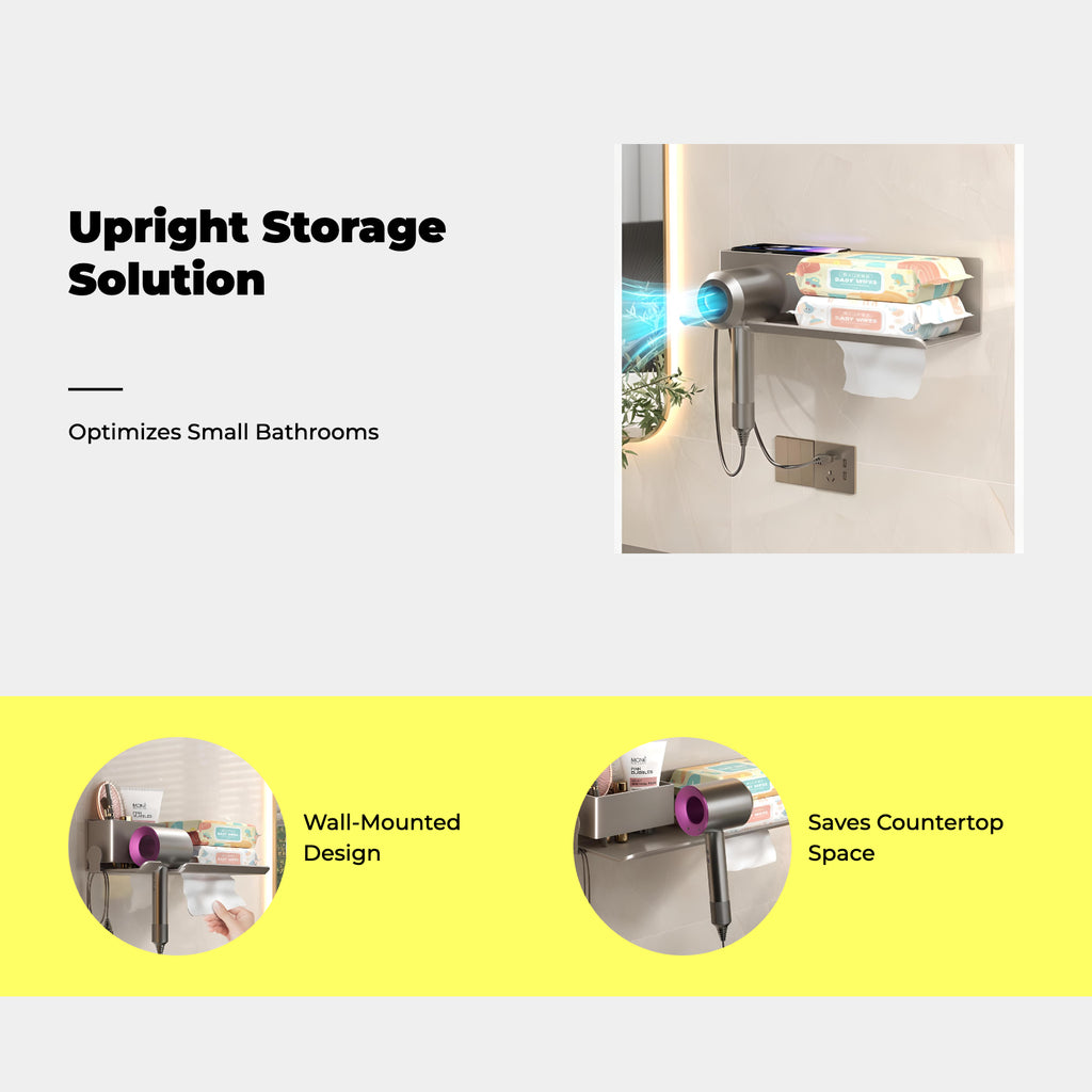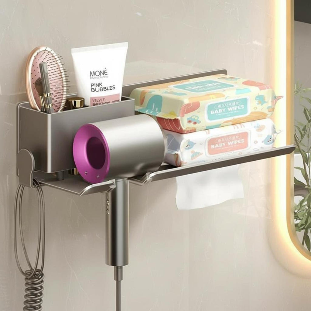 Blow Dryer Holder, Bathroom No-Drill Organizer, Space Saving Gray With Shelf B