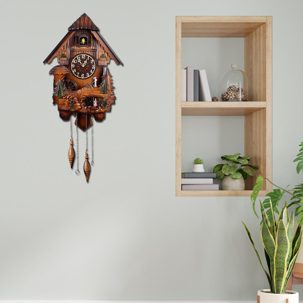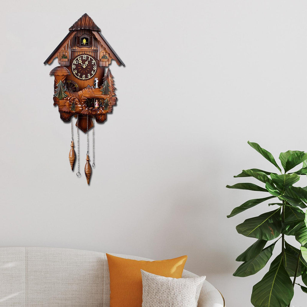 【Authentic Cuckoo Hourly Chime】: As the clock strikes, a little bird emerges, flapping its and opening its beak to sing "Cuckoo, Cuckoo" accompanied by the soothing sound of a brook