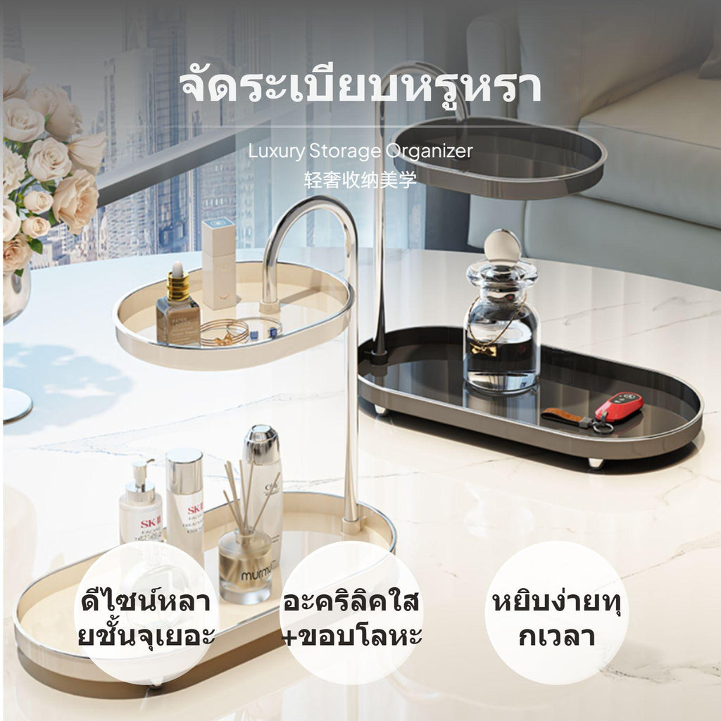 [Efficient Multitier Storage] Organize your cosmetics, skincare, perfumes, and reachories with this adaptable multitier organizer, featuring a spacious double or triple tiered design for easy reach and clutterclutterless surfaces.[Modern & Luxurious design] Elevate your chest of drawers, desk or entryway with the elegant combination of acrylic, stainless steel, and ABS, combined with refined oval, round, and distinctive 'spun sugar' designs, catering to different preferences and interior décors.[Stable and dependable framework] Built with sturdy stainless steel rods and reinforced acrylic pillars, this storage rack ensures a balanced display and secure storage of your items while adding a premium finish to any space.[Multi-purpose Home Organizer] Perfect for use on vanity desks, bathroom countertops, entry cabinets, and living rooms—maximize sorting effectiveness and showcase your collection in elegance with the open compartmentalized layout.[Easy to Clean & Maintain] The polished ABS trays and coated metal parts provide a sleek surface that resists marks, making it easy to keep your organizer looking spotless and clean at all instances.Specification: