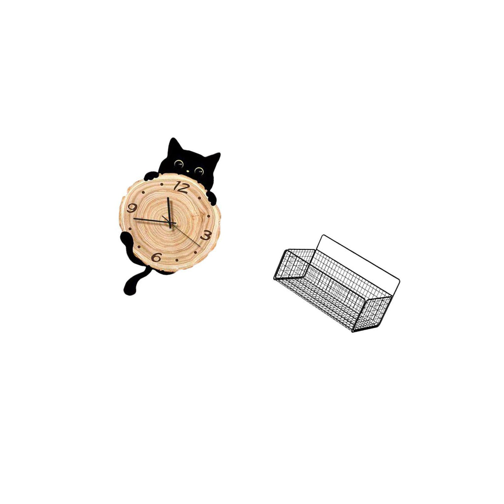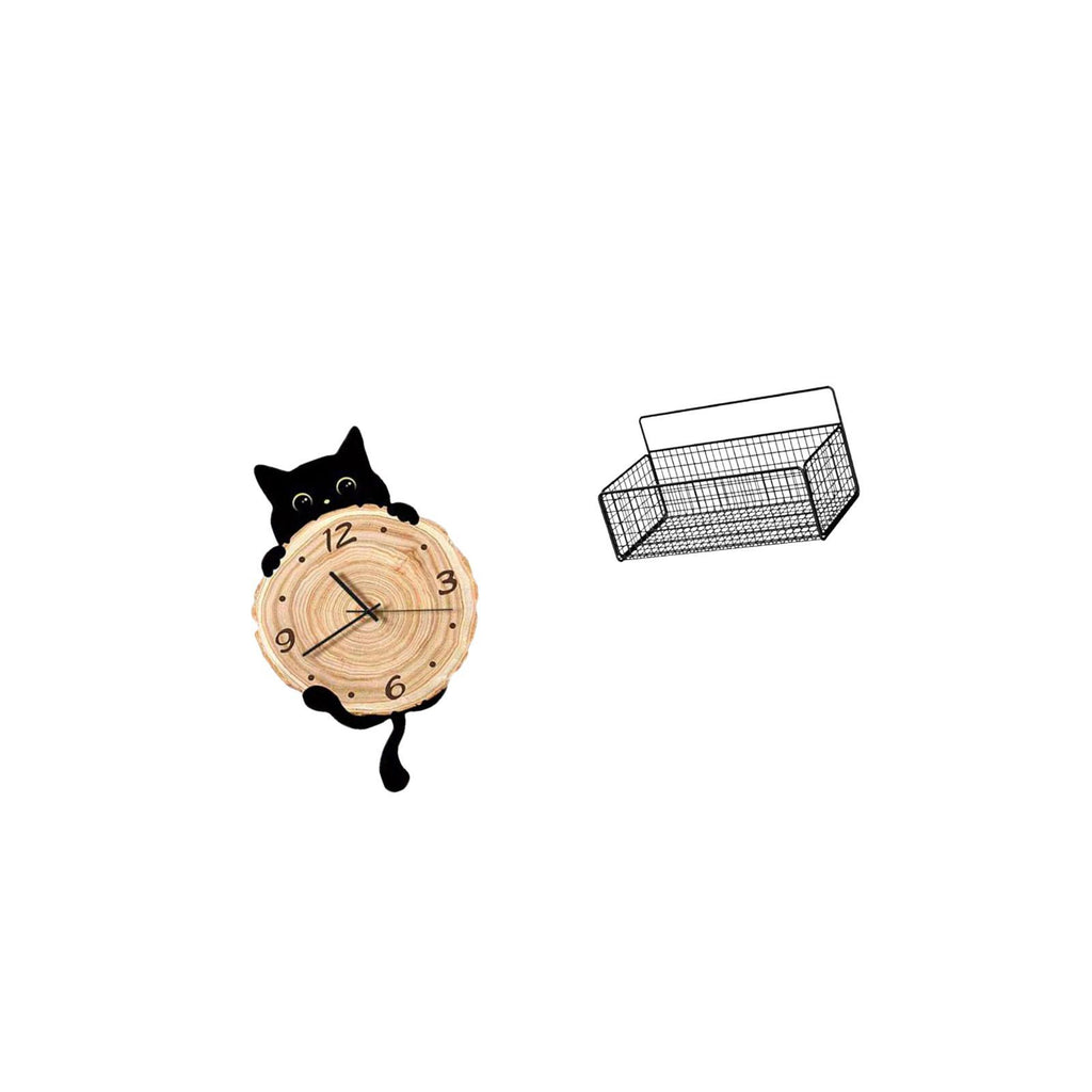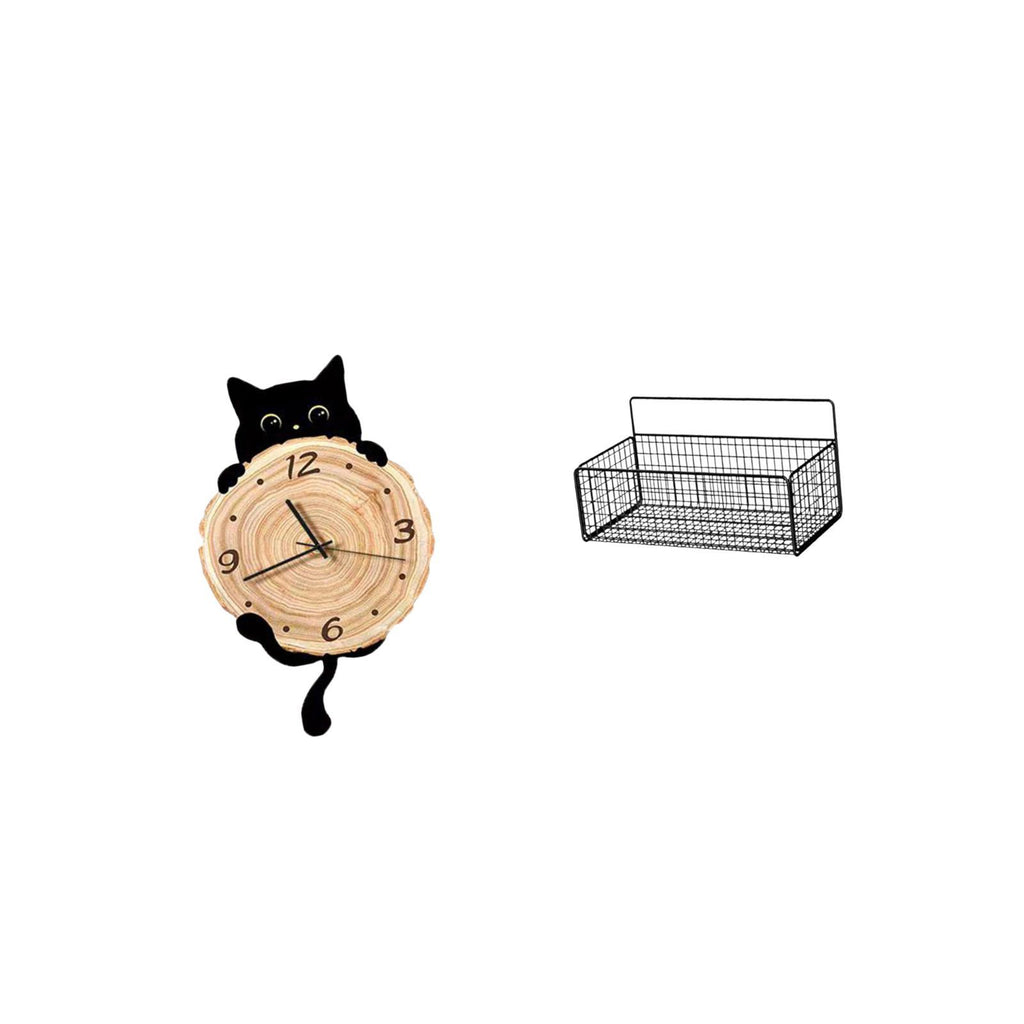 - 【Stylish Design】 This charming cat silhouette is stylish and functional A rustic iron wire storage basket will complement home décor for organized and stylish 2. 【 Material】 Made from MDF materials strong iron and rustproof coated ensures it is sturdy 3. 【Versatile Application】 Suitable for home study room kitchen bathroom living room bedroom office The cat clock is for various settings 4. 【Quiet Use】 The hanging clock operates silently without any ticking noise Allows for plenty of room to hold pantry items snacks for your storage needs 5. 【Easily Hanging】 Wall hanging baskets is easily to install The hanging clock also place on flat counter table top desk