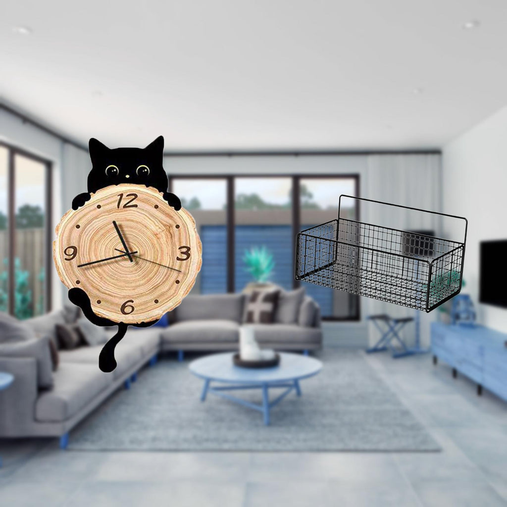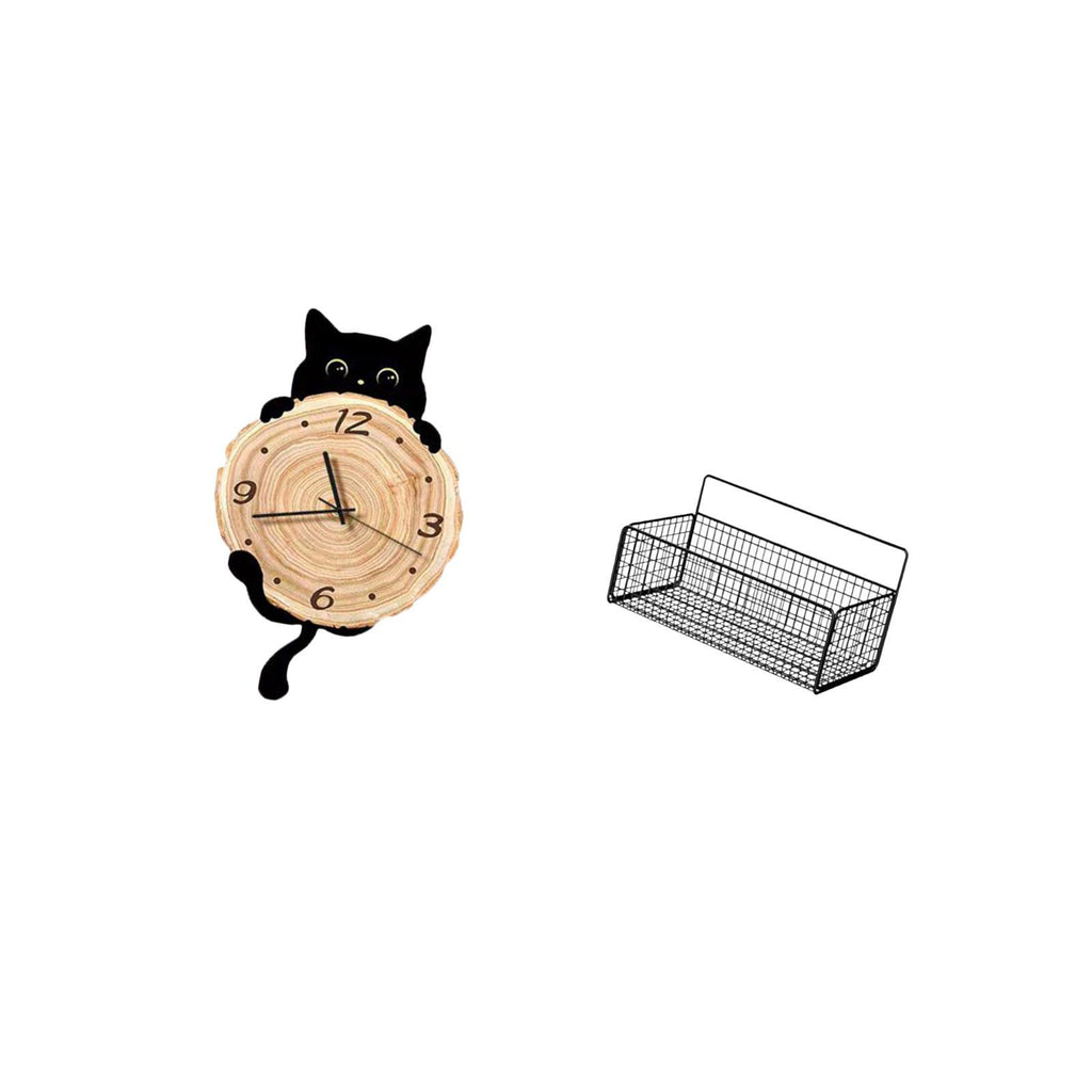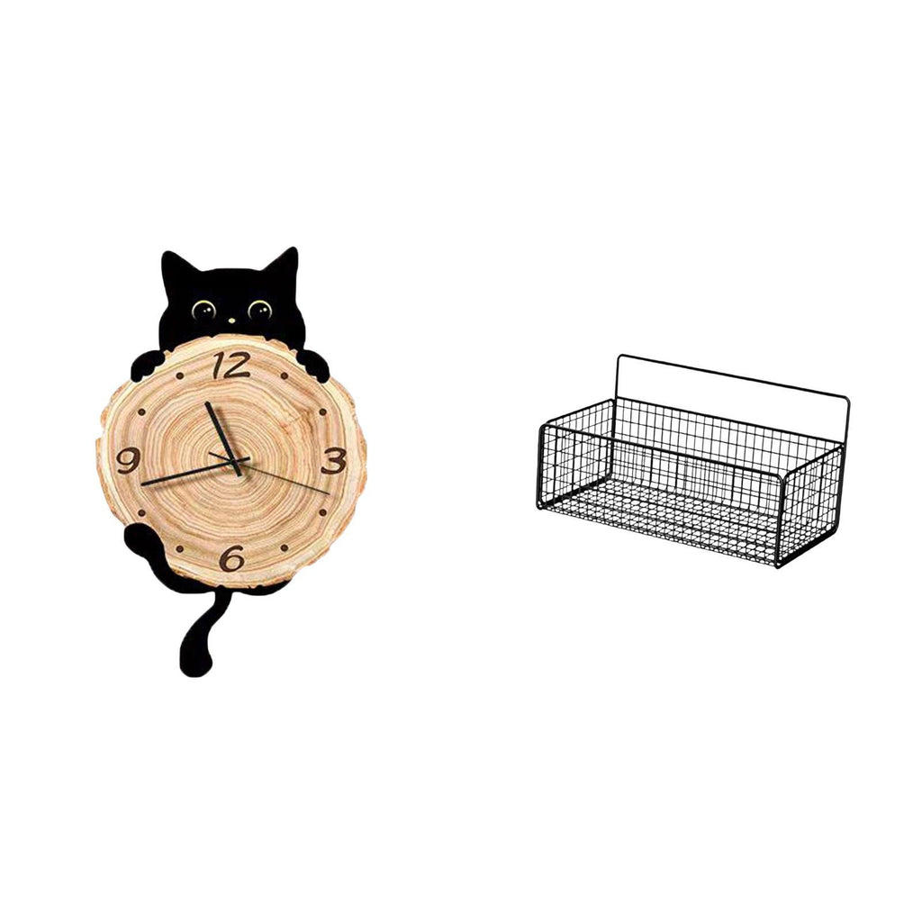 - 【Stylish Design】 This charming cat silhouette is stylish and functional A rustic iron wire storage basket will complement home décor for organized and stylish 2. 【 Material】 Made from MDF materials strong iron and rustproof coated ensures it is sturdy 3. 【Versatile Application】 Suitable for home study room kitchen bathroom living room bedroom office The cat clock is for various settings 4. 【Quiet Use】 The hanging clock operates silently without any ticking noise Allows for plenty of room to hold pantry items snacks for your storage needs 5. 【Easily Hanging】 Wall hanging baskets is easily to install The hanging clock also place on flat counter table top desk