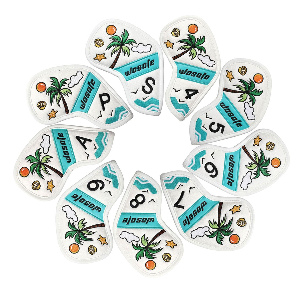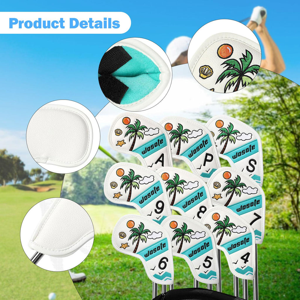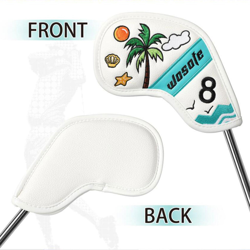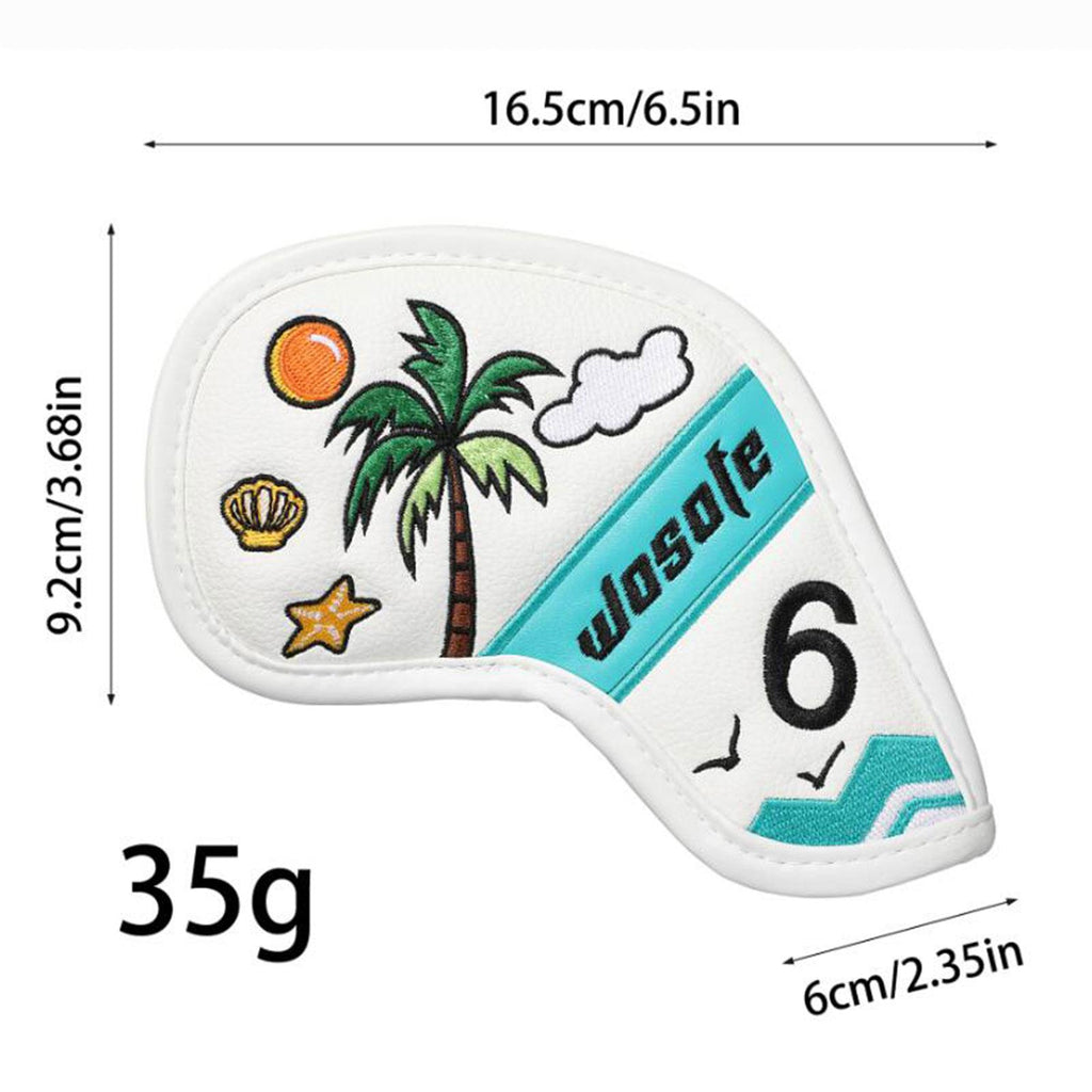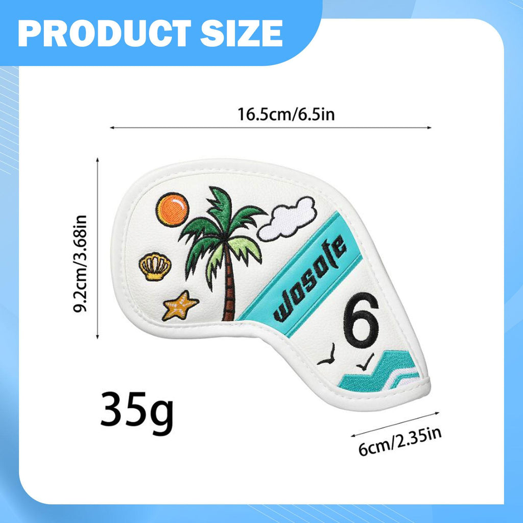 【Design】: The 9 golf iron headcovers features a Fresh and beautiful scene by the sea with coconut trees, adds a touch of fun to your golf gear