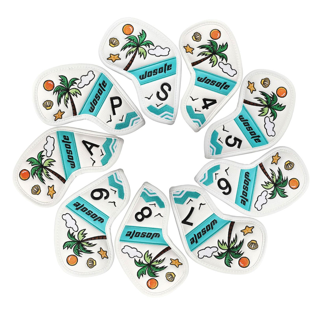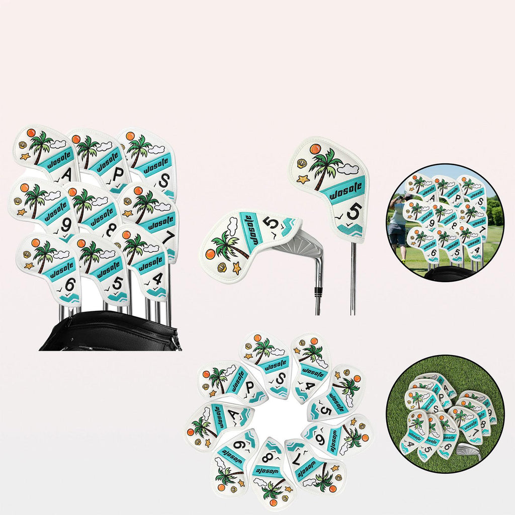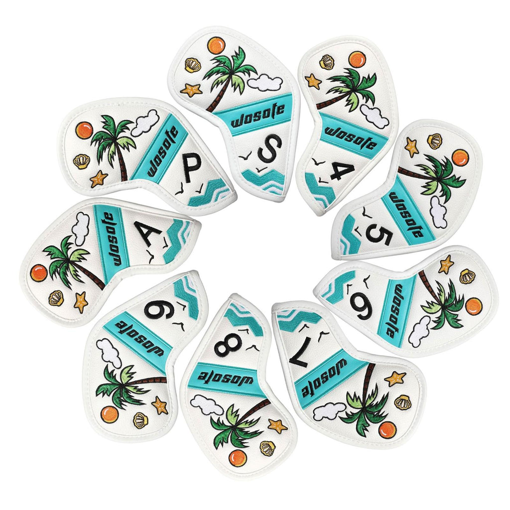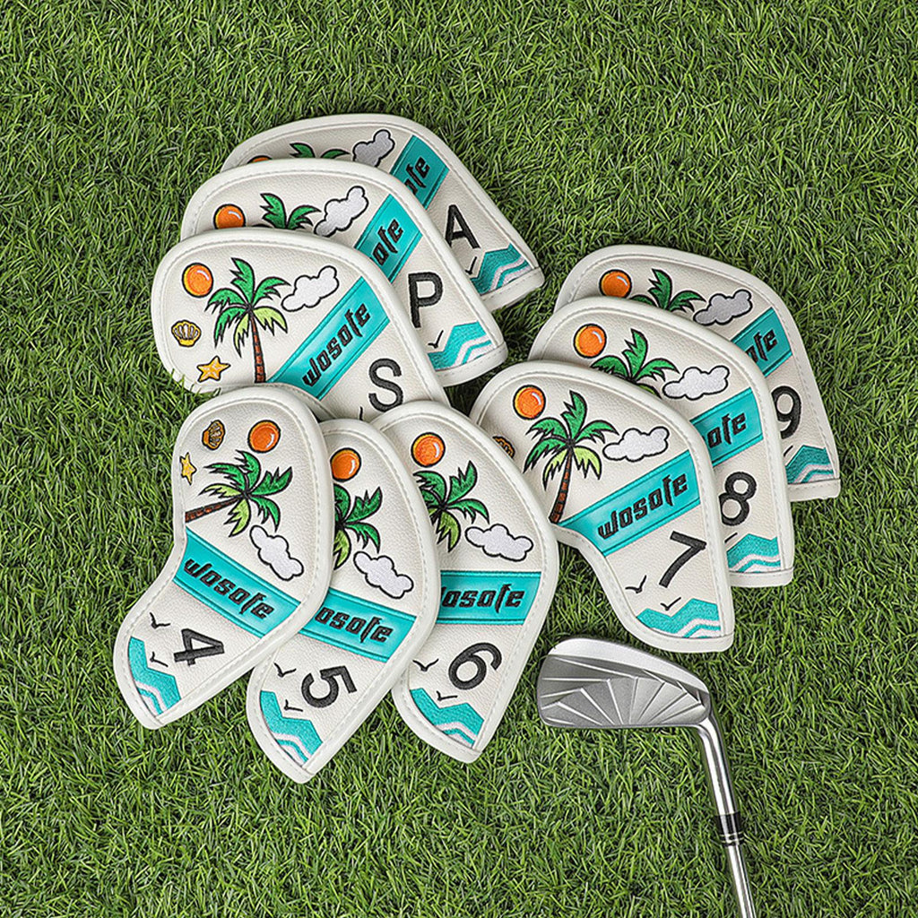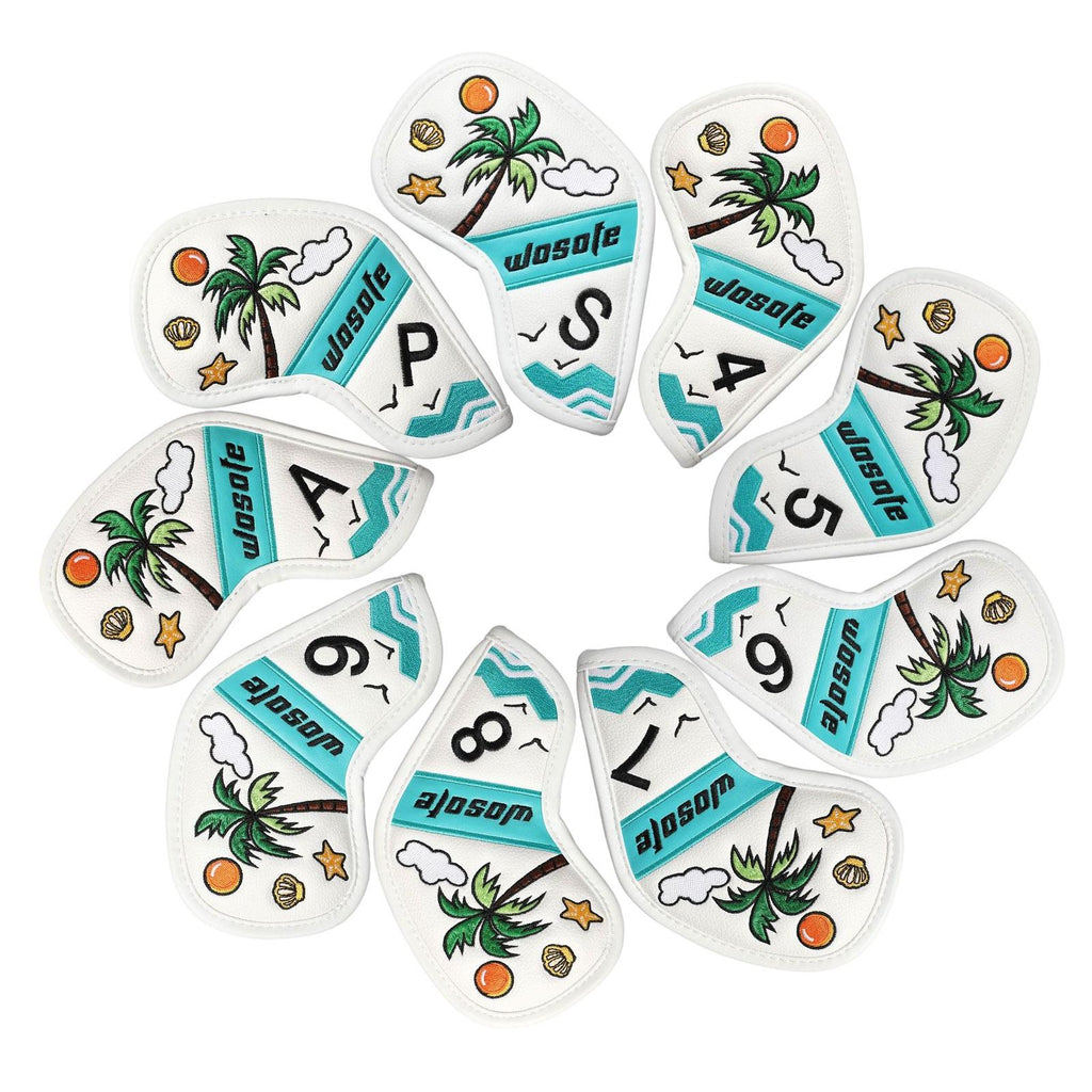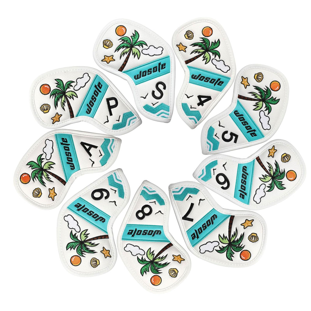【Design】: The 9 golf iron headcovers features a Fresh and beautiful scene by the sea with coconut trees, adds a touch of fun to your golf gear