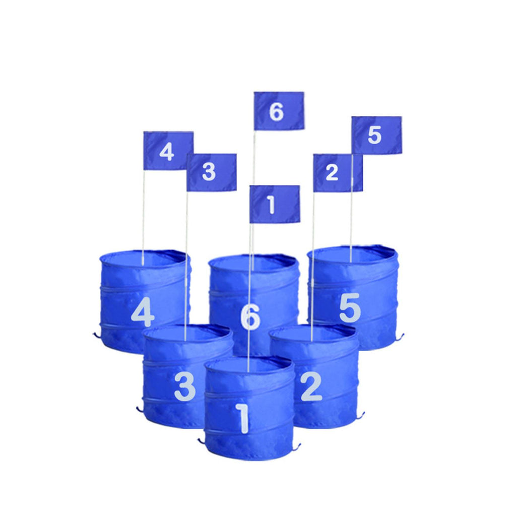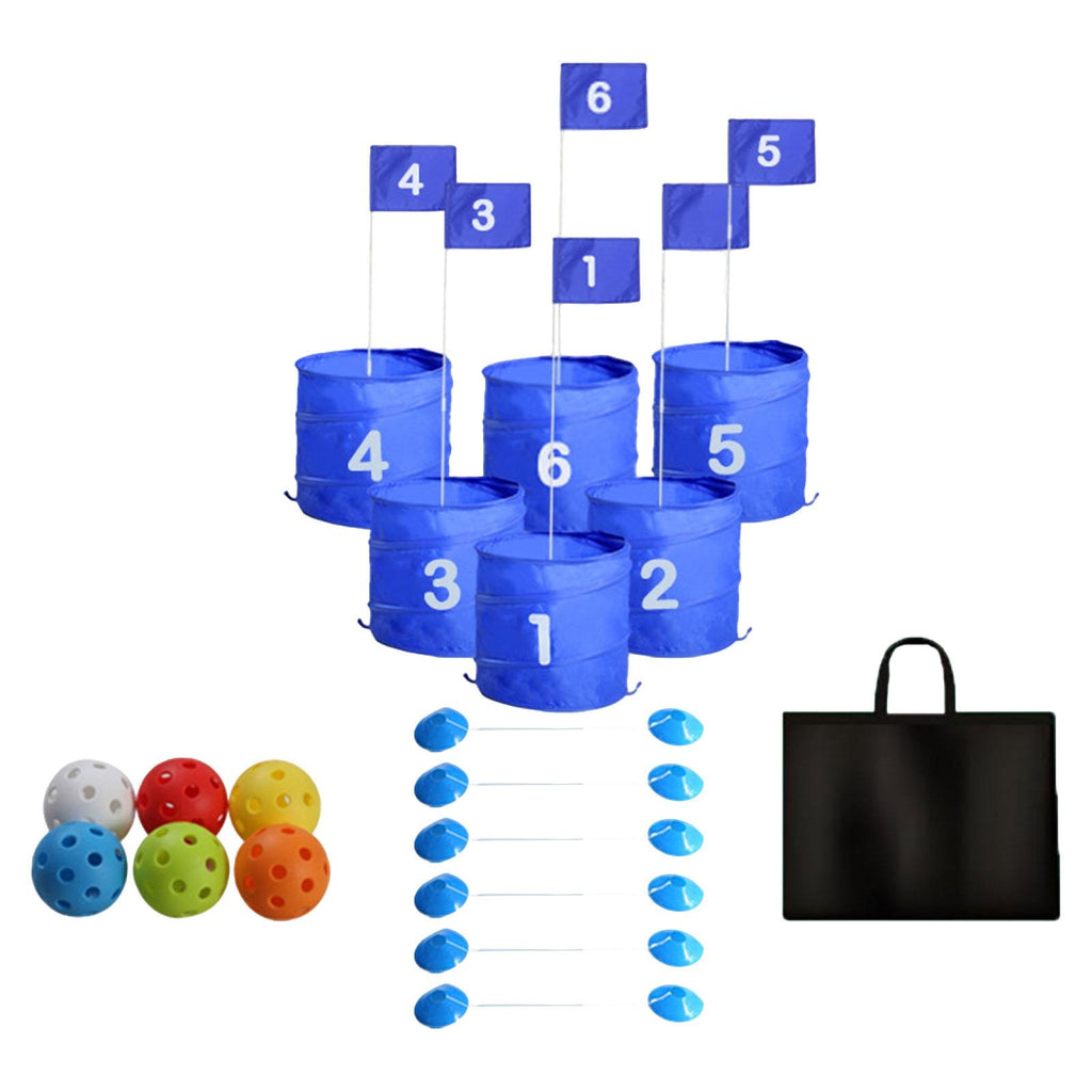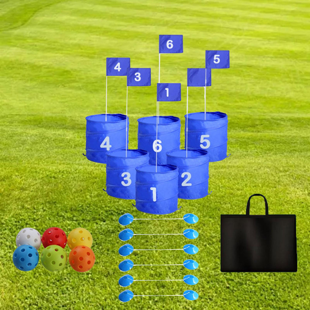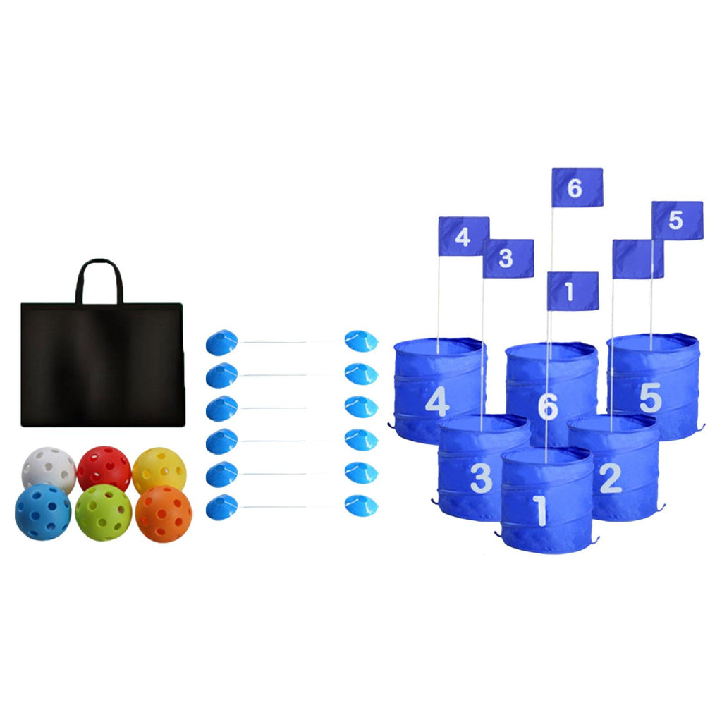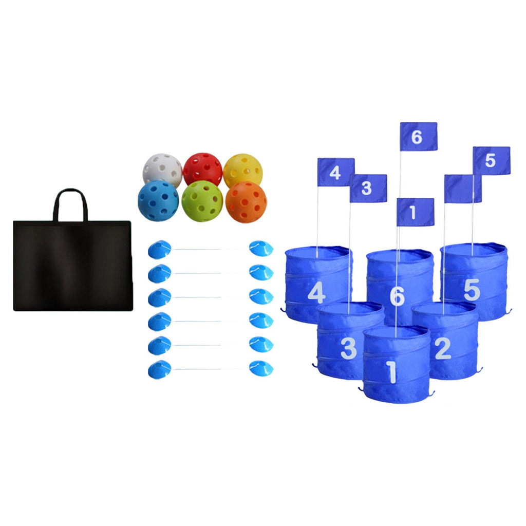 【Complete set for training and play】: This golf course play game set includes everything you need for practice and play, featuring 6 game buckets, 6 pickleballs, 12 marker discs, 6 support poles, 6 flags, and a convenient storage bag