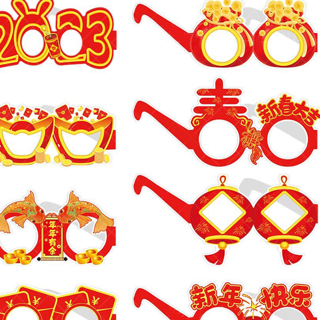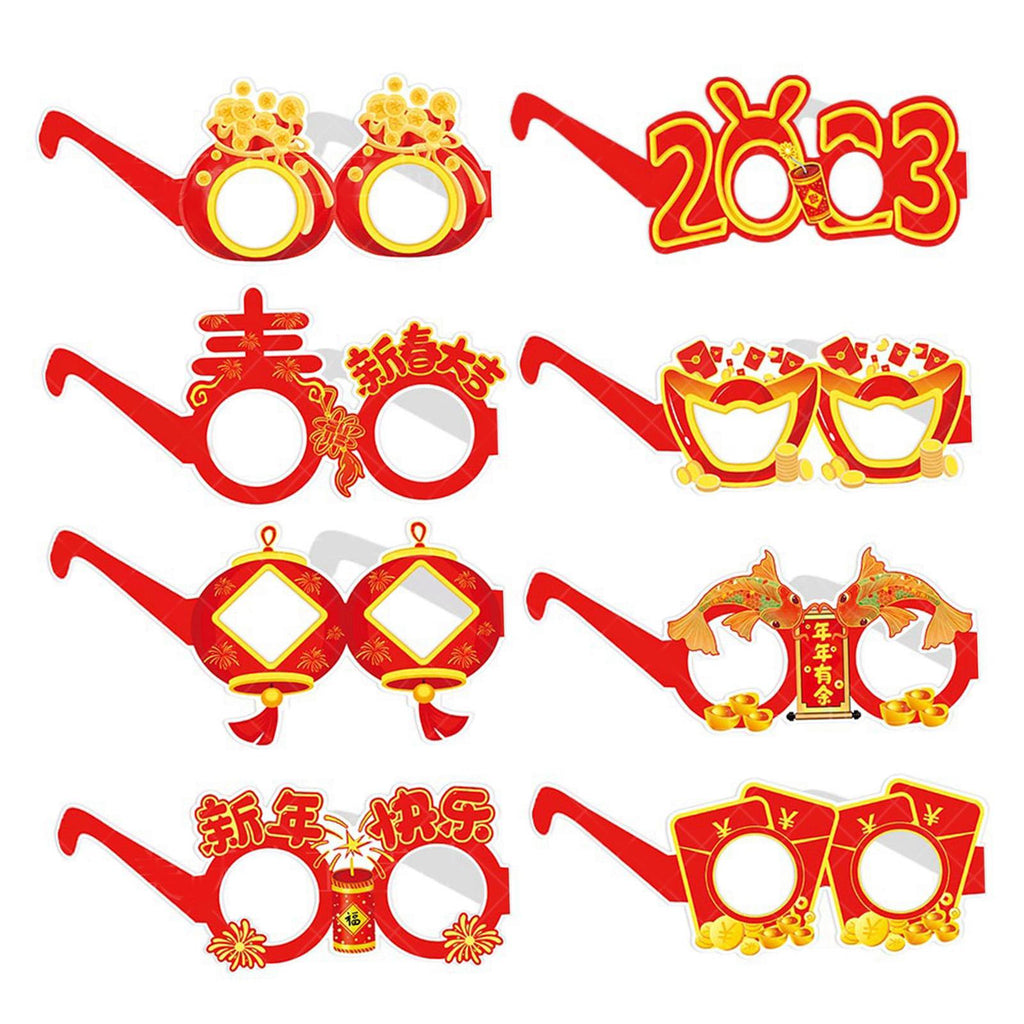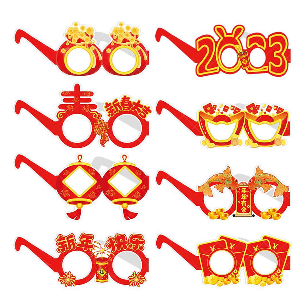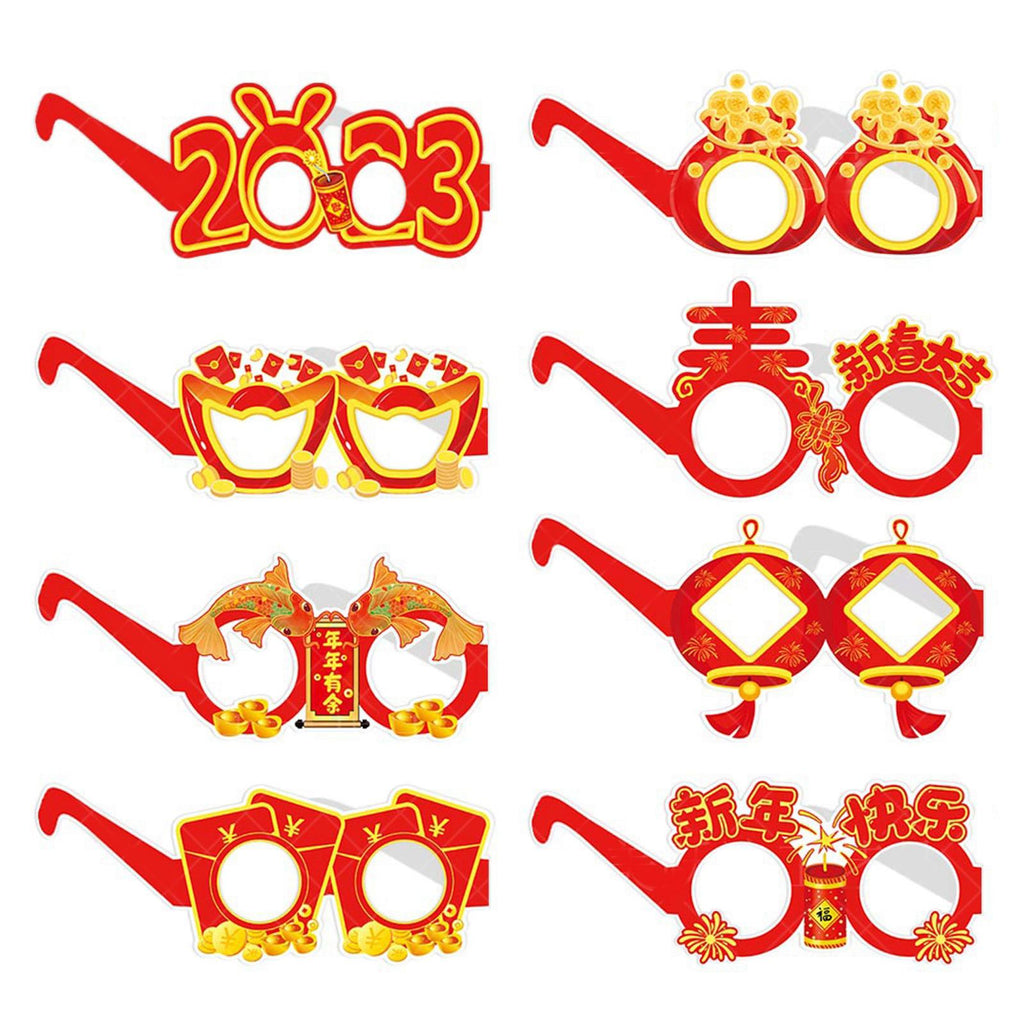 - Happy New Year glasses: 2023 photo props, New Year decorations, paper Spring Festival photo glasses. Wear them with your New Year's Eve party outfits to celebrate the arrival of the new year 2023, look festive and be the center of attention in no time