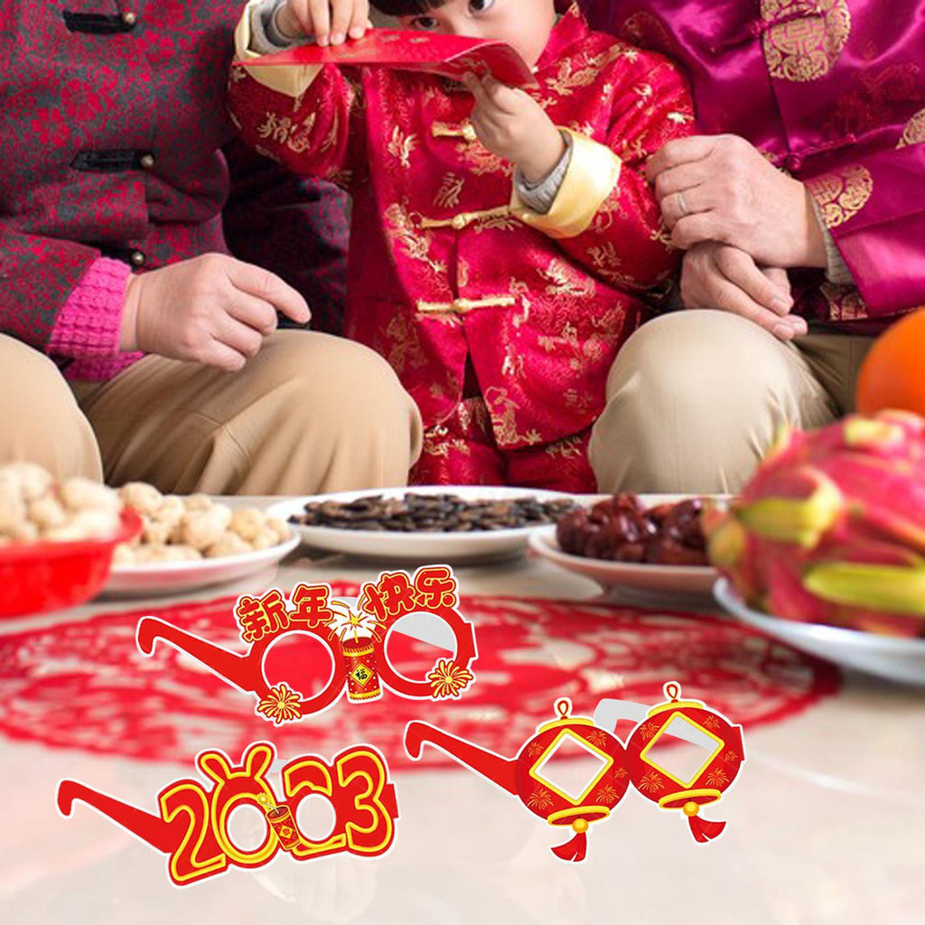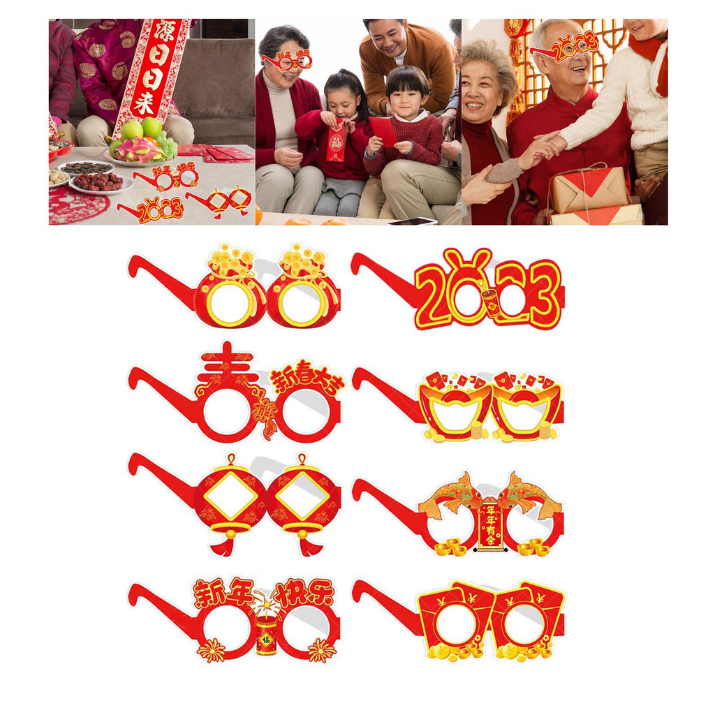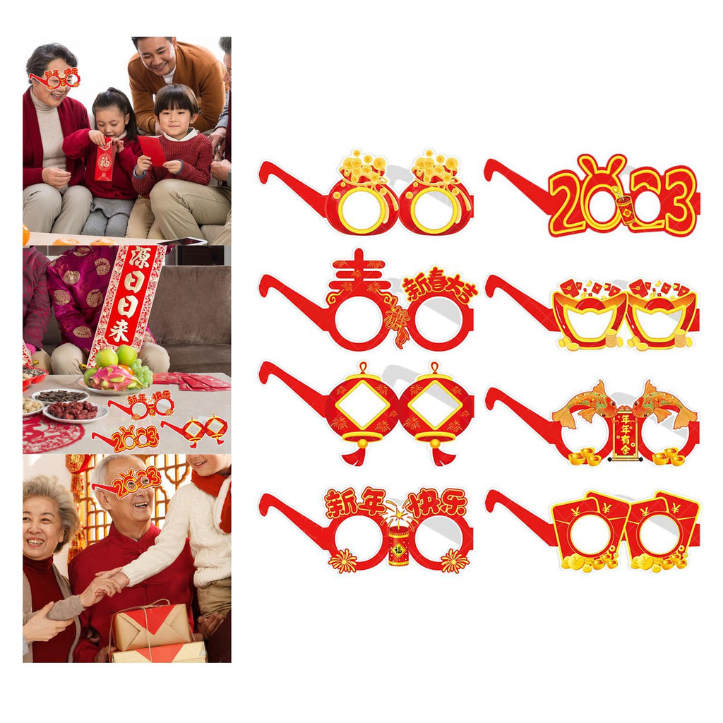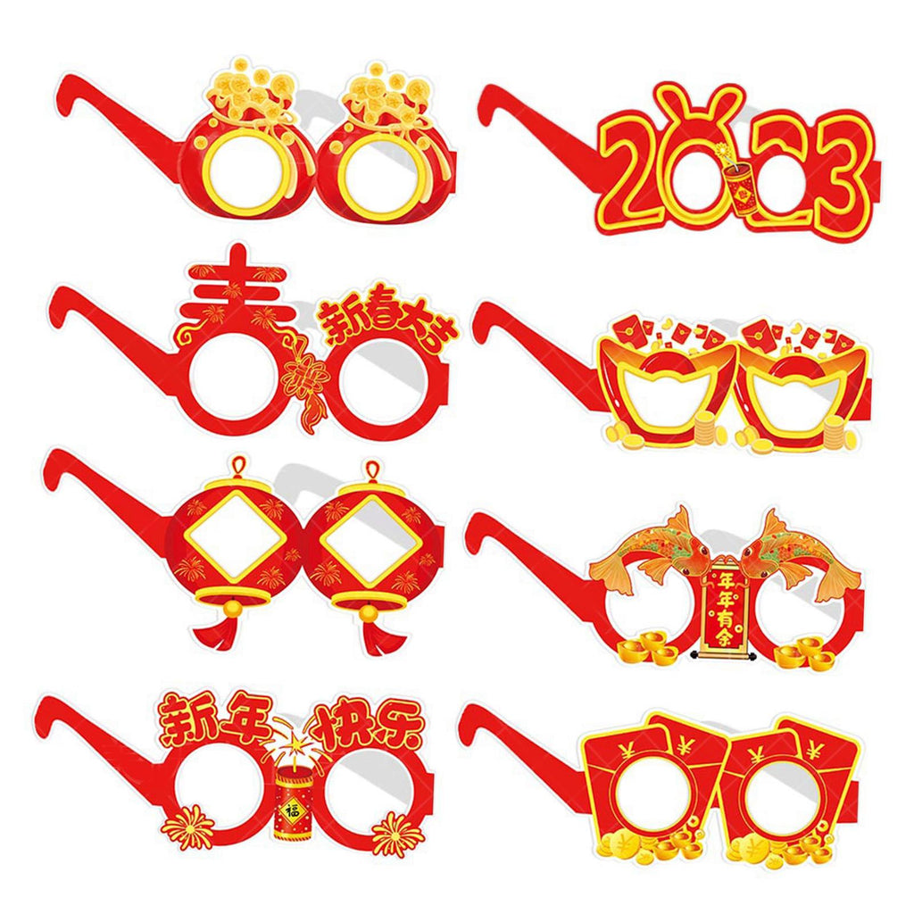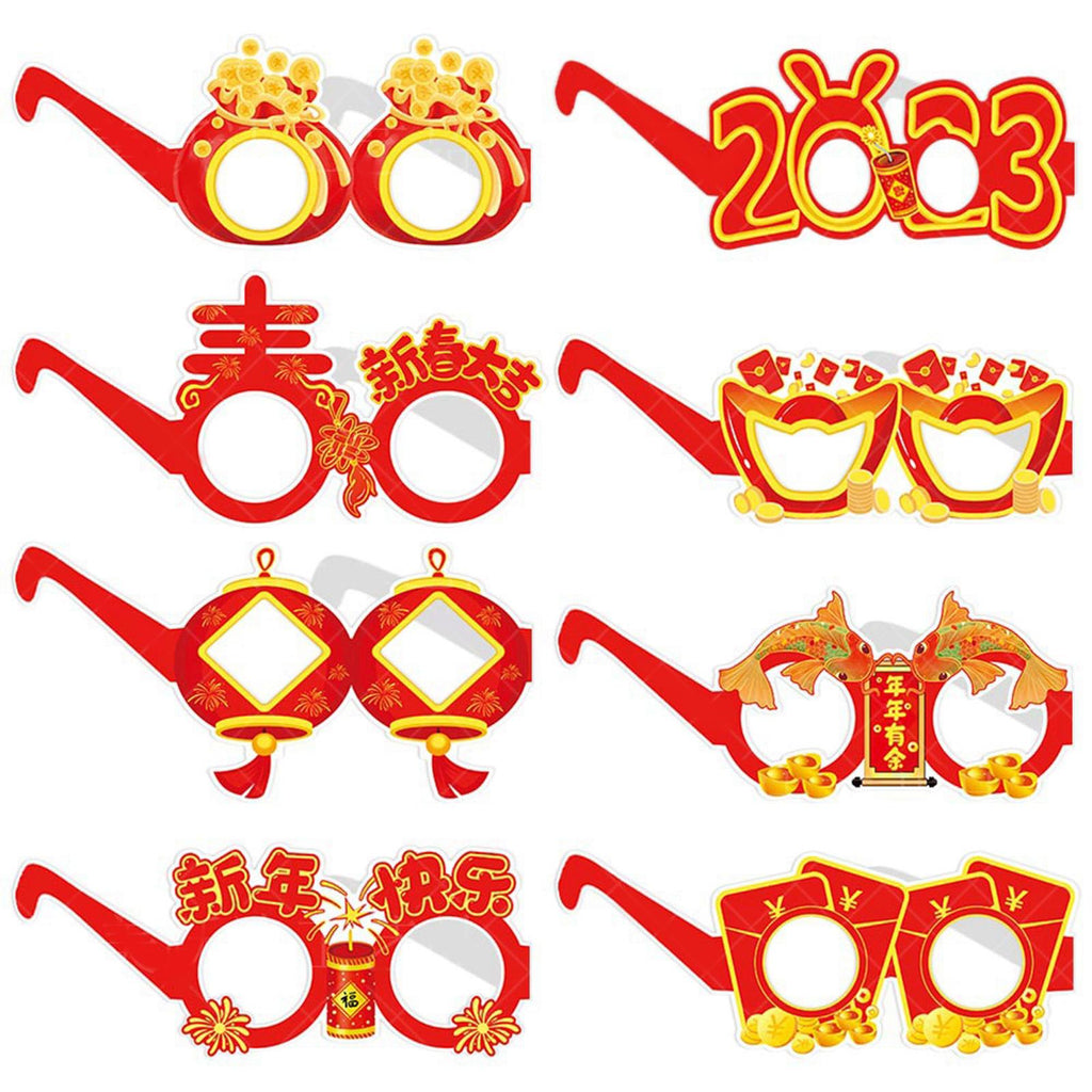 - Happy New Year glasses: 2023 photo props, New Year decorations, paper Spring Festival photo glasses. Wear them with your New Year's Eve party outfits to celebrate the arrival of the new year 2023, look festive and be the center of attention in no time