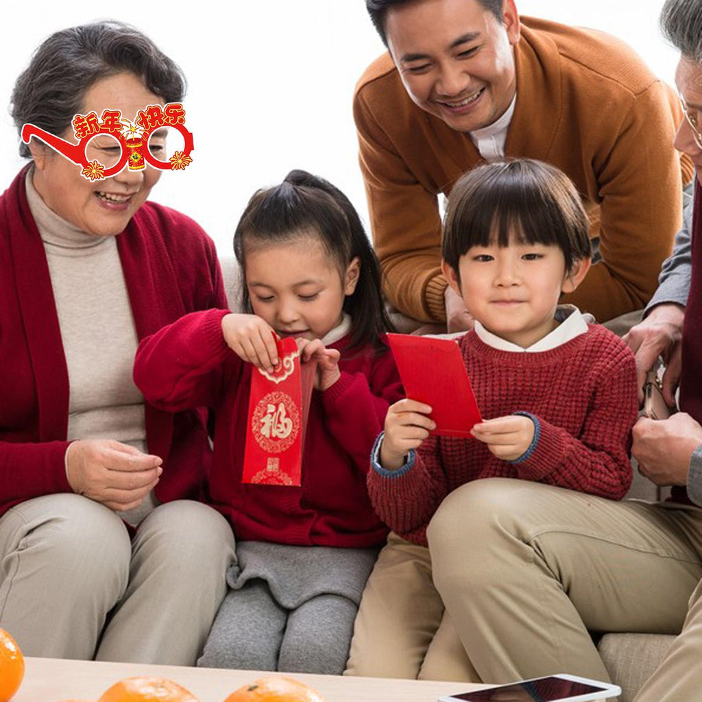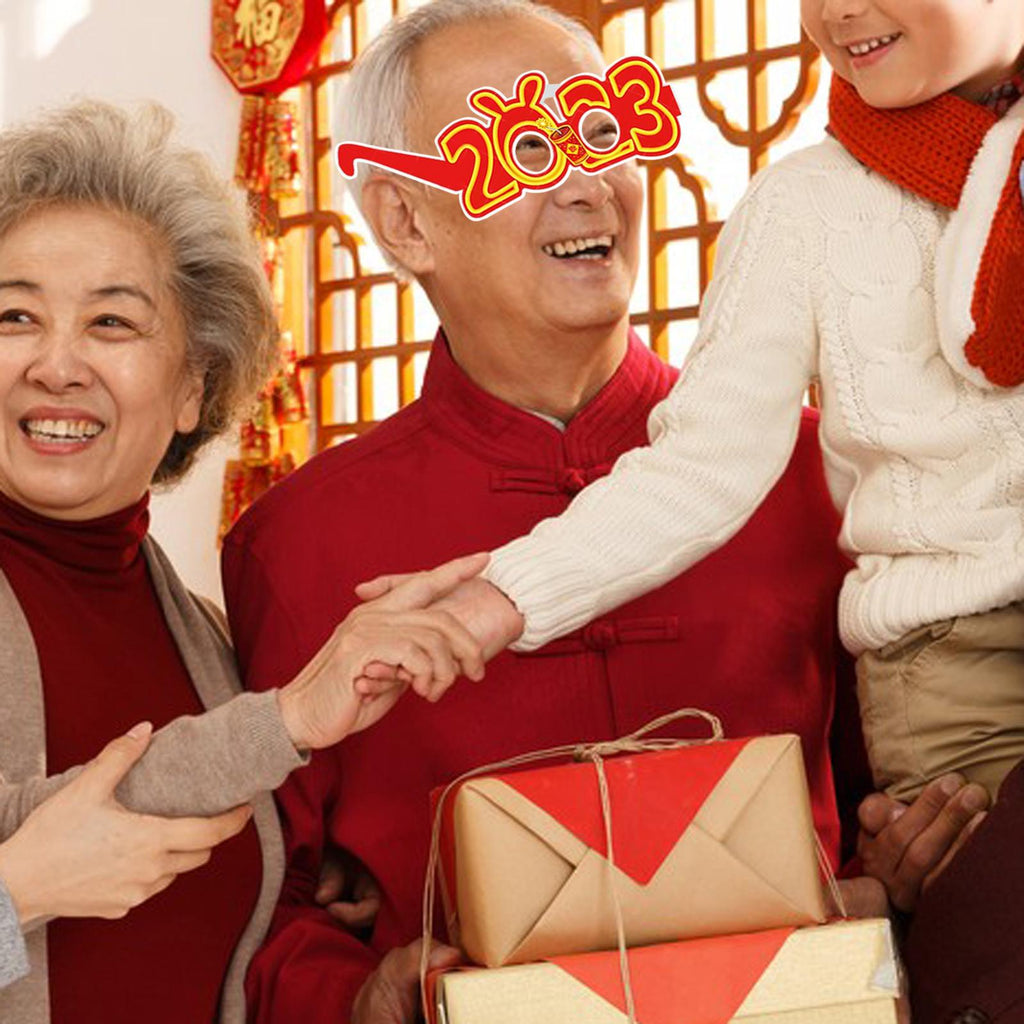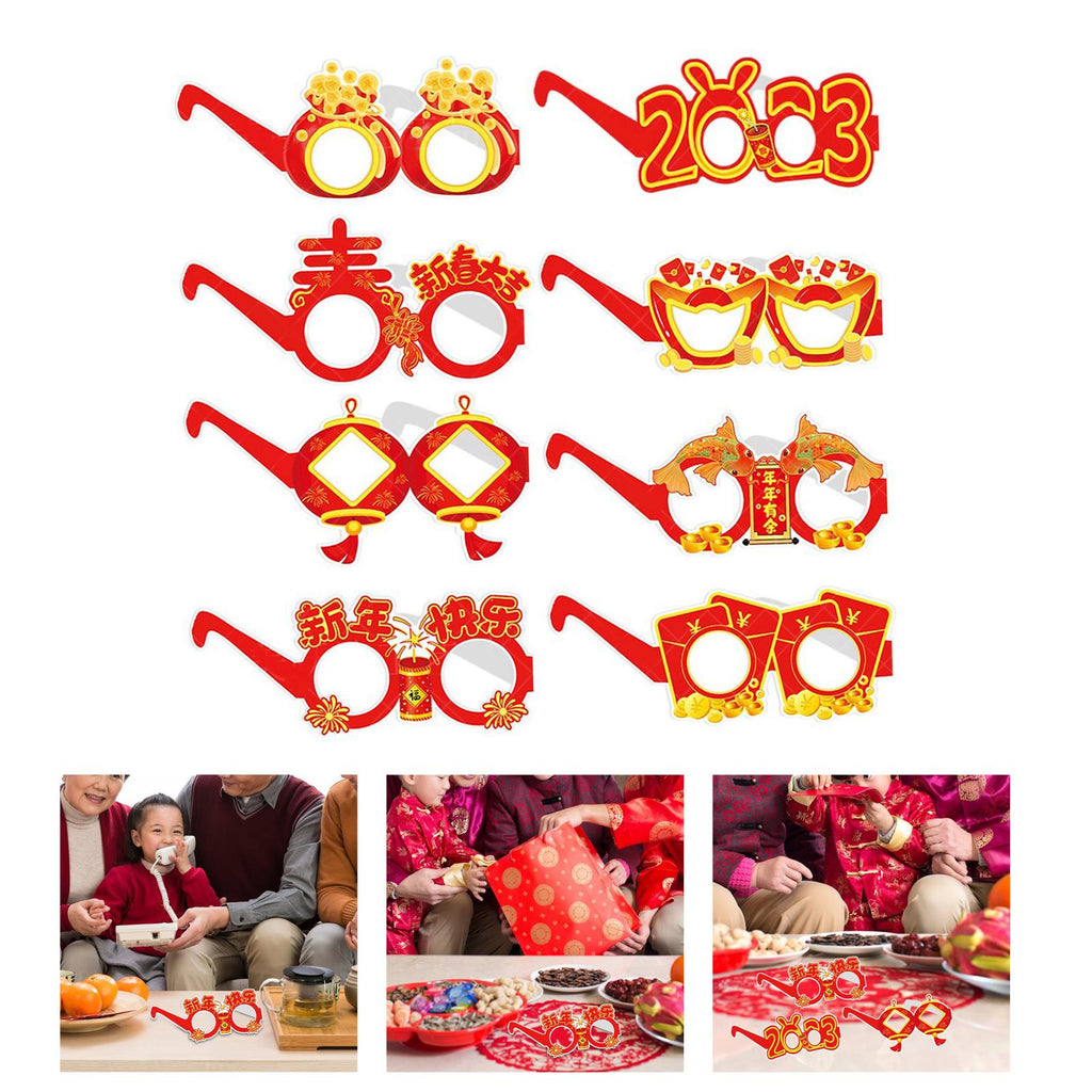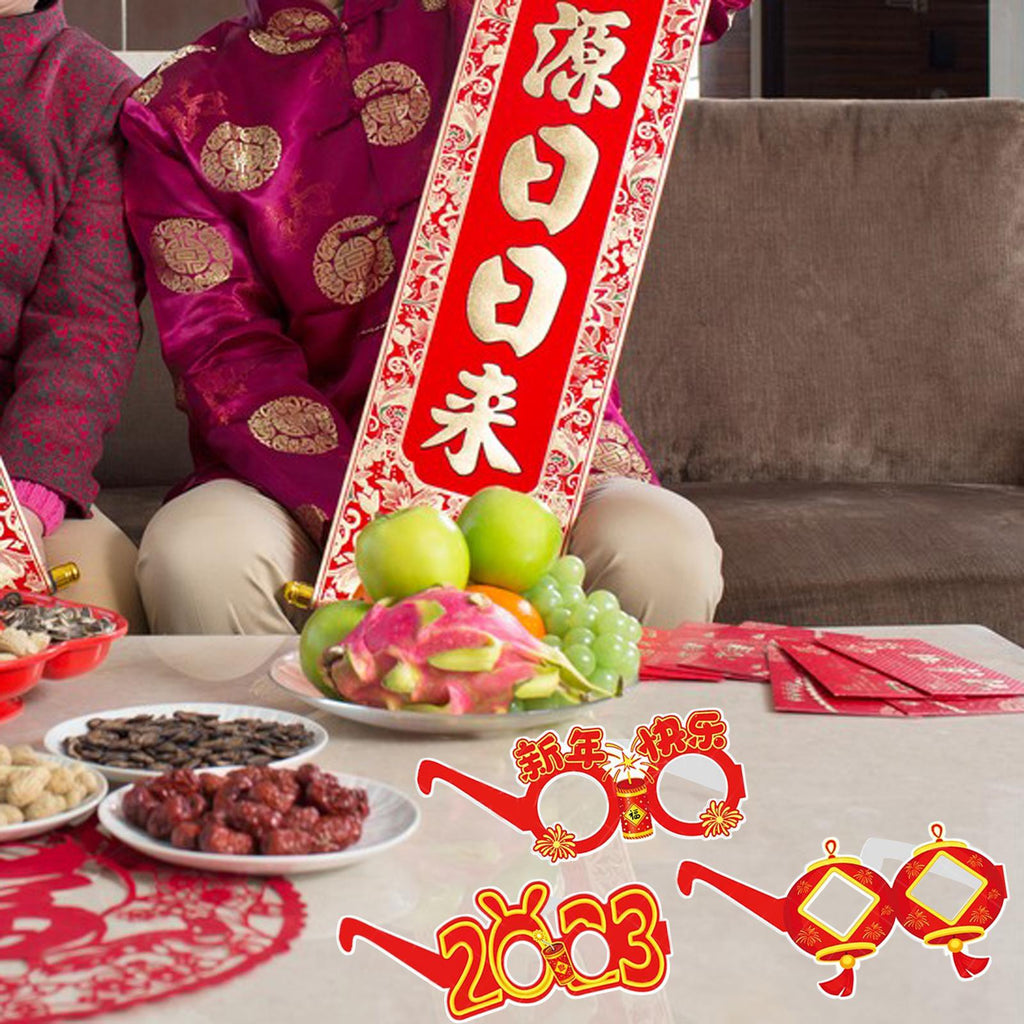 - Happy New Year glasses: 2023 photo props, New Year decorations, paper Spring Festival photo glasses. Wear them with your New Year's Eve party outfits to celebrate the arrival of the new year 2023, look festive and be the center of attention in no time