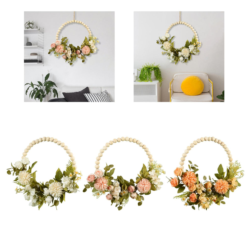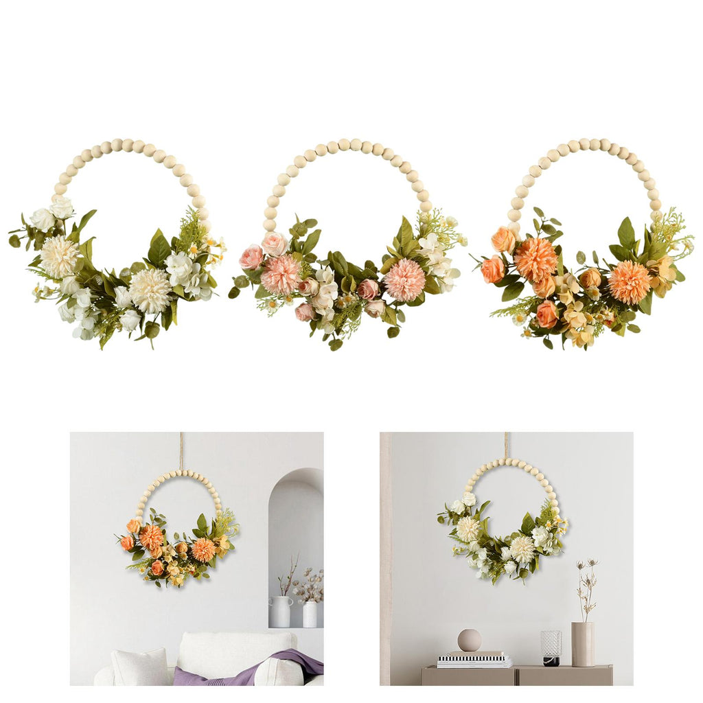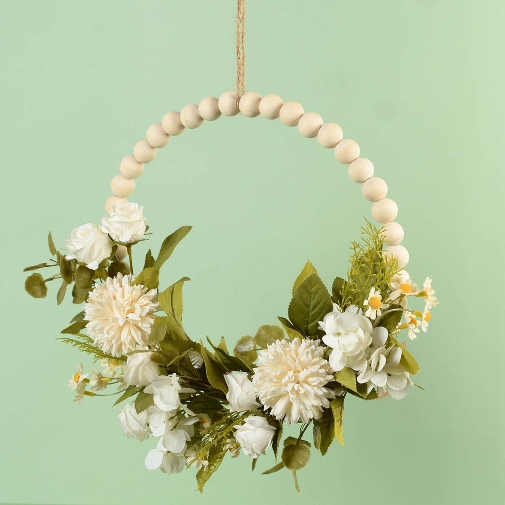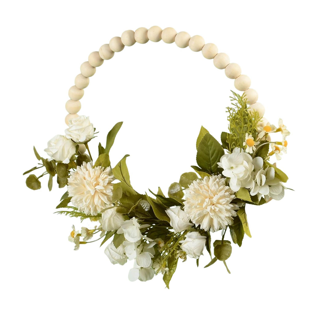 Maxbell Artificial Flower Wreath Garland Door Hanging Wooden Beads Hoop Decor White