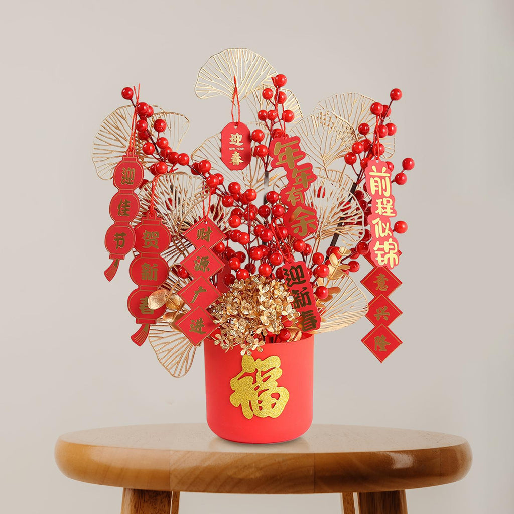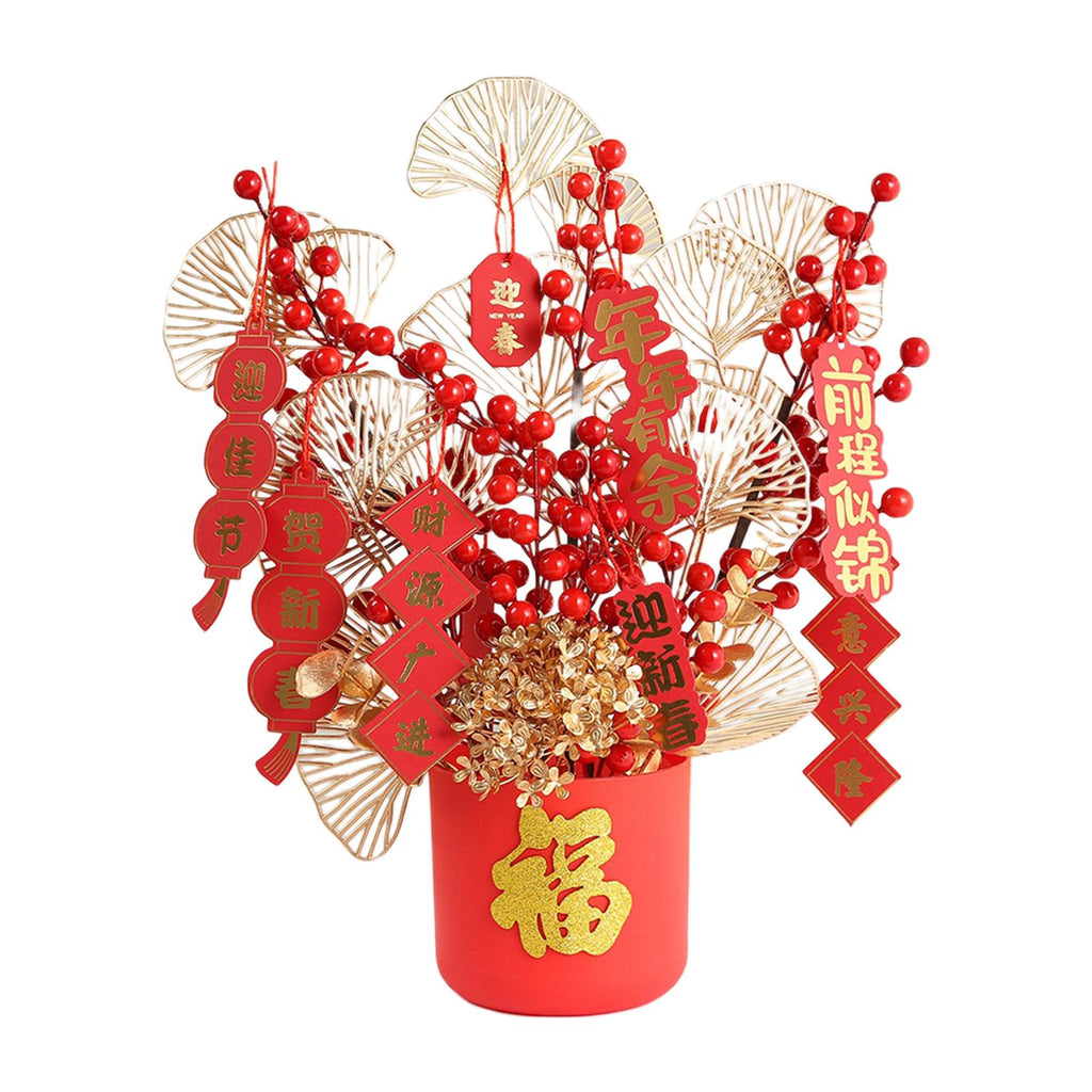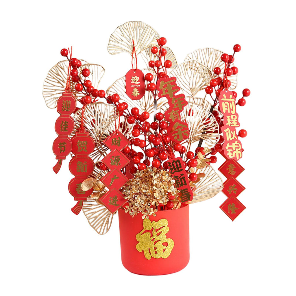 Design: Red Artificial Berries and Aureate Leaves Branches Bouquet Chinese New Year Decoration Ornaments, with lucky character hanging pendants.