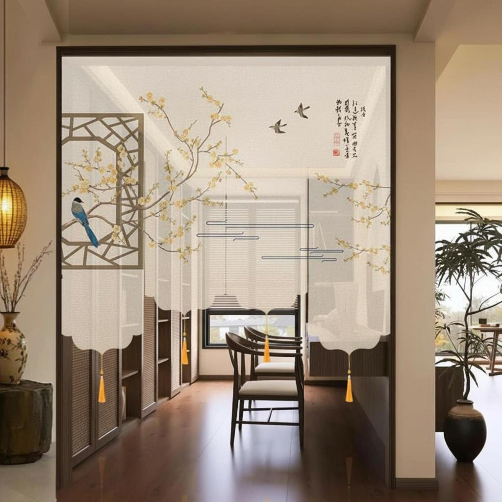【Elegant Chinese Ink Painting Doorway Curtain】This new Chinese design curtain features flower and avian motifs, perfect for enhancing privacy and adding artistic elegance to living rooms, studies, tea rooms, and entryways.【No-Drill Easy Installation】Designed for hassle hanging, this curtain can be installed without making it suitable for both renters and homeowners.【Adaptable Room Divider and Decor】perfect for use as a room divider, privacy screen, or decorative tapestry in various spaces like bedrooms, offices, and hallways.【High-Quality Soft Fabric】Made from soft fabric, this curtain is resilient and gentle to the feel, ensuring long use and easy maintenance.【Functional and Stylish】Blending practicality with refined design, this curtain offers privacy, light filtering, and a sophisticated decorative feel to modern homes.