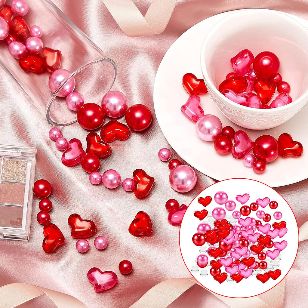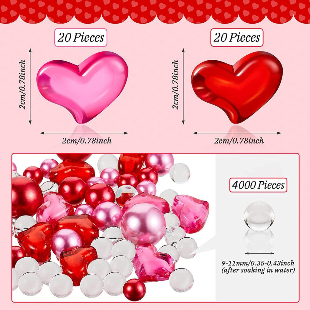 Package: 20 pieces pink heart, 20 pieces red heart, 4000 pieces jelly bead, 4 pieces 20mm pink bead, 4 pieces 20mm red bead, 8 pieces 14mm pink bead, 8 pieces 14mm red bead, 10 pieces 10mm red bead, 10 pieces 10mm pink bead. Sufficient quantity allows you to create a heavy festival atmosphere.