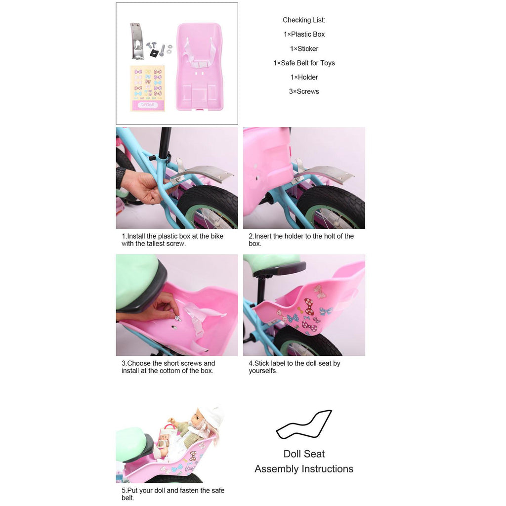 USAGE: Install the box with the tallest screw. Insert the holder to the holt of the box. Choose the short screws and install at the cottom of the box. Attach label to the doll seat. Put your doll, fasten the belt.