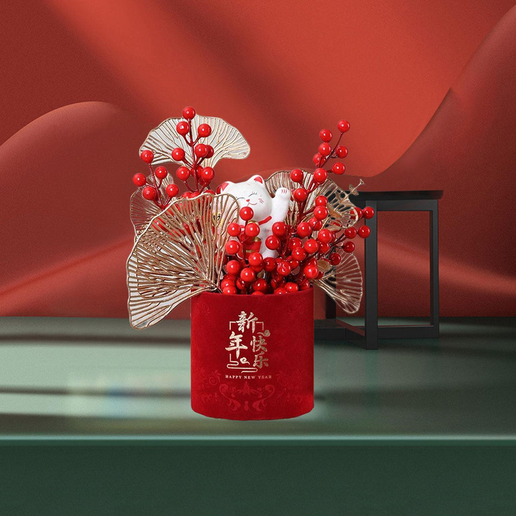 Design: Red Artificial Berries and Aureate Branches Bouquet Chinese New Year Decoration Ornaments, with lucky hanging pendants, adding a festive atmosphere.