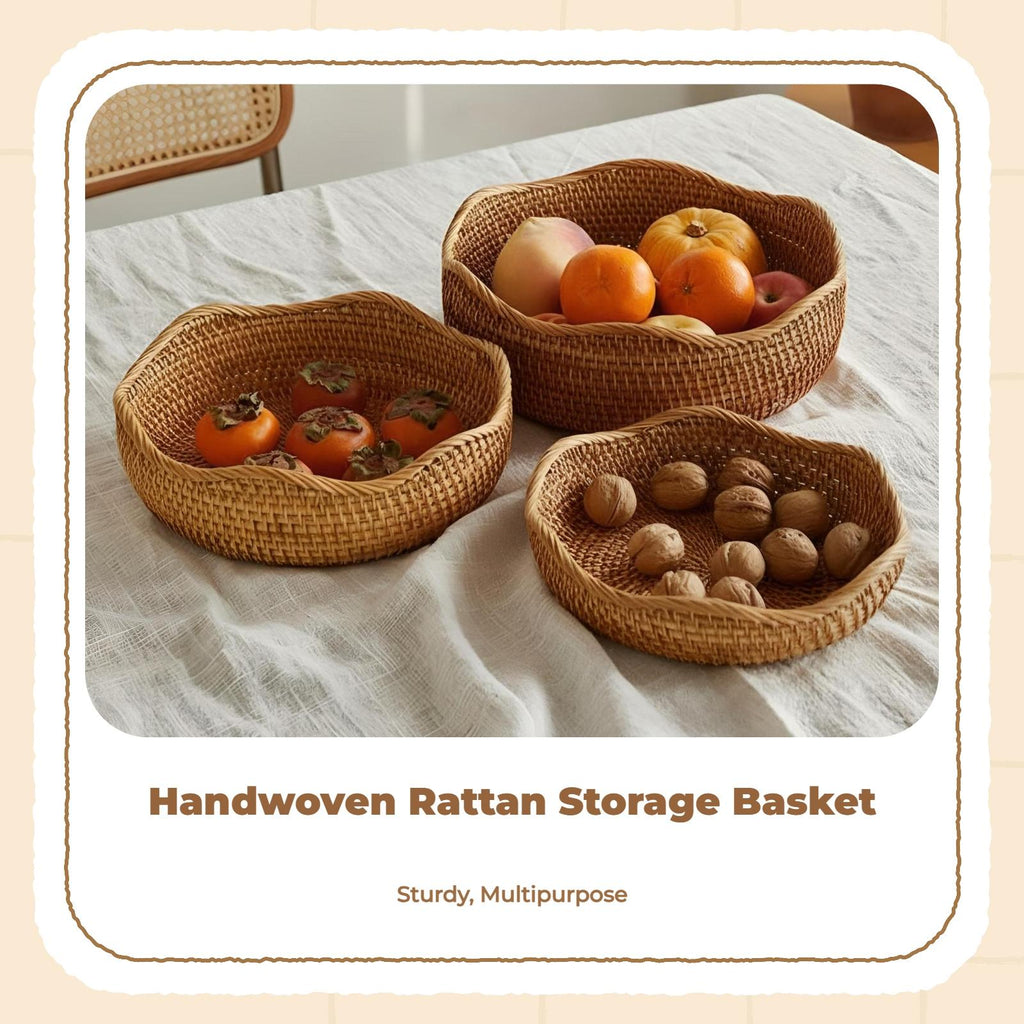 【Adaptable Hand-Woven Rattan Basket】This woven basket is perfect for stylish storage and serving food in the kitchen, living room, or dining area, effortlessly complementing boho décor and modern home styles.【High-Quality Craftsmanship】Expertly hand-woven from resilient rattan, this basket features a sturdy construction and lightweight design suitable for commonplace use.【Practical and Multi-Functional】perfect for organizing fruits, bread, snacks, or serving as a decorative accent on coffee tables, countertops, or pantries.【Strong Usability】The basket’s sturdy build and meticulous weaving ensure its reliability for collecting, harvesting, or carrying groceries and produce.【Cost-Effective】Made from high-quality materials, this basket offers an affordable solution for home organization and food storage.Specification: