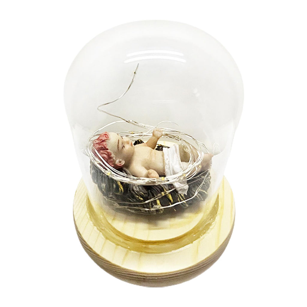 With LEDs and Glass Cover: This Infant Jesus in glass cover is wrapped around LEDs for nativity scene switch button in bottom, powered 3 AAA battery(not included)