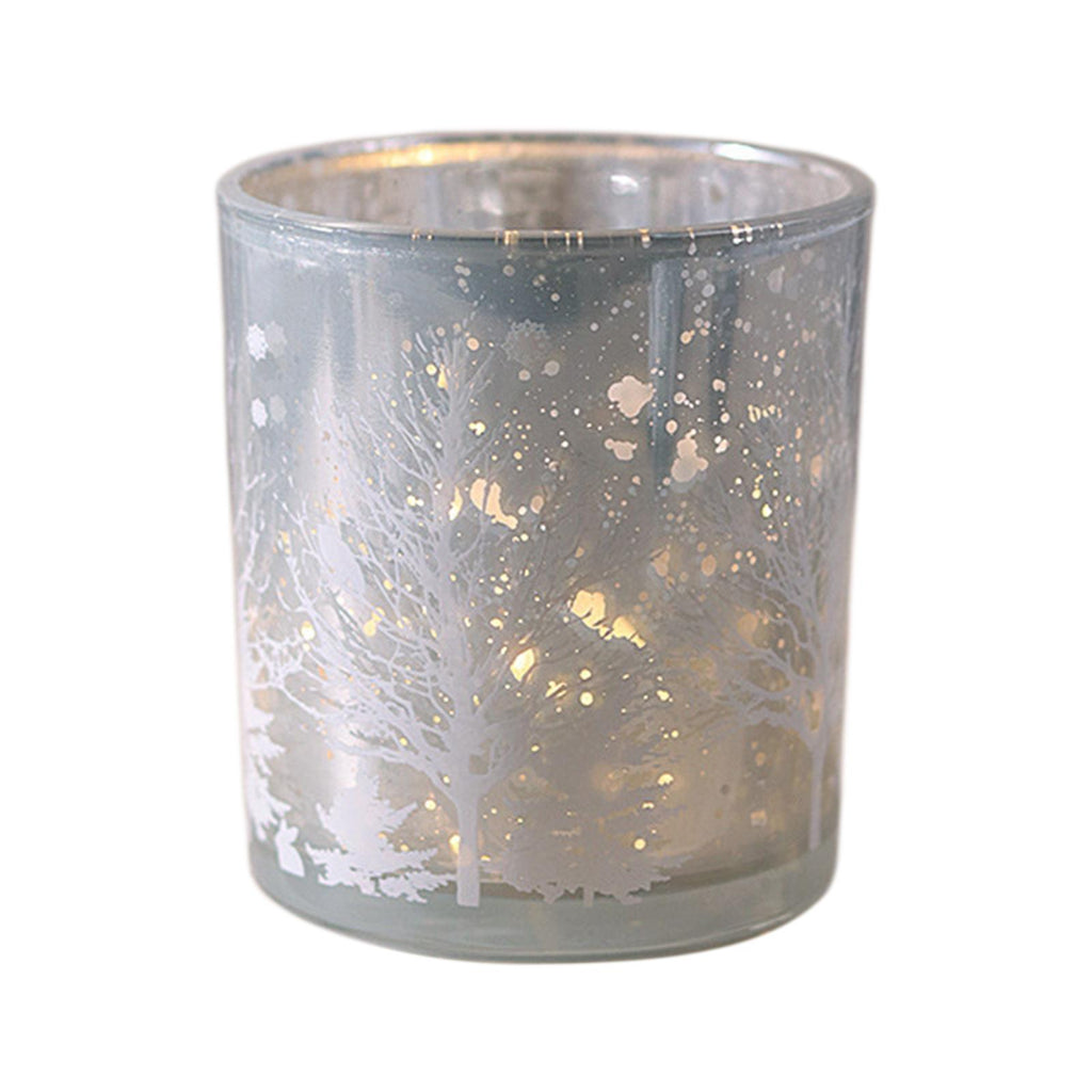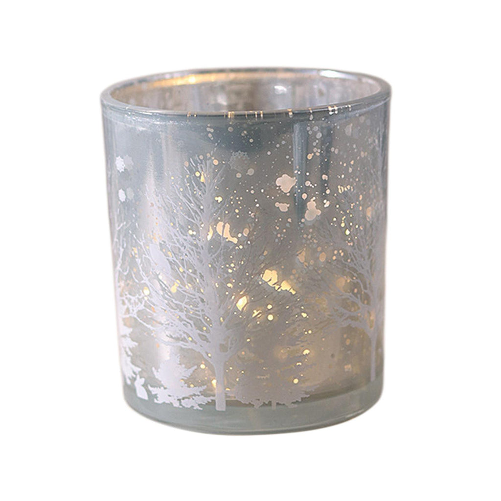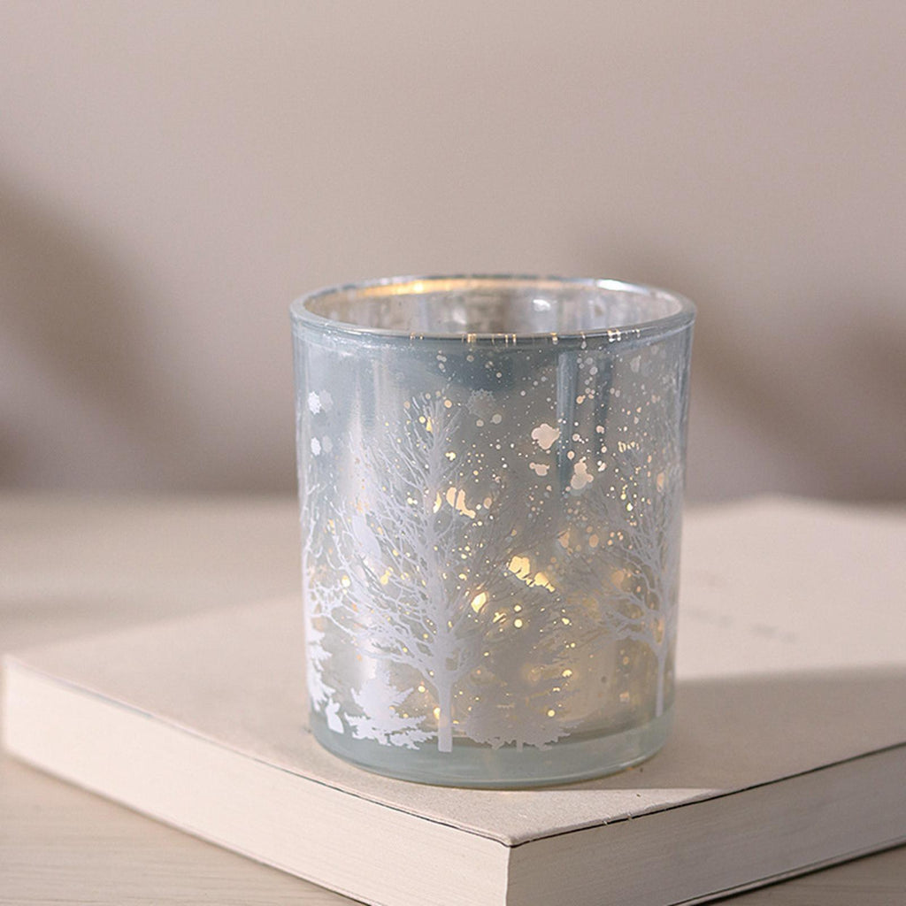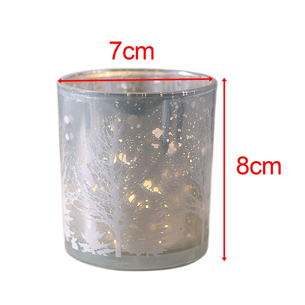 Design: The tealight candles holder is a cup shape, with a tree pattern, when put candles are, it creates a warm atmosphere of snow in winter.