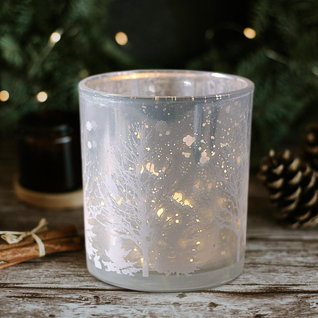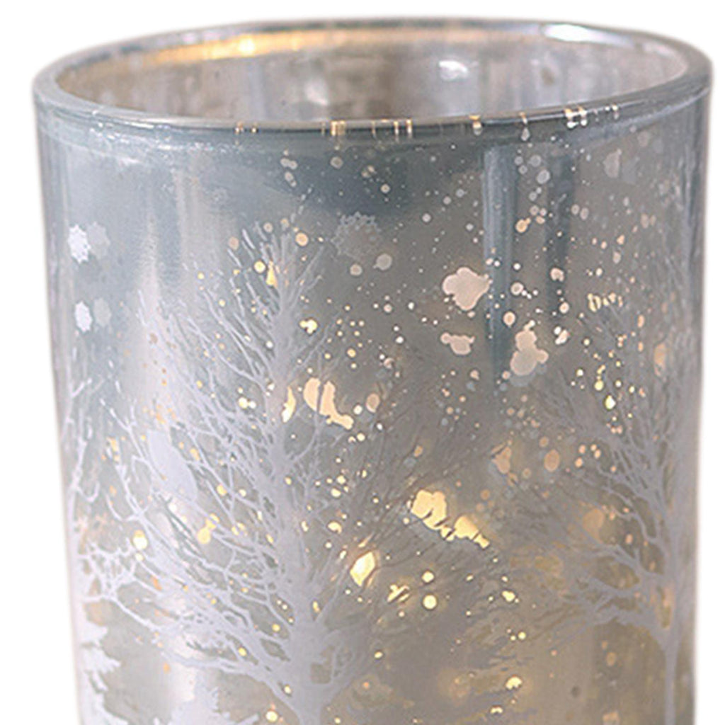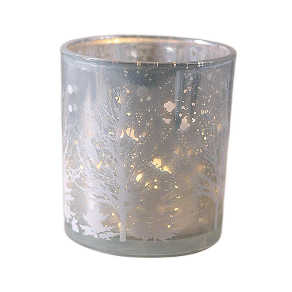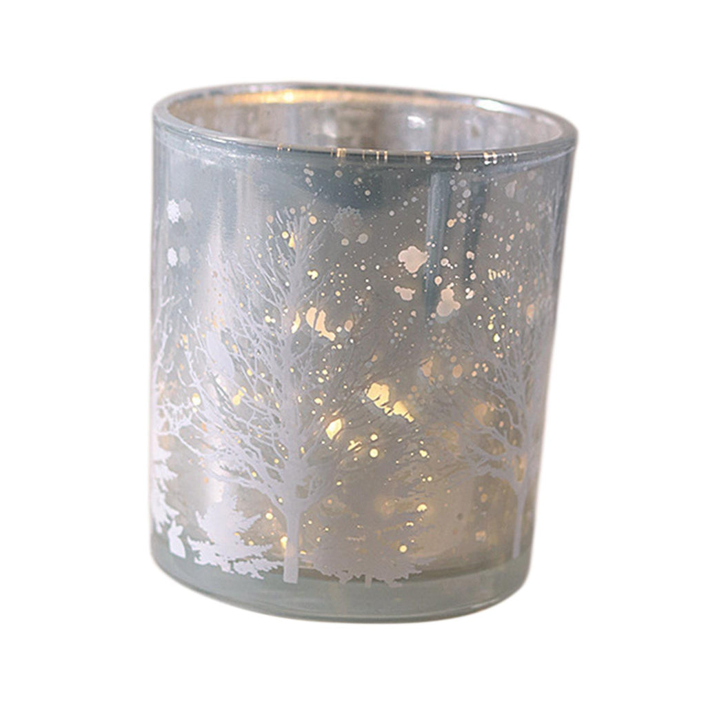 Design: The tealight candles holder is a cup shape, with a tree pattern, when put candles are, it creates a warm atmosphere of snow in winter.