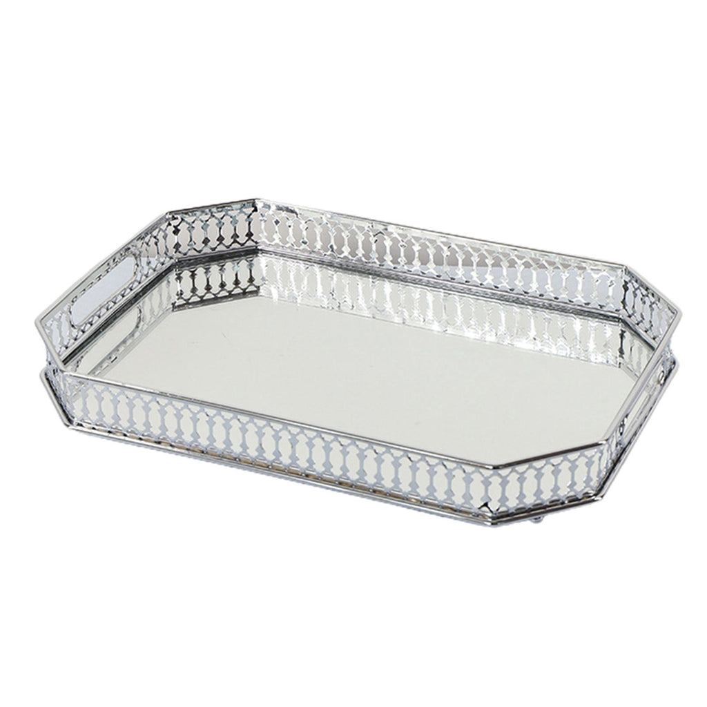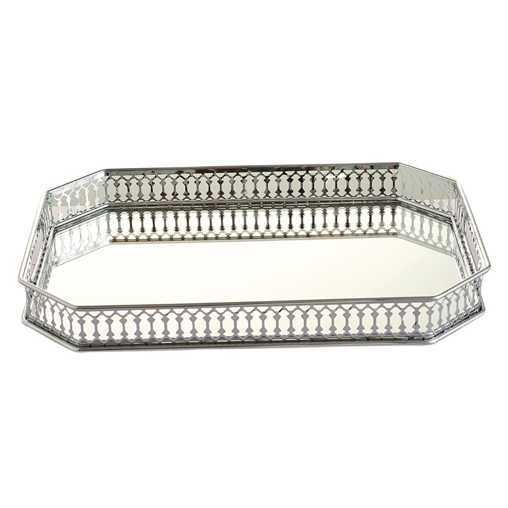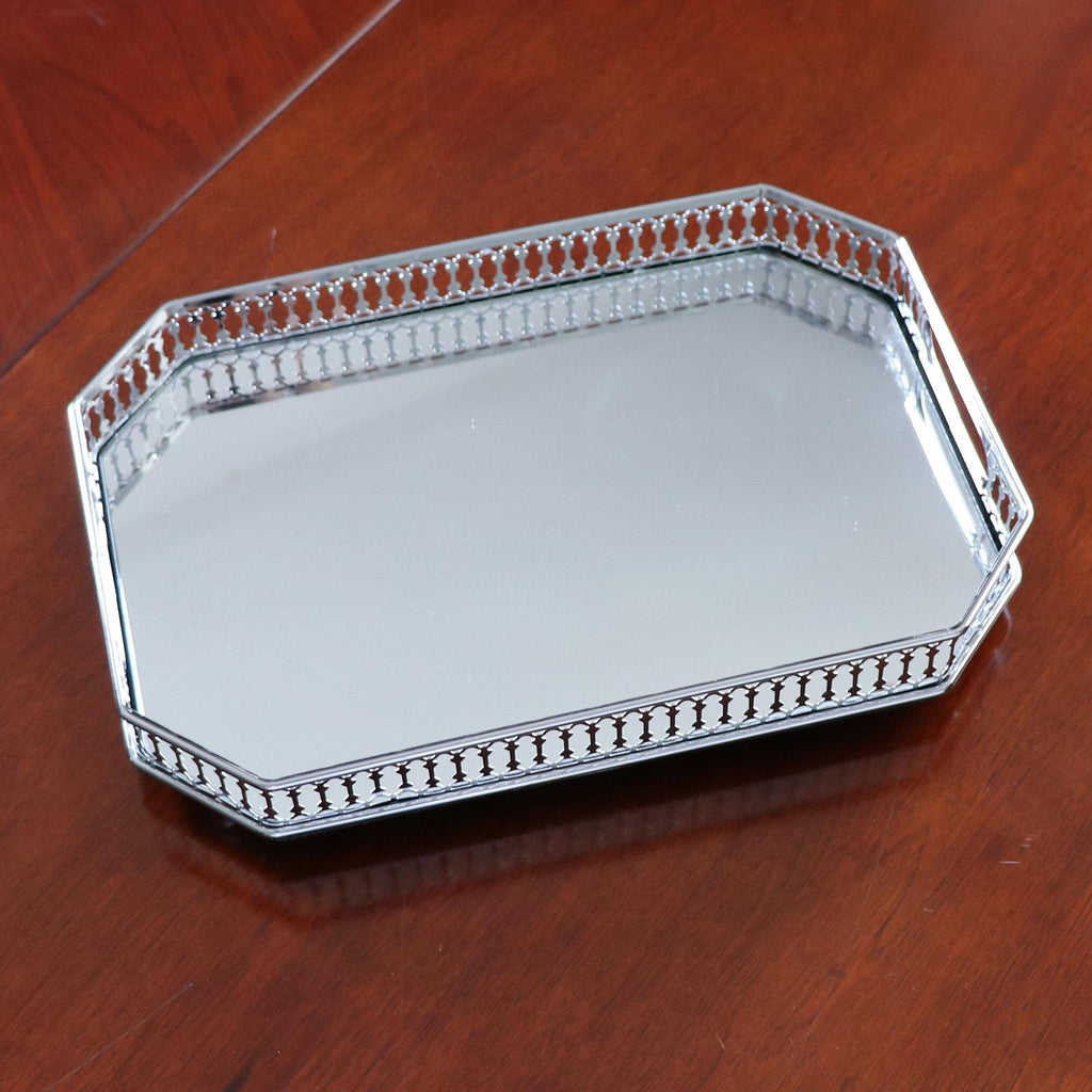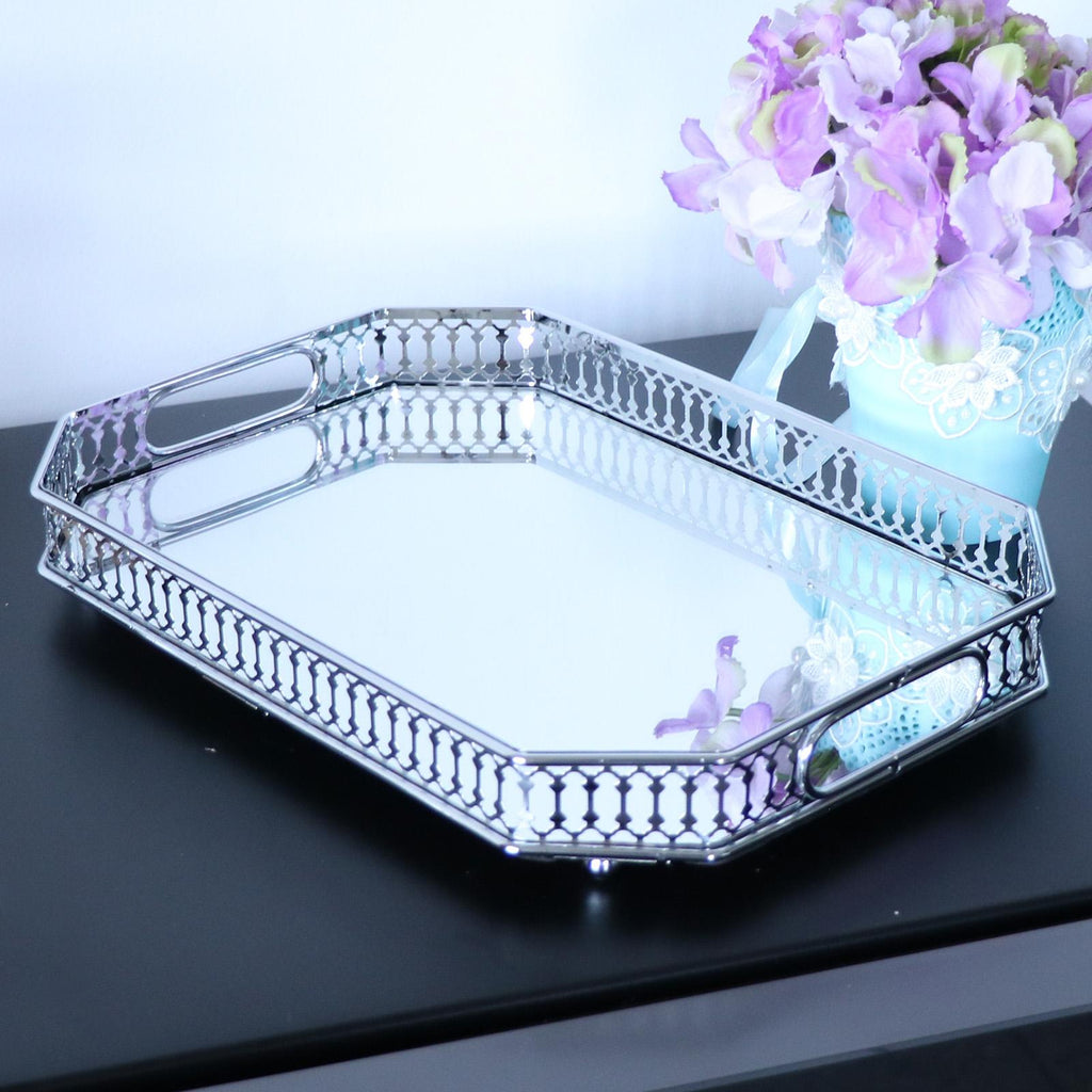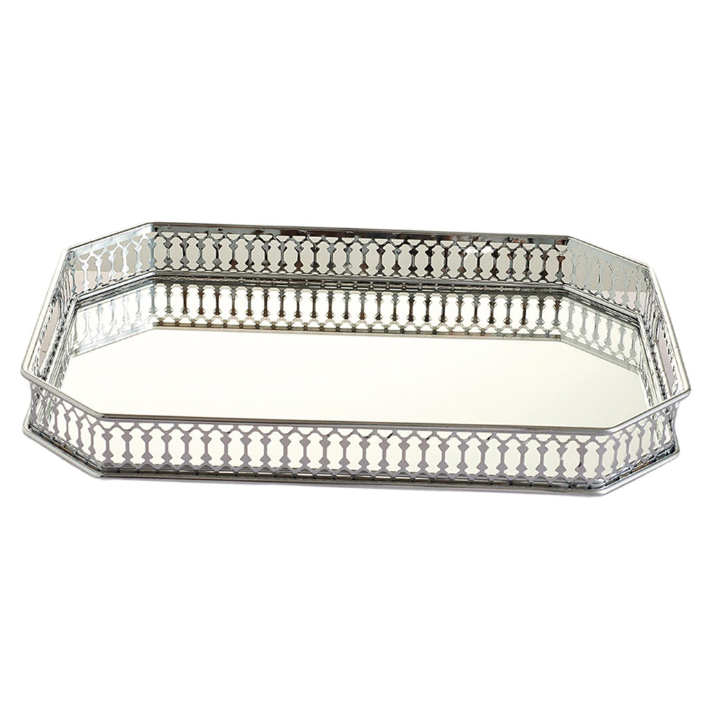 Features a mirror bottom and silver finish design, perfect metal decorative tray, perfume organizer.