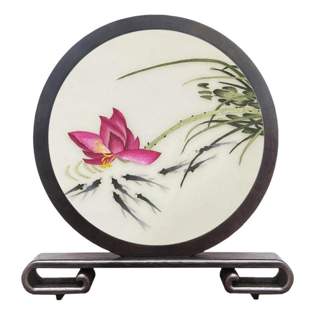Silk Embroidery Table Screen, Double-Sided Hand-Embroidered Decoration, Chinese Decorative Gift Lotus Fish Wenge