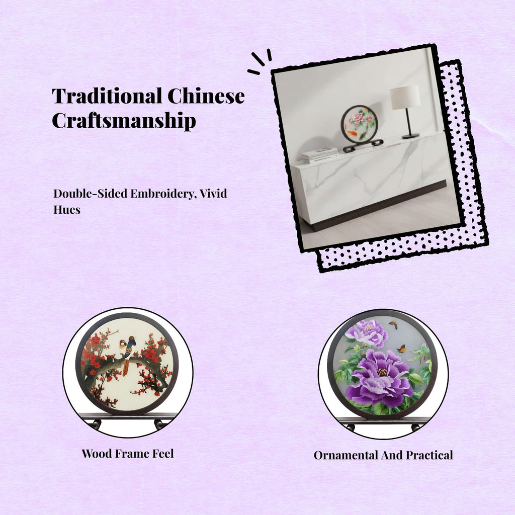 【Elegant Silk Embroidery Table Screen for Home and Office】This double-sided hand-embroidered decoration showcases craftsmanship, making it a tasteful addition to your home, office, or a distinctive collectible gift.【Handmade Craftsmanship】Each table screen is carefully handmade with silk threads, reflecting the refined elegance of traditional Chinese embroidery art and intangible cultural legacy.【Adaptable Decorative Purpose】perfect for living rooms, offices, or as a distinctive gift for friends and colleagues, this piece infuses any space with a suggestion of Chinese aesthetics.【Practical and Thoughtful Gift】A perfect choice for special events such as housewarmings or as a memorable souvenir for friends around the world, offering both practicality and cultural significance.【Sturdy and High-Quality Materials】Made with silk and wood, this table screen is built for elegance and enduring value.Specification: