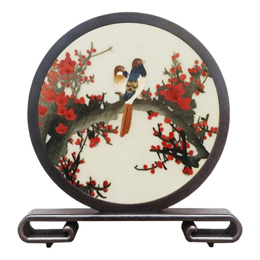 Silk Embroidery Table Screen, Double-Sided Hand-Embroidered Decoration, Chinese Decorative Gift Plum Bird Wenge