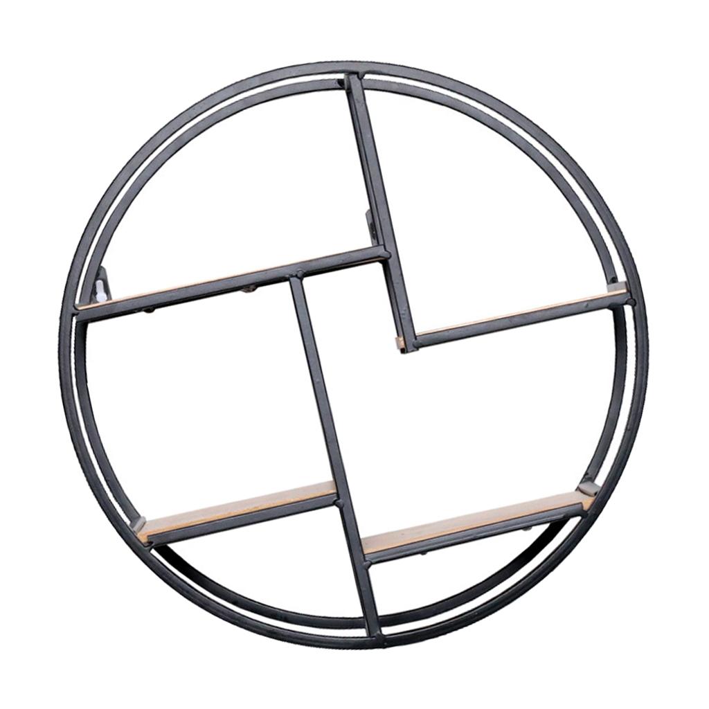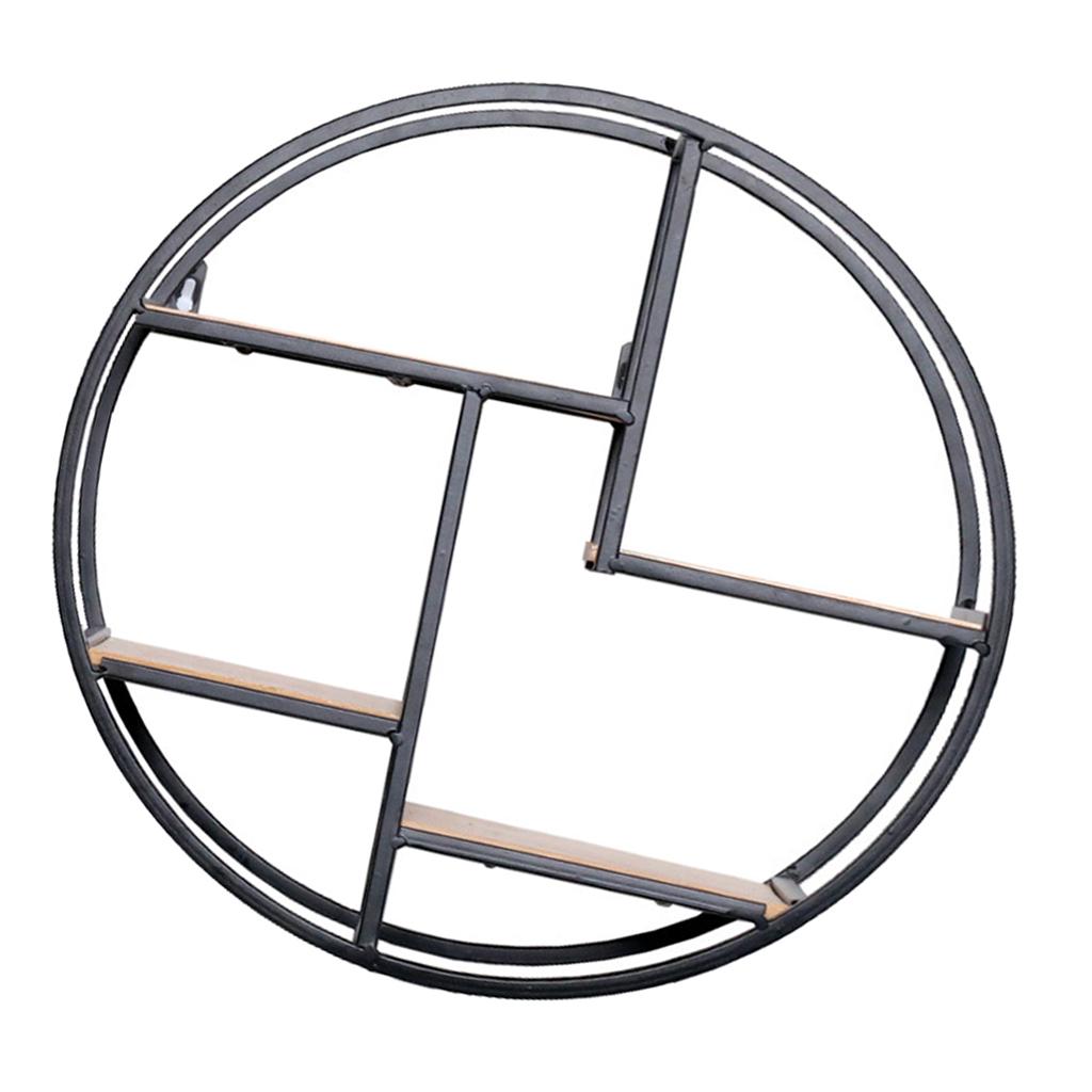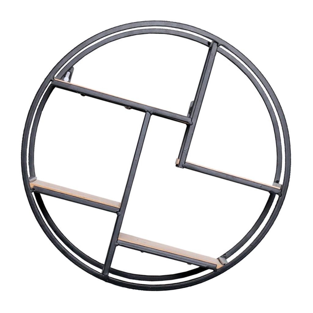 Wall-mounted decorative shelf with circular metal frame and wood planks.