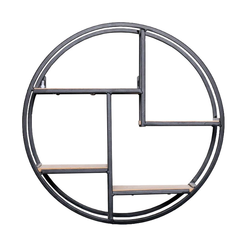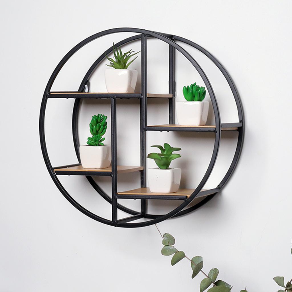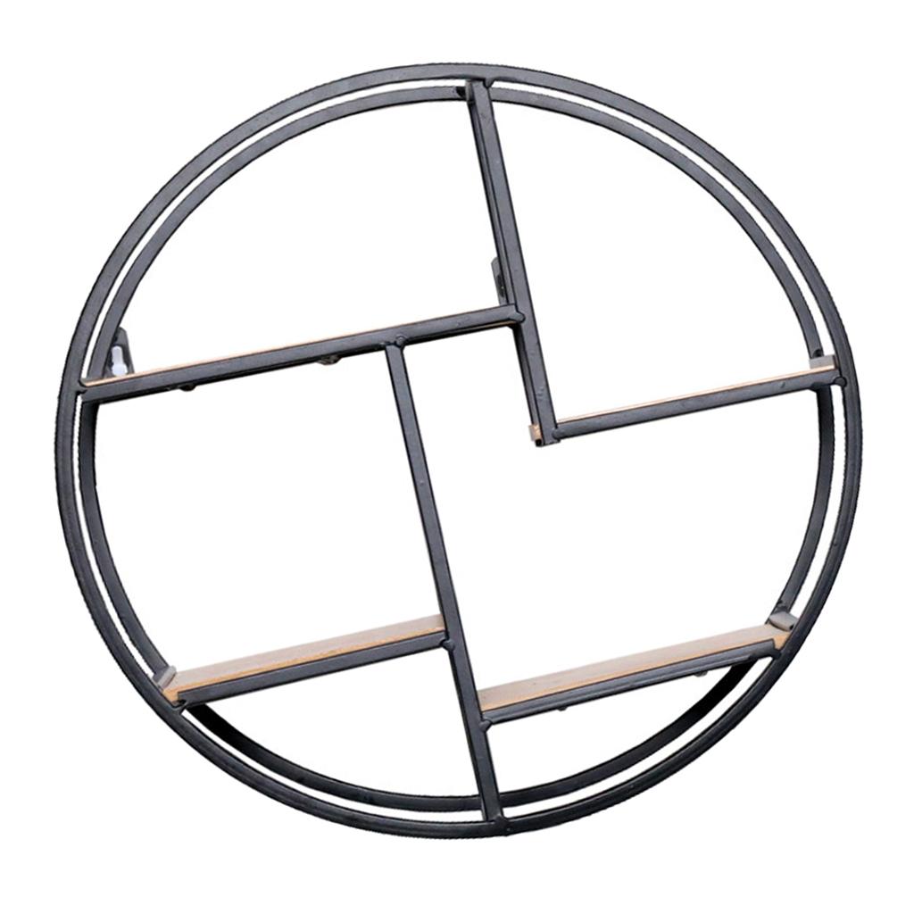 Wall-mounted decorative shelf with circular metal frame and wood planks.