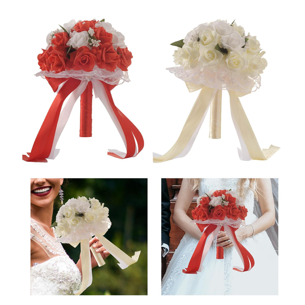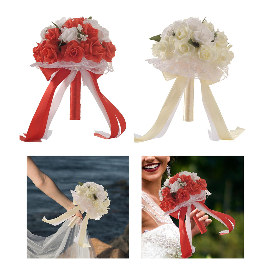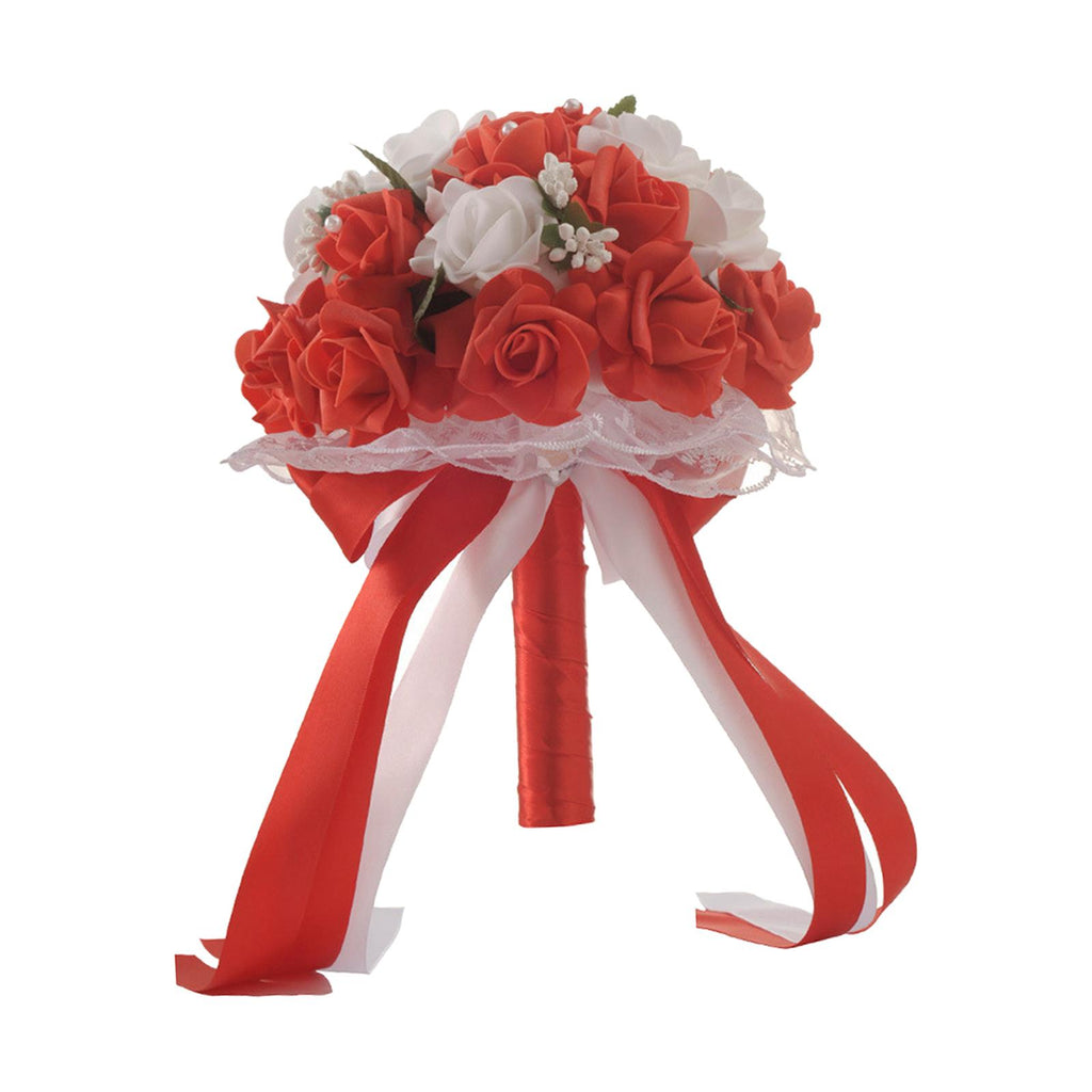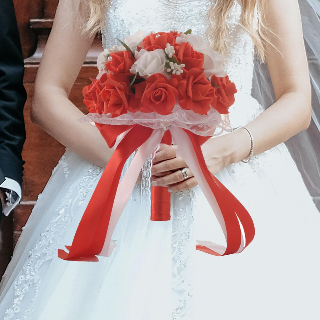 Maxbell Wedding Bride Bouquet with Silk Ribbon for Anniversary Church Decoration Red