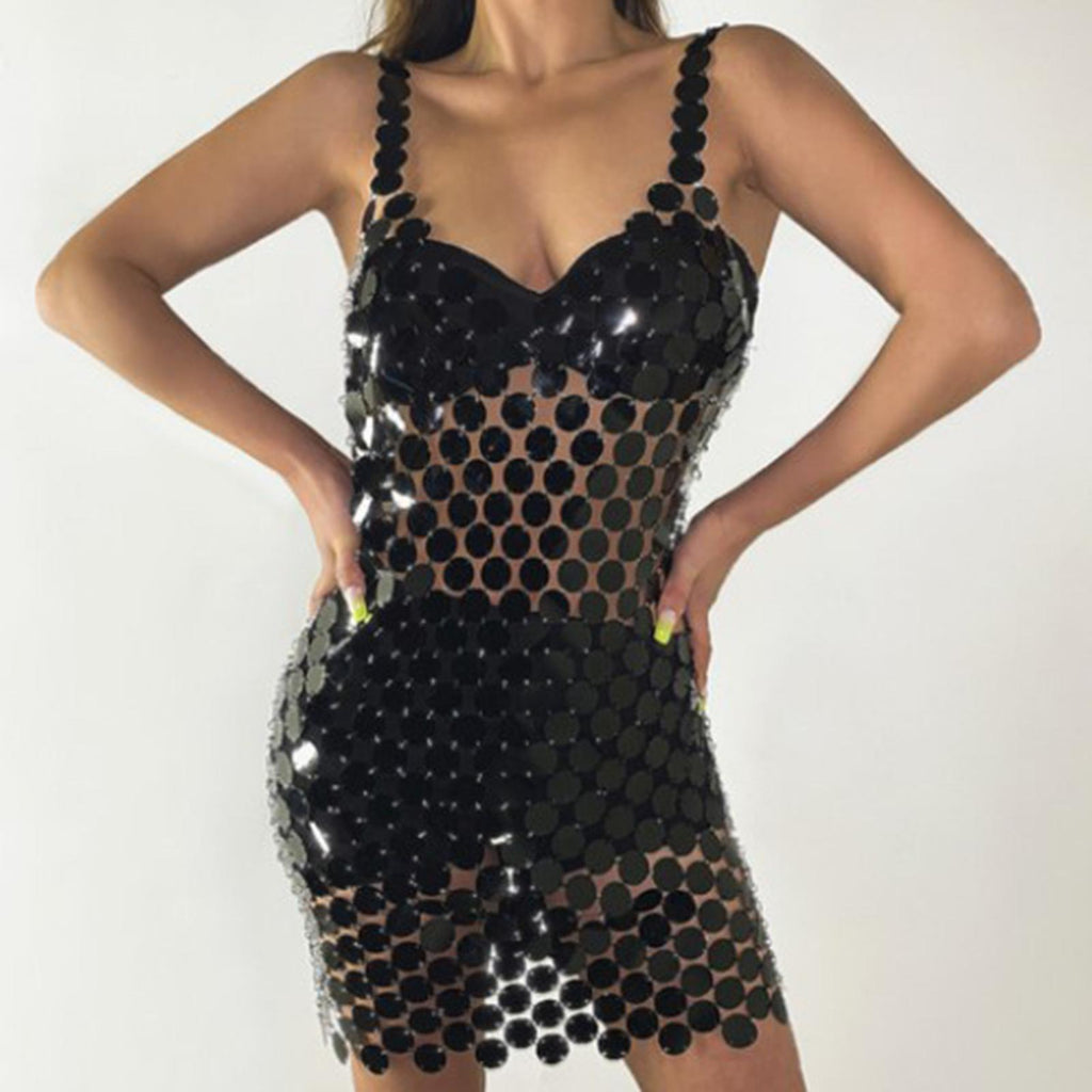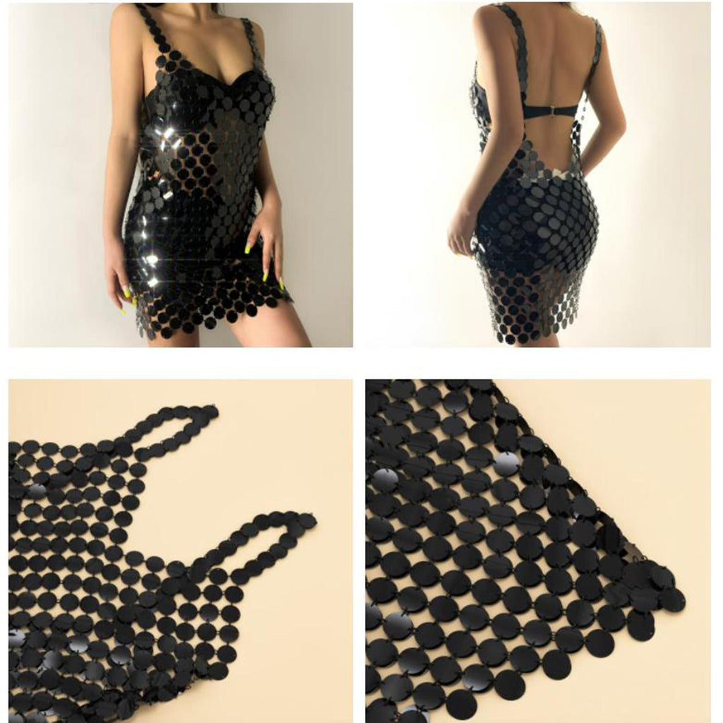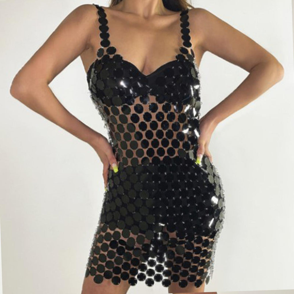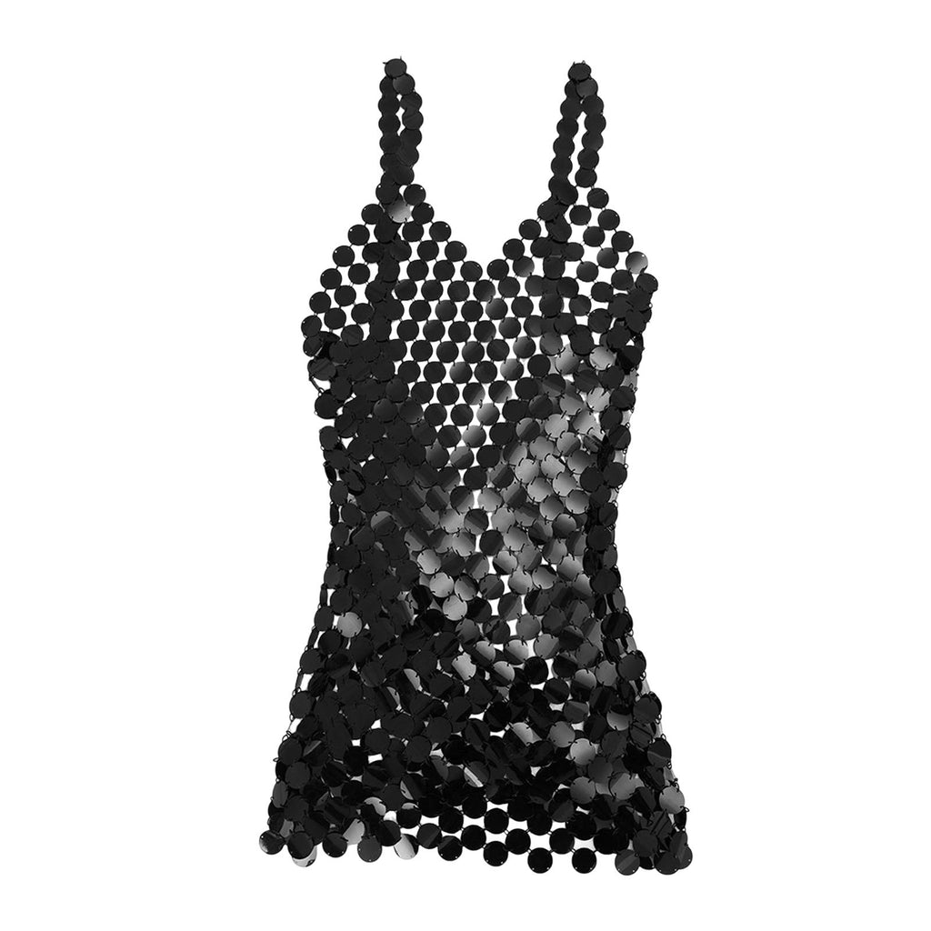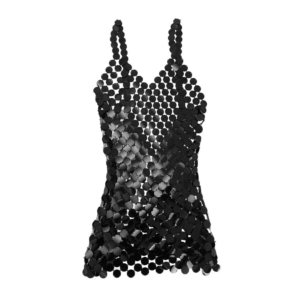 Maxbell Women Sequined Spaghetti Straps Dress Sequin Decorative Open Back for Club Black