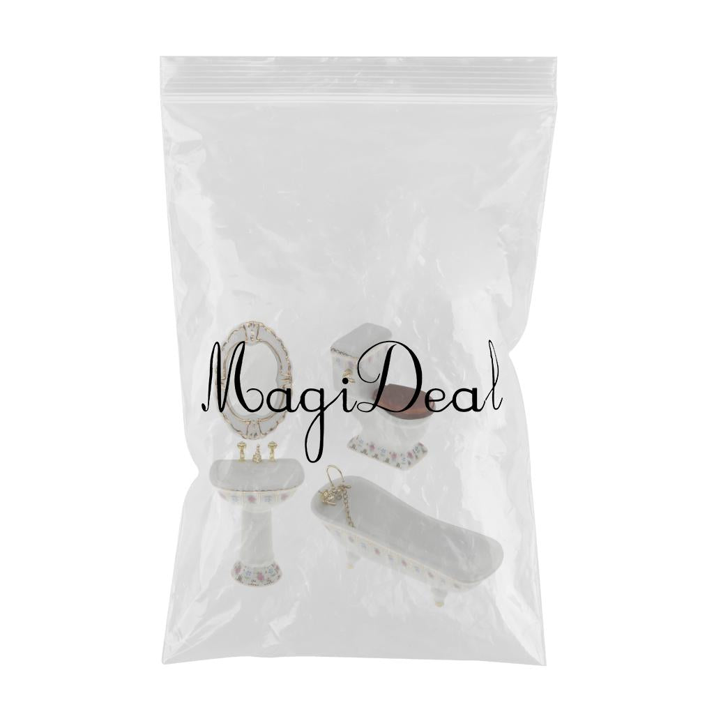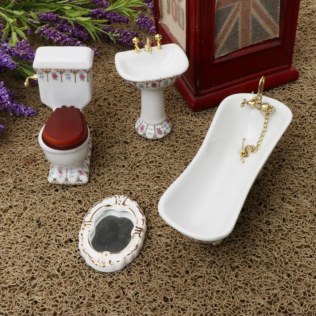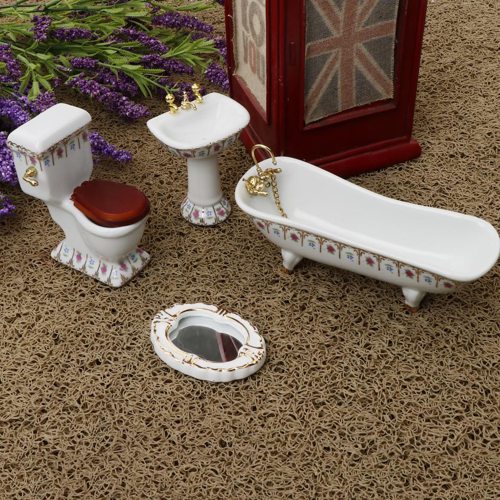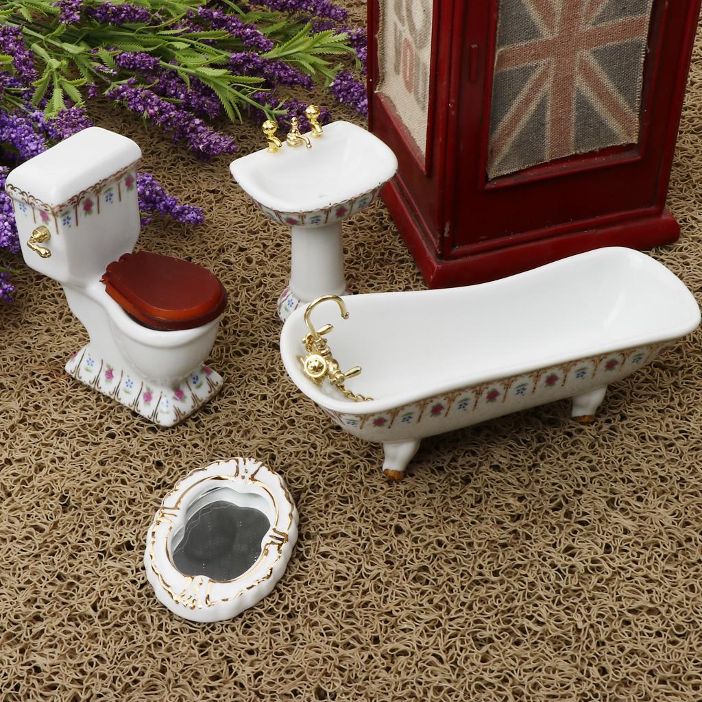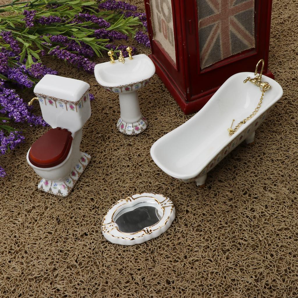 Include toliet, bathtub, hand sink and mirror with flower for dollhouse furniture decoration