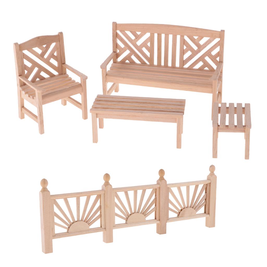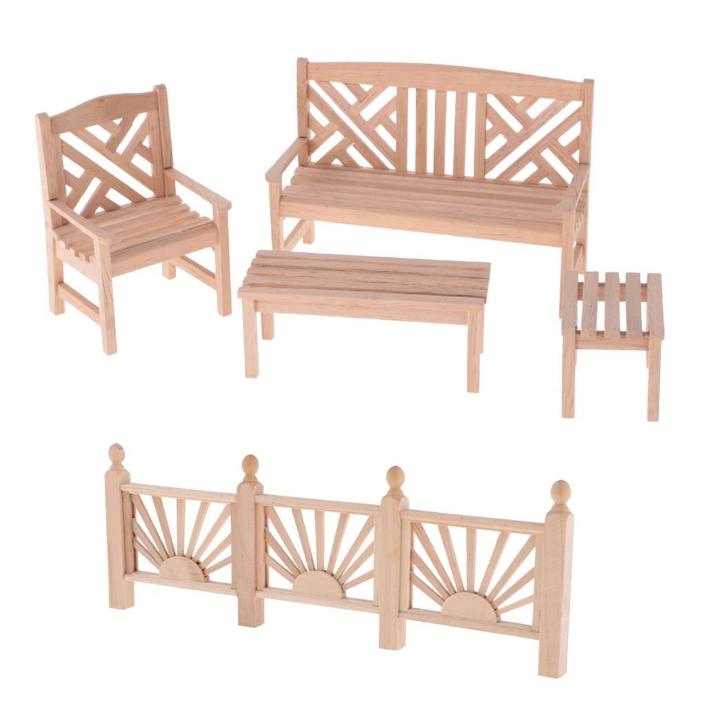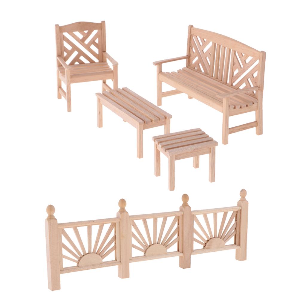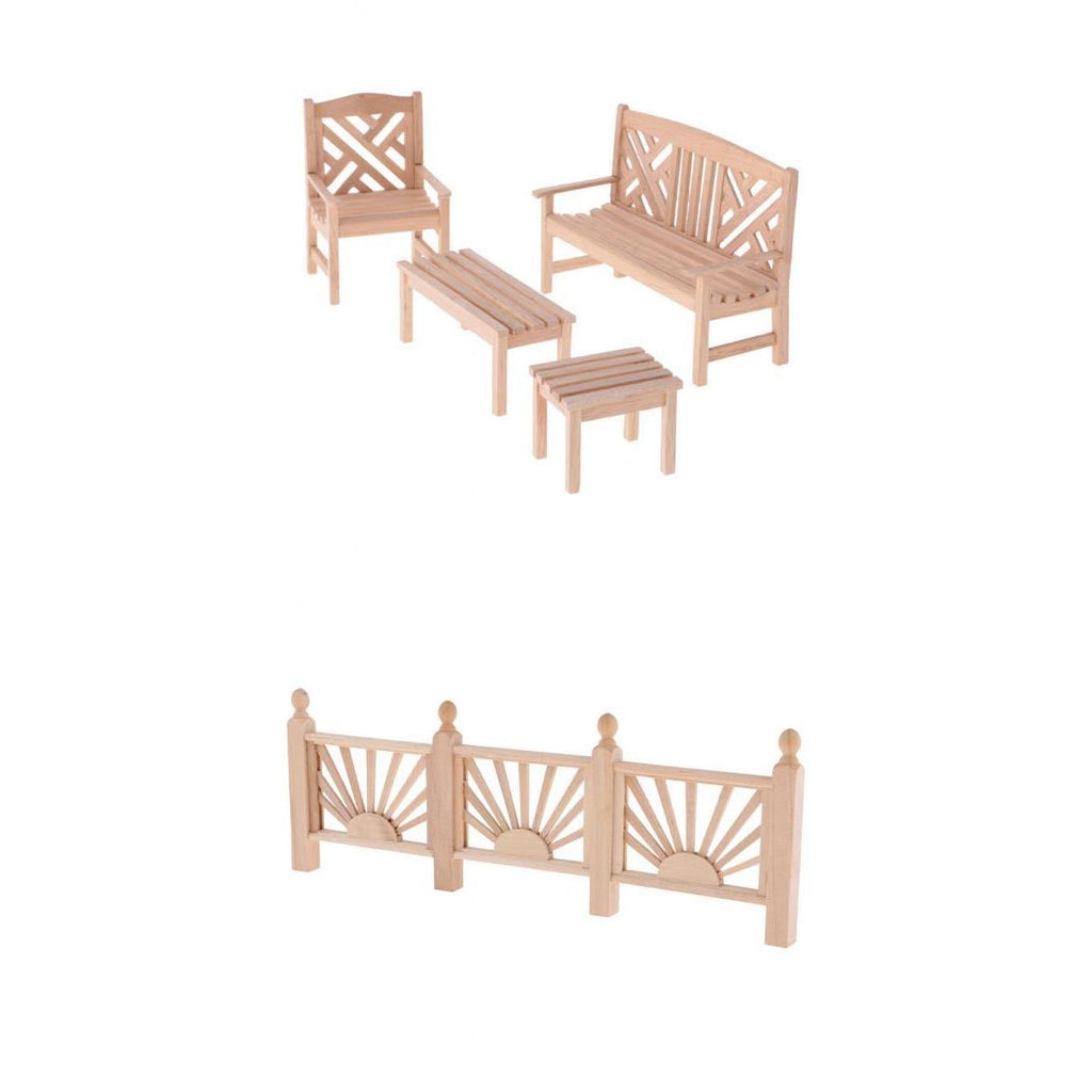 1/12 Scale Miniature Wood Rail Fence/Barrier & End Table Bench Chair Set Unpainted Furniture for Dollhouse Room Accessories Garden Decor