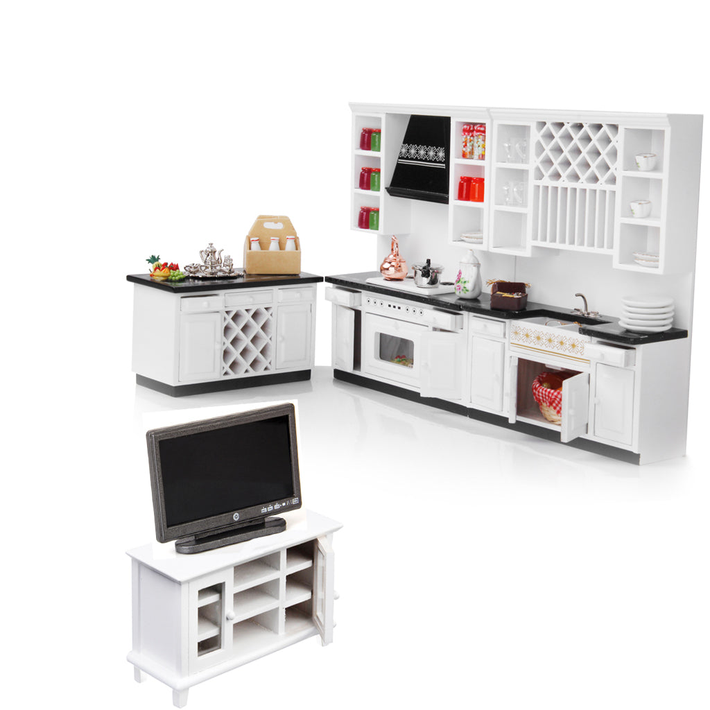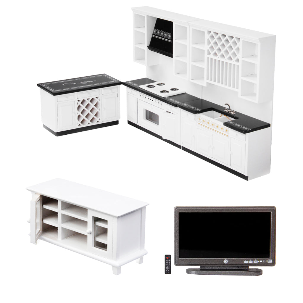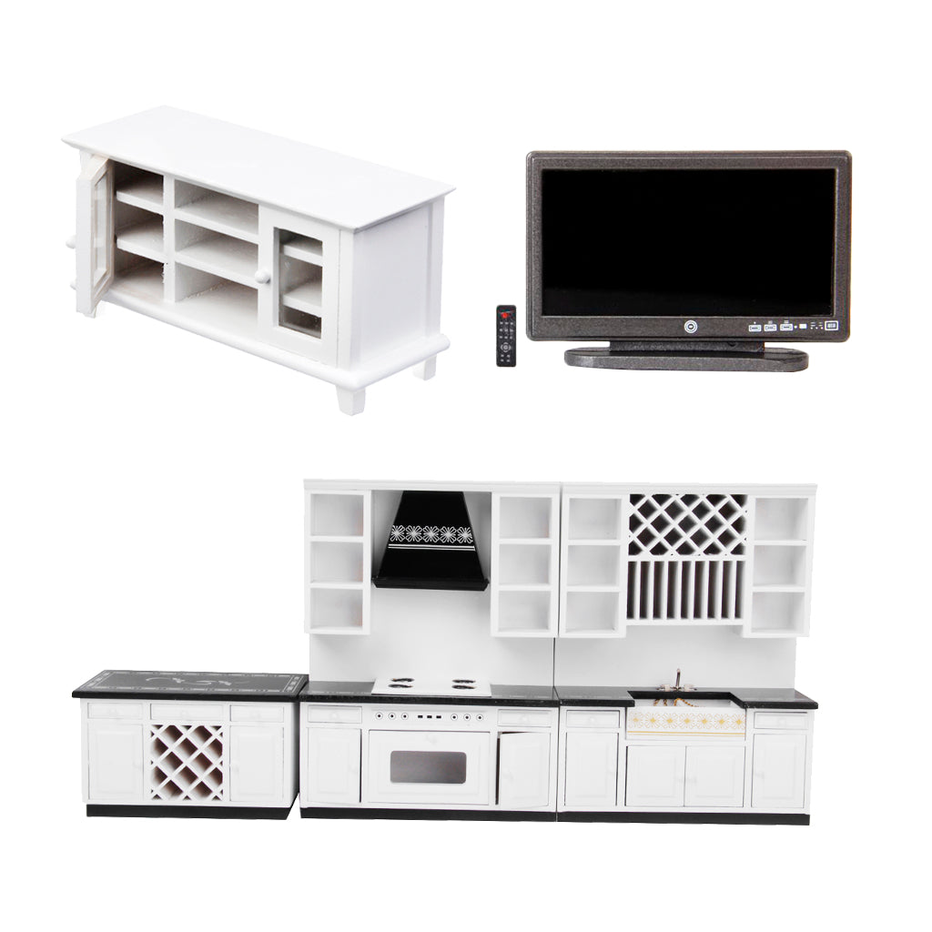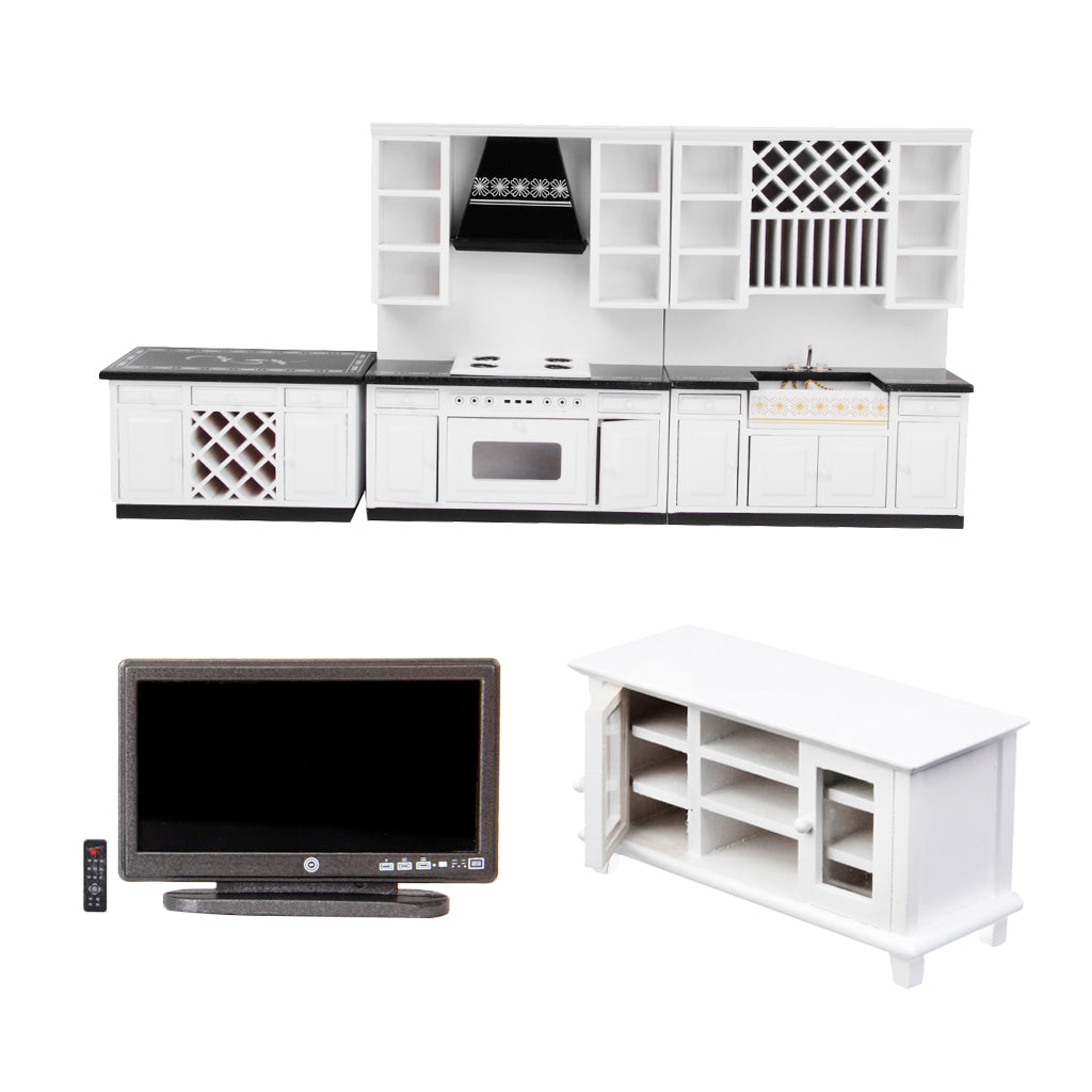 European Style Dollhouse Miniature Furniture Kit - Luxury Cabinet Set(Sink Cabinet + Stove Cabinet + Small Cabinet) & Television & TV Cabinet