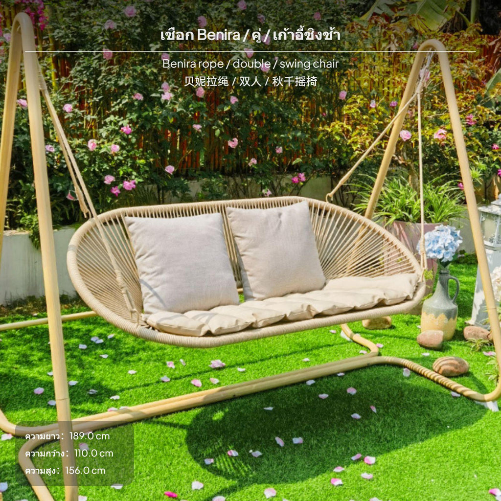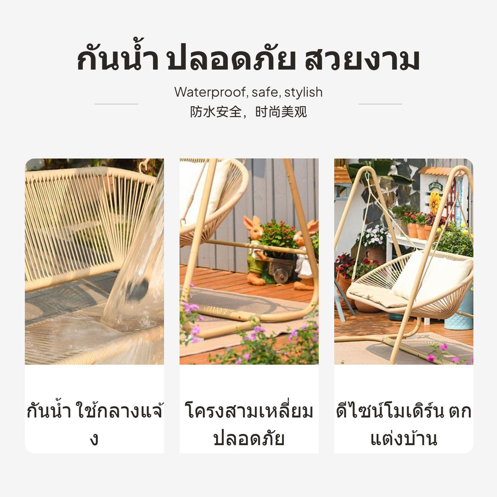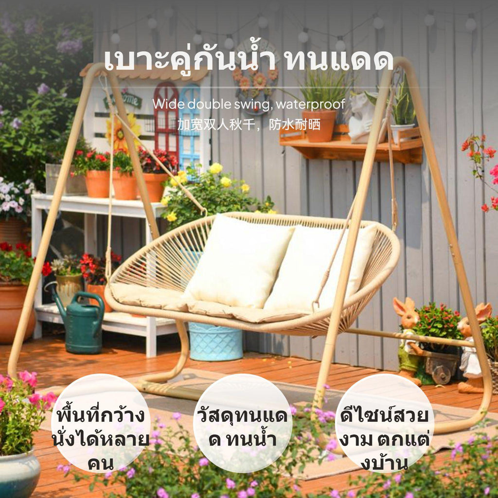 [adaptable Outdoor Relaxation] This 2-seater suspended seat chair combines essential outdoor suspended seat, patio bench, and waterproof chair features, suitable for patio, garden, balcony or villa spaces.[Stylish & Sturdy design] Engineered with a thickened galvanized steel triangular frame and handwoven Olefin ropes, the hanging seat offers outstanding rust protection and longevity.[Comfortable Waterproof Cushions] Equipped with sand cushions and pillows made from high-quality outdoor waterproof fabric, these protectors are easy to clean, colorfastresistant, and allow for hassleeffortless maintenance.[Roomy & Safe for Families] The robust framework supports several adults, making it perfect for gatherings and family leisure time in your backyard or terrace.[Simple Assembly & Mobility] Comes with easy-to-use tools for straightforward assembly and a movable design for flexible placement, providing you convenience and elegance.