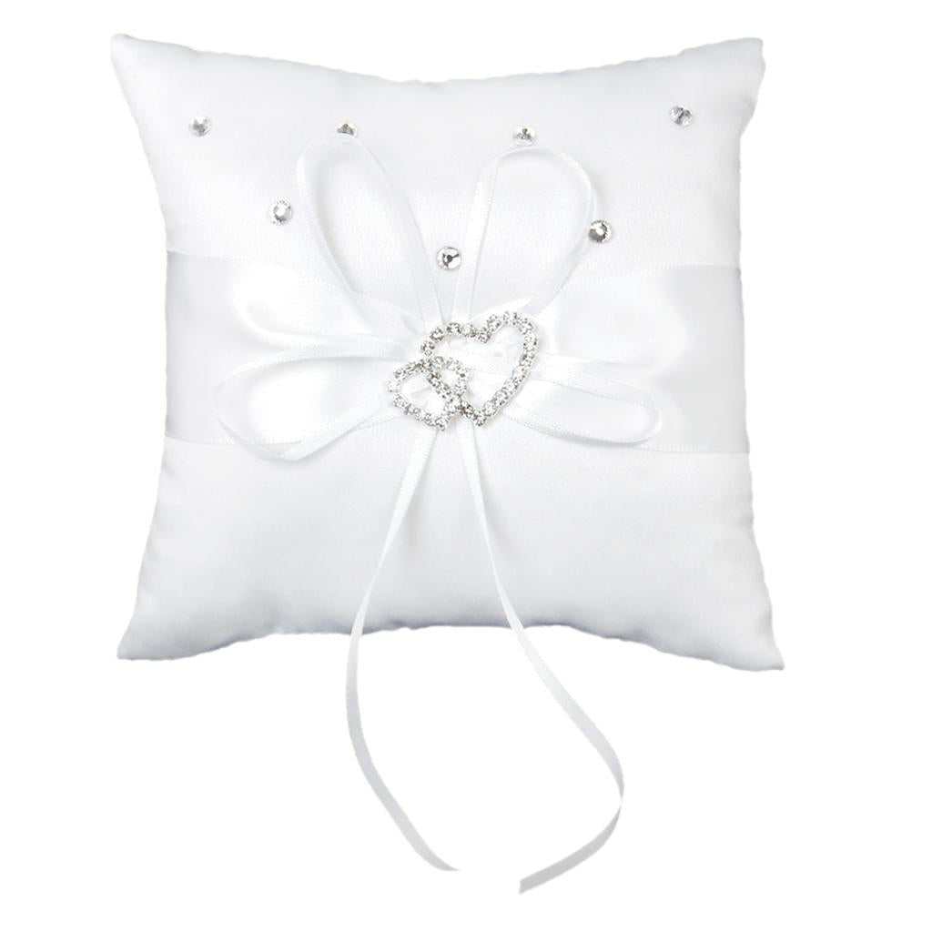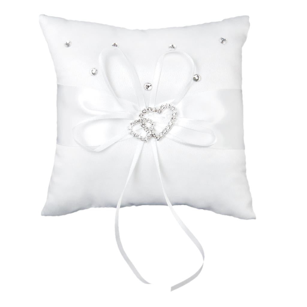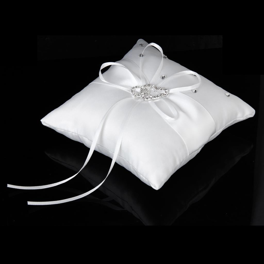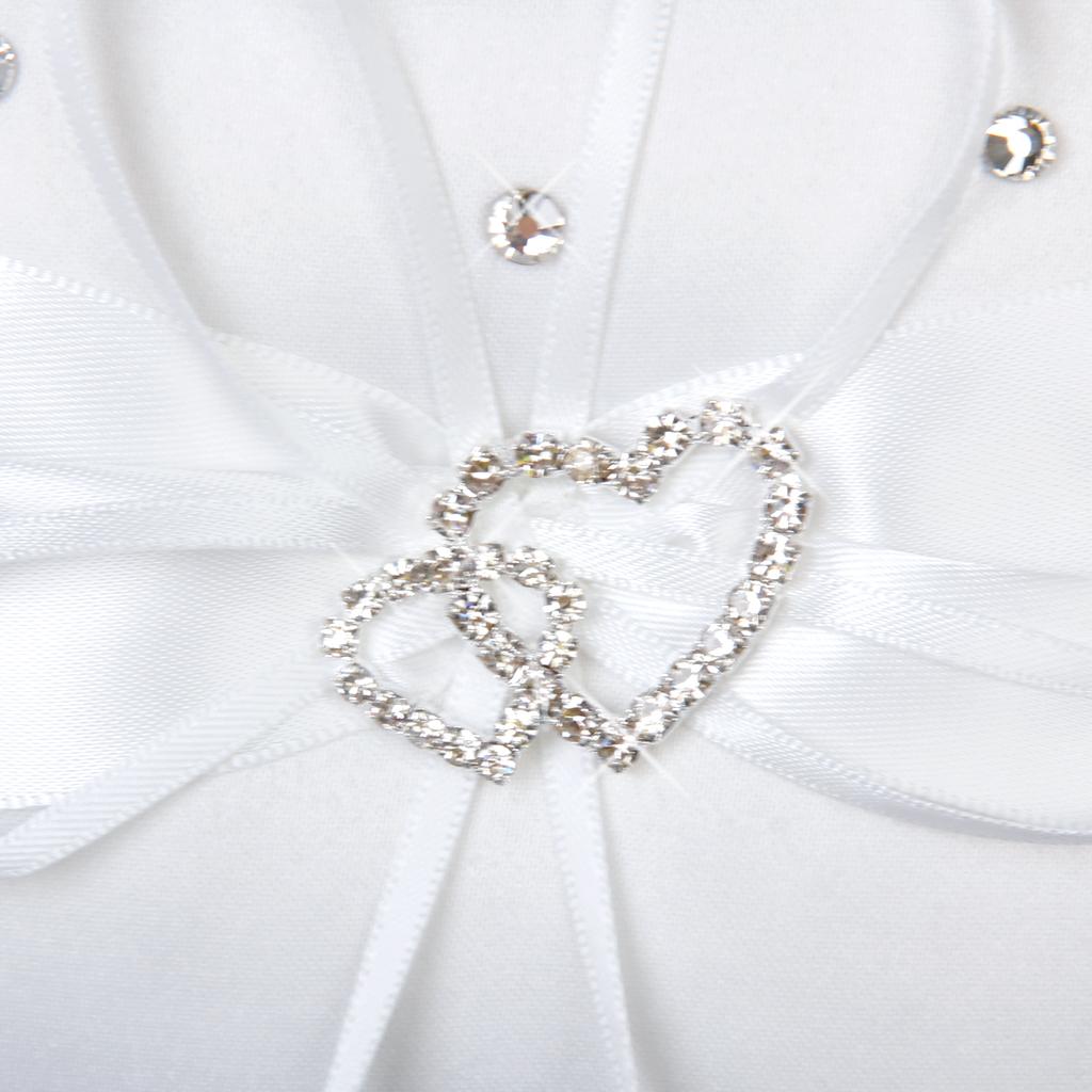 - White ring pillow decorated with satin ribbon and sparking double heart diamante buckle to tie the ring