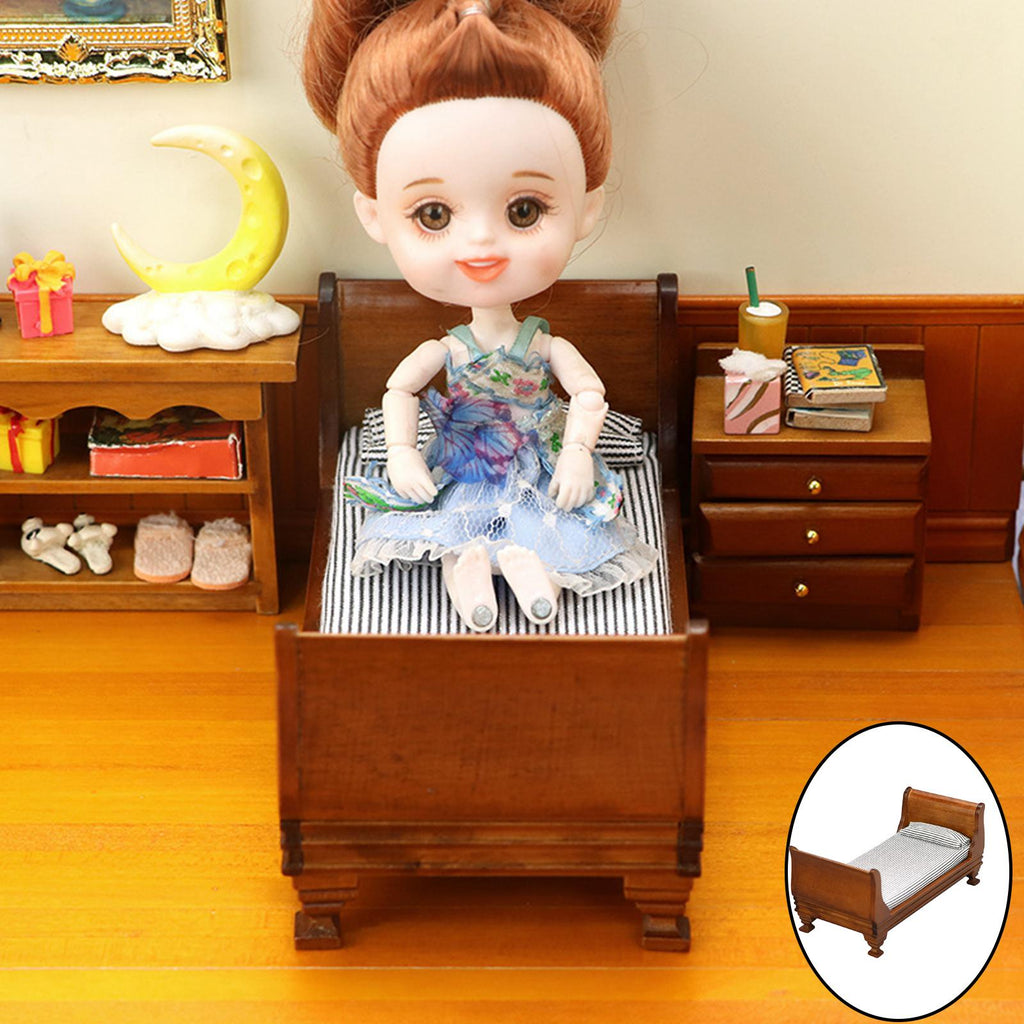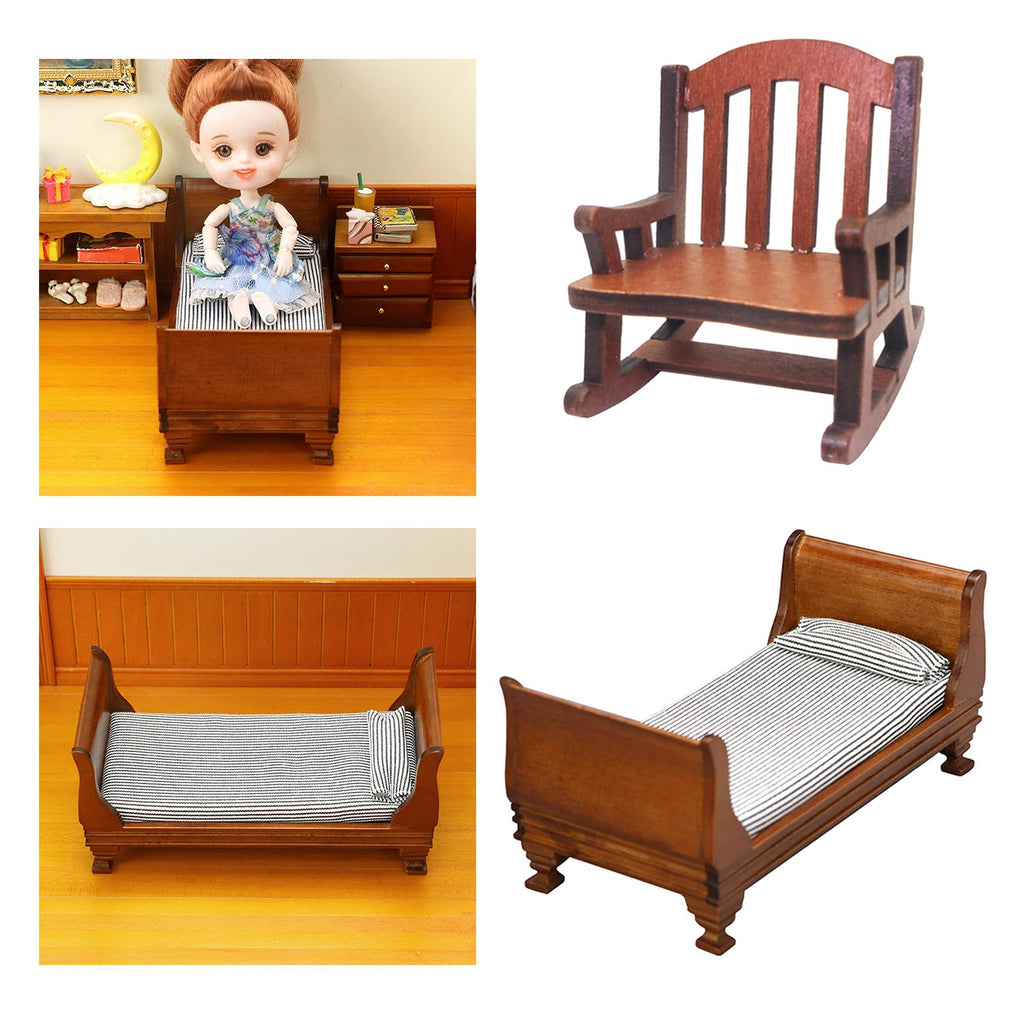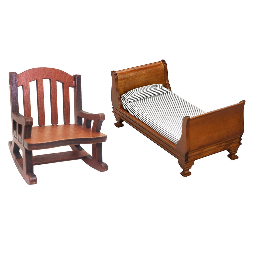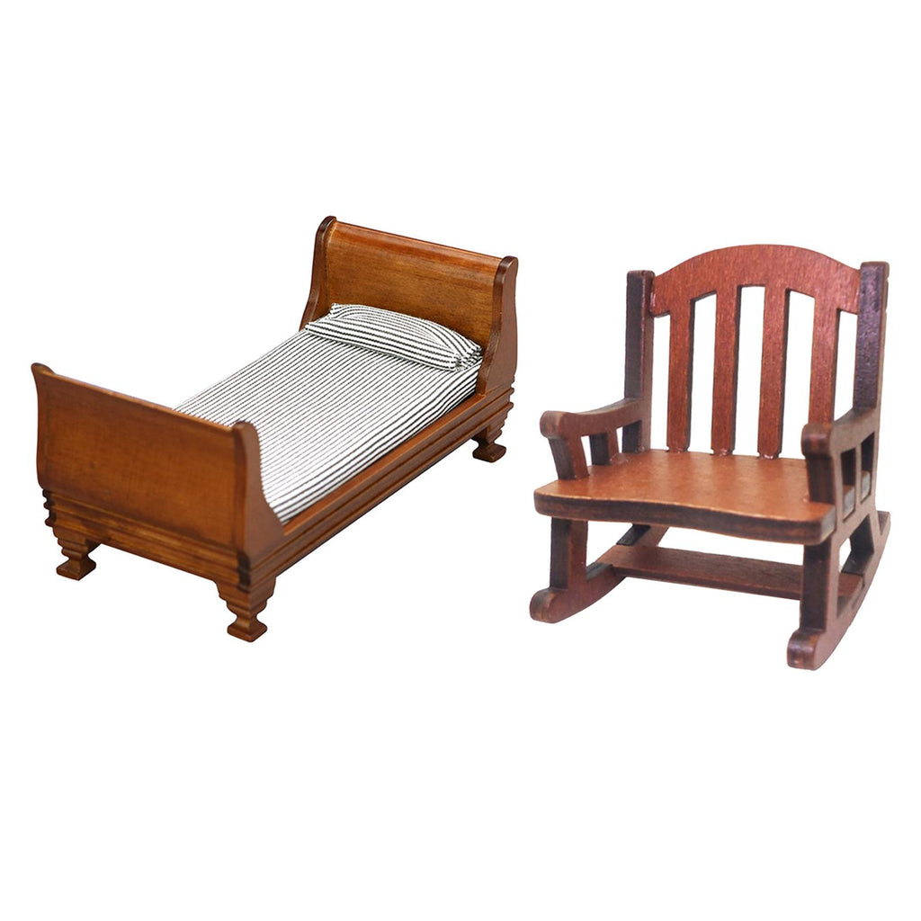 Retro Style 1/12 Scale Single Bed and Rocking Chair Furniture Model Bedroom Set. Including Bed Frame, Mattress and Pillow.