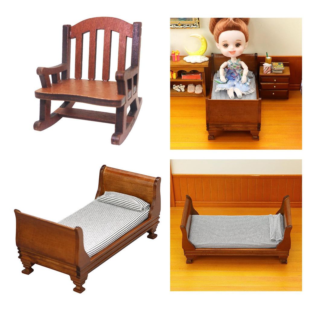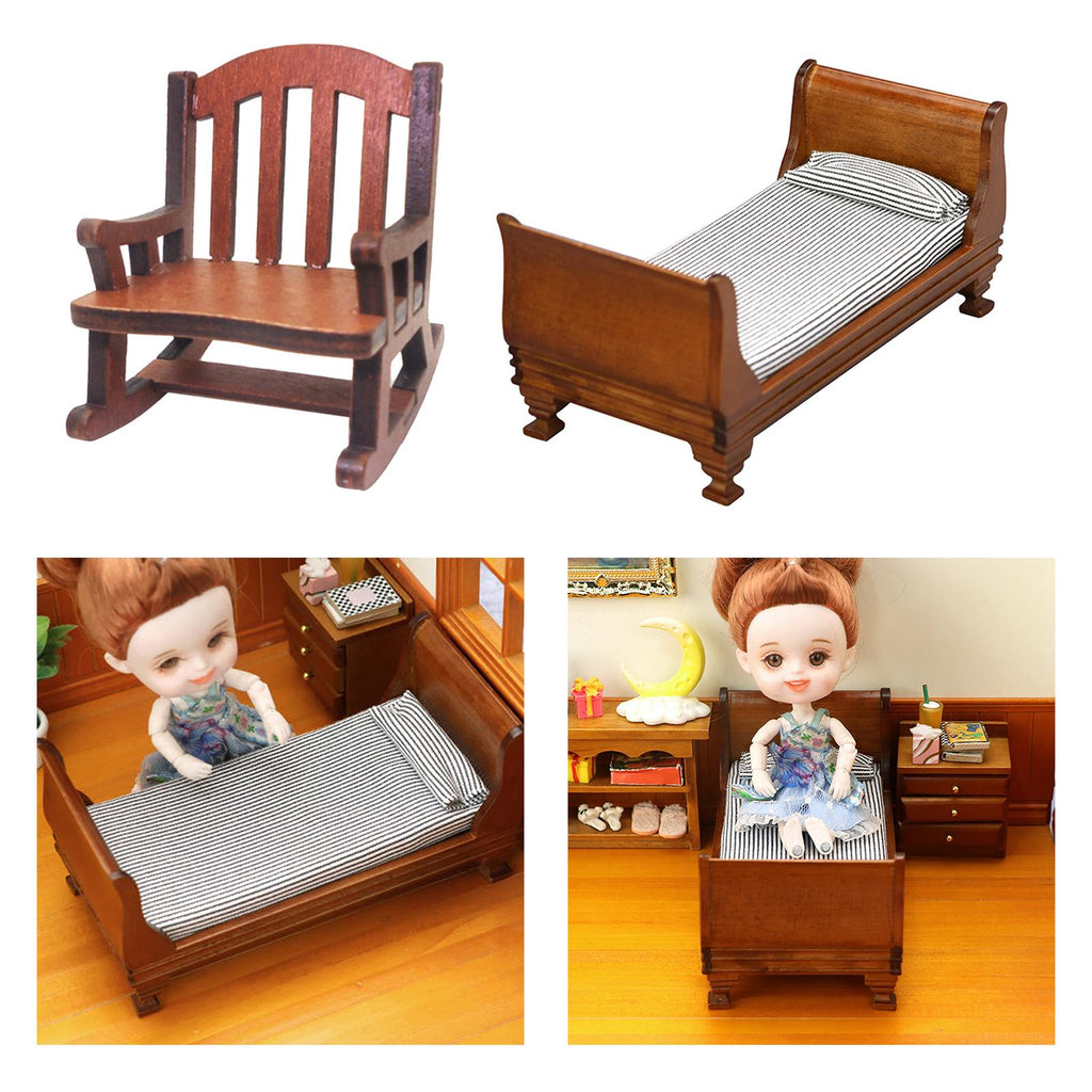 Maxbell 2x Modern 1:12 Scale Doll House Bed & Rocking Chair Model Scenery Ornaments