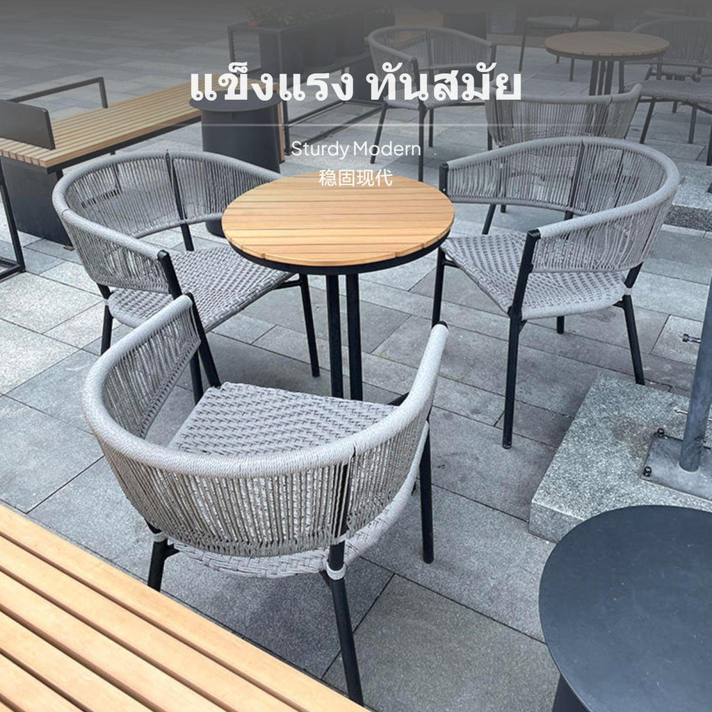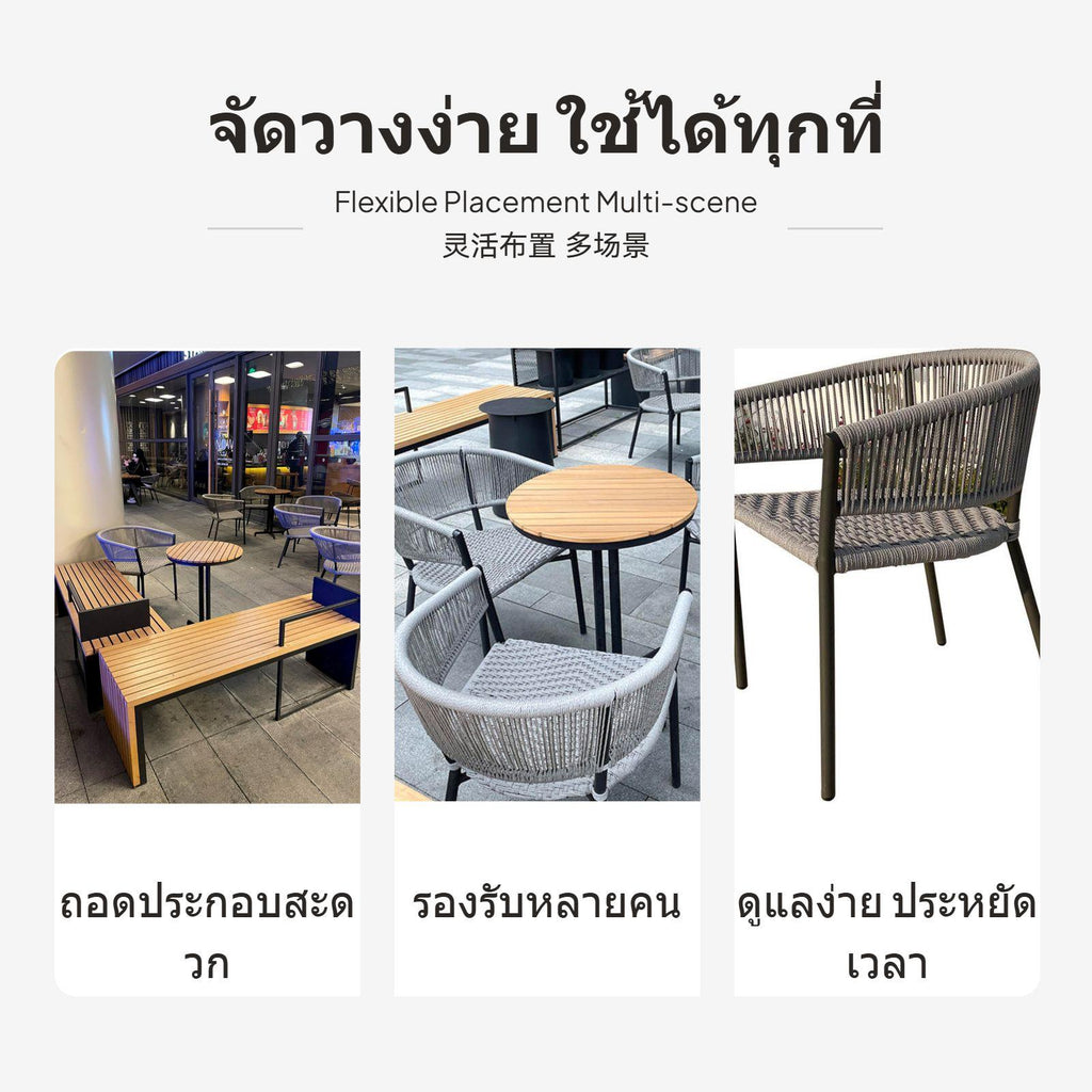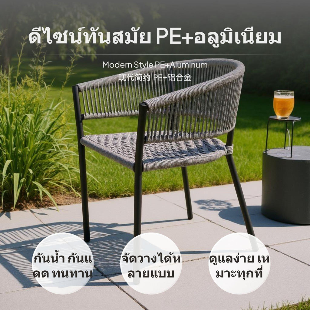 [adaptable Outdoor Seating Solution] This 3-piece outdoor table and chair set features a modern bistro design, including a round polywood table and two PE rattan chairs, blending seamlessly into patios, coffee shops, gardens, balconies, and outdoor dining spaces.[Weather-Resistant Materials] Made with weatherproof PE rattan and a polywood surface, this set is easy to clean, resists fading, and is designed for year-round outdoor use.[Practical Design with Stackable Chairs] The set’s PE wicker chairs are designed for comfortable seating and can be stacked for convenient storage, making it perfect for flexible outdoor arrangements in both home and commercial settings.[Sturdy Construction & Easy Assembly] Built with a high-strength metal frame for robust support and equipped with a stable four-pronged base, ensuring both reliability and ease of assembly for quick setup.[Modern Aesthetic with Multiple Color choices] The clean lines and variety of color choices allow this patio furniture set to enhance modern, minimalist, or French bistro decors for cafés, guesthouses, and homes alike.Specification: