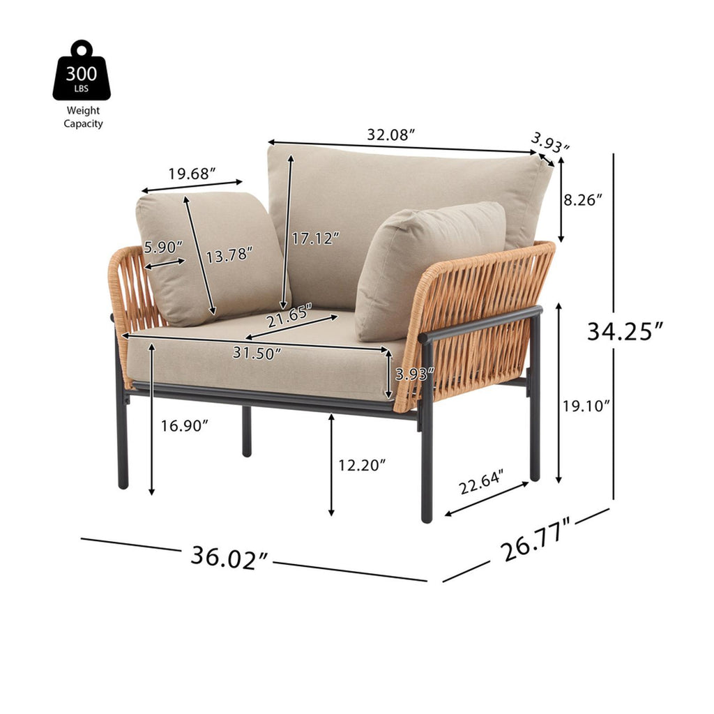 36" Beige and Light Wood-Tone Rope Iron Lounge Chair with Cushions, Perfect