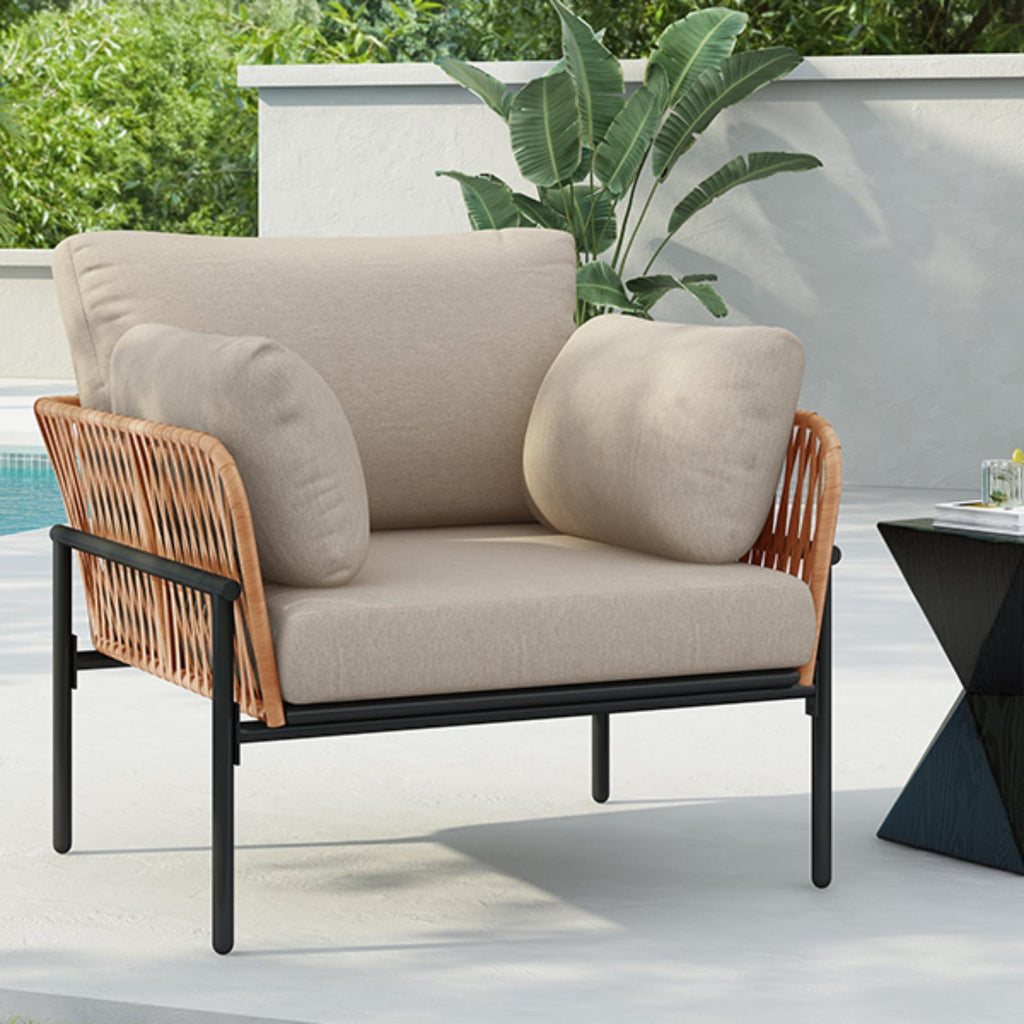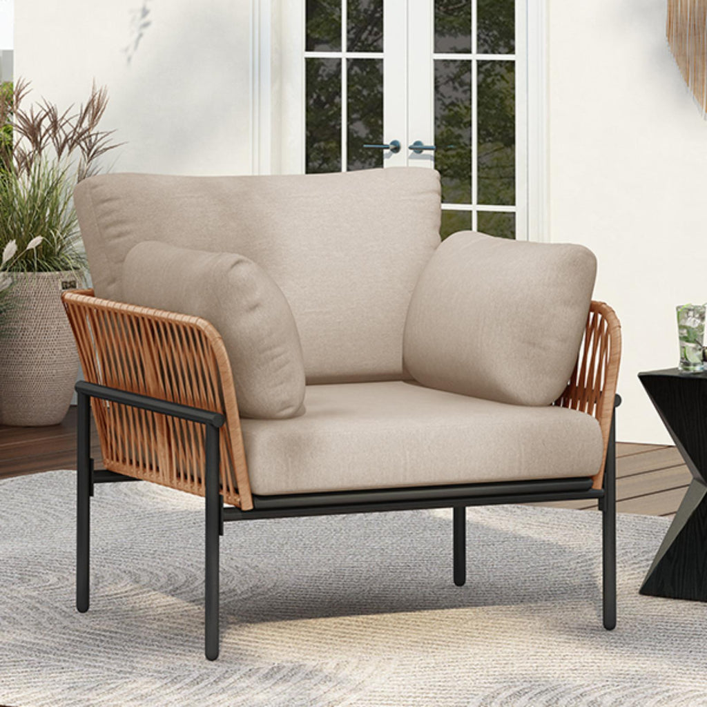 - Warm and Inviting Design: This lounge chair combines soft beige cushions with light wood-tone synthetic rope accents, offering a natural yet modern aesthetic. The color palette exudes warmth and blends seamlessly into outdoor patios, balconies, or cozy indoor corners- Sturdy and Weather-Resistant Build: Built with a powder-coated iron frame, this chair offers exceptional stability and strength. The light wood-tone rope detailing mimics natural rattan while providing enhanced weather resistance and longevity, ensuring the chair maintains its beauty over time