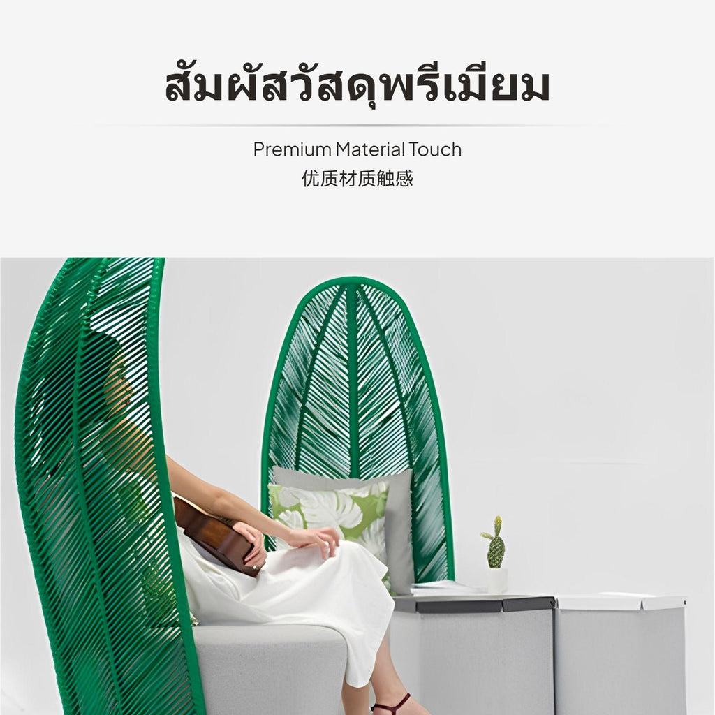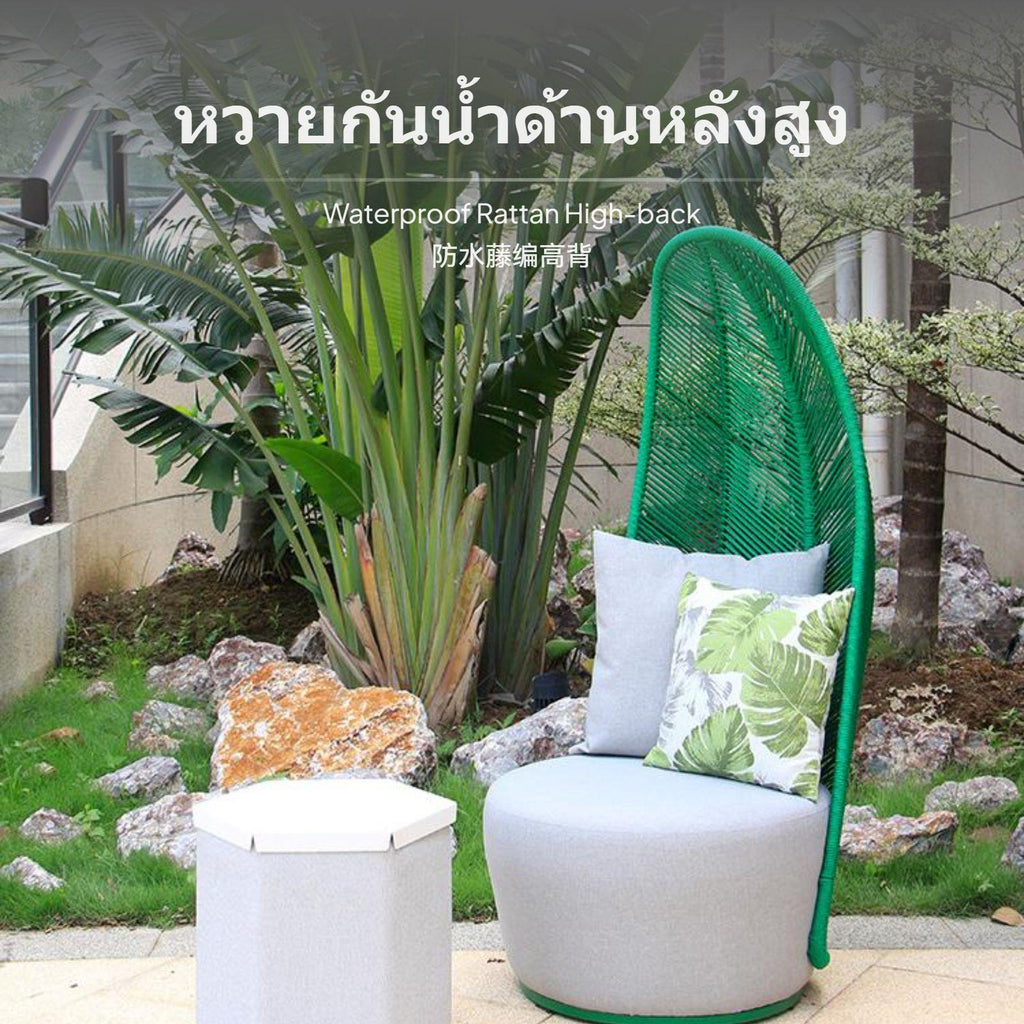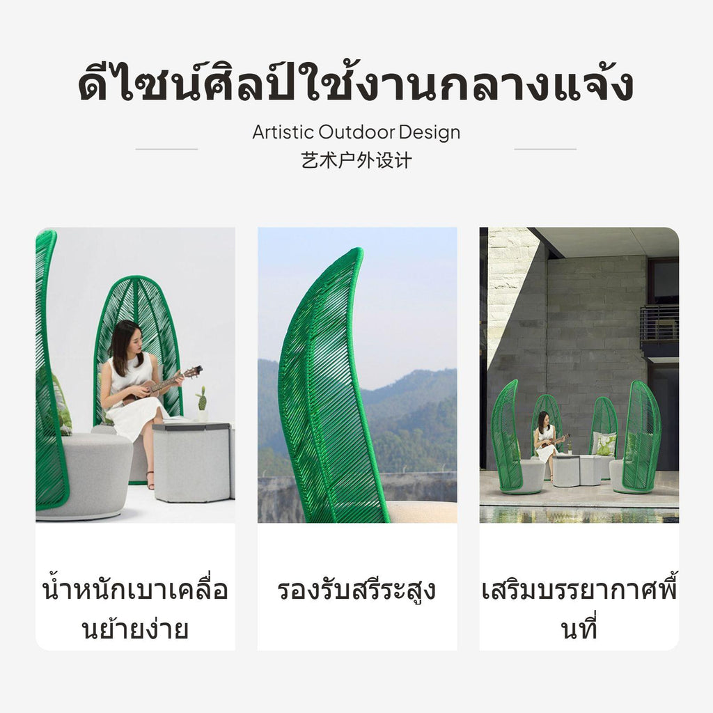 [Creative Banana frond High rear design] This single outdoor sofa features a distinctive banana frondinspired high rear design that sets a striking visual centerpiece point in any outdoor patio, garden, courtyard, or hotel space.[Wicker Detailing with Modern Materials] Meticulously crafted from sturdy metal frame with fused construction and intricately woven verdant wicker, it combines artistic style with dependable structural integrity.[Comfortable & Removable seat pads] The seat comes with a soft fabric seat pad filled with firm and resilient sponge, offering an superb sitting comfort. The cover is removable for easy cleaning and frequent maintenance.[invigorating hues for holiday Ambience] a lively mixture of verdant and cream-colored creates a relaxed, getaway destinationinspired scene, seamlessly fitting private patios, hotel terraces, balconies or designer villa lounges.[Functional & Customizable, Perfect for Multiple Scenes] Designed with easy mobility and customization features, this chair adapts to various outdoor and indoor leisure settings, enhancing practicality and aesthetic.Specification: