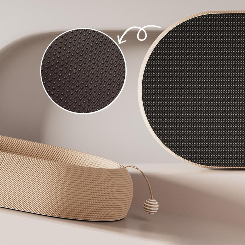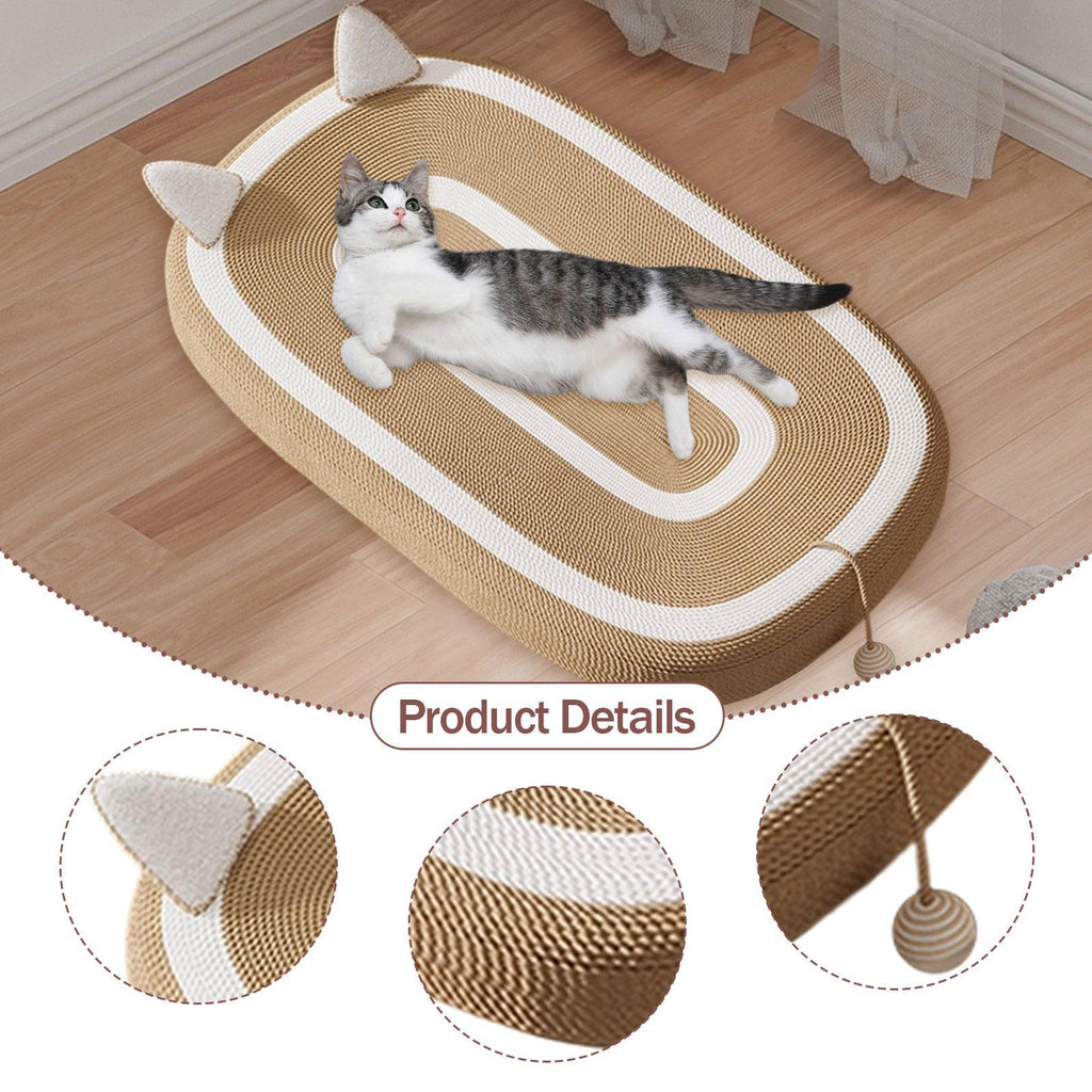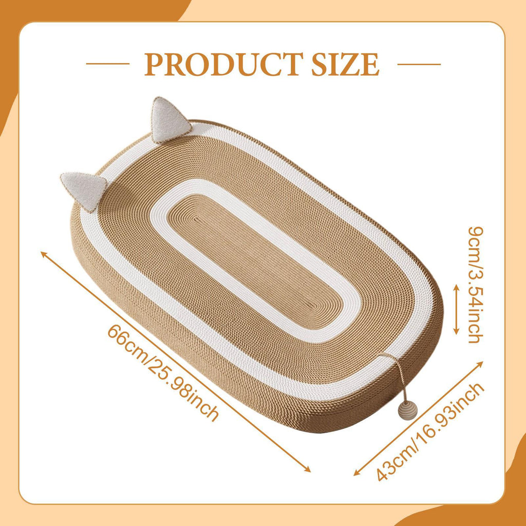 【Interactive Lounge Chair】: Featuring an oval shaped bed, this scratcher doubles as a lounge chair where cats can scratch and relax. It includes an engaging toy ball to attract your pet's attention, making it a wonderful place for lounging like on a bed or sofa