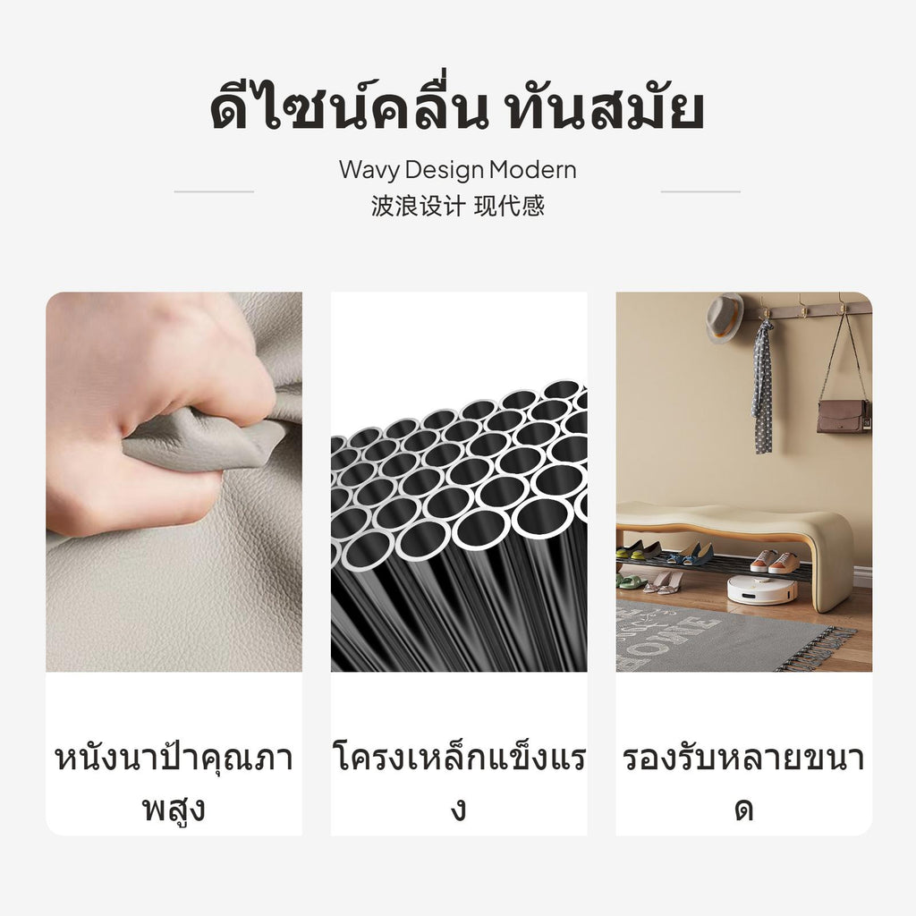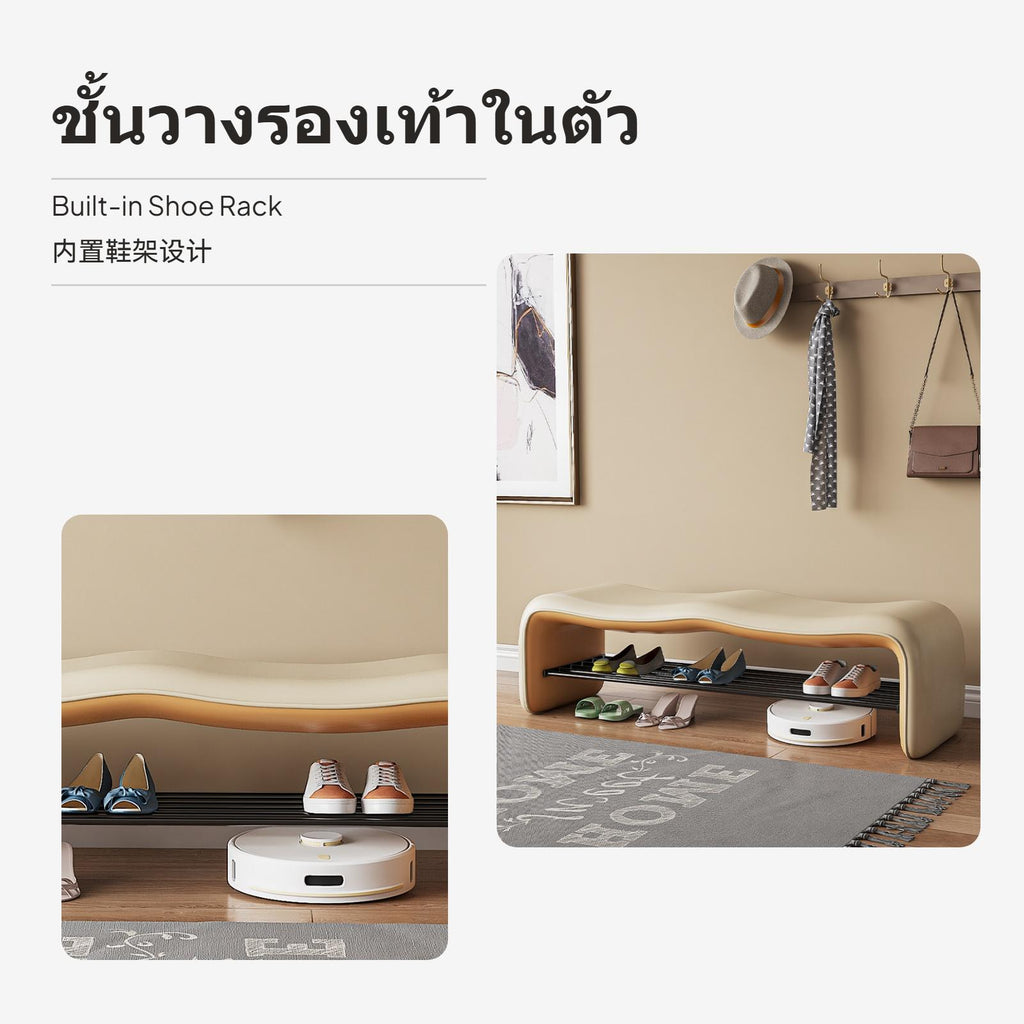 [Multifunctional Storage and Seating] This shoe bench combines an elegant wave-shaped seat with integrated metal shoe rack to provide both comfortable seating and smart organization for your entryway, closet, or bedroom.[Premium Materials, High Load Capacity] Crafted from quality cat paw leather and sturdy metal, this bench supports high-capacity and ensures a stable and robust framework for everyday use.[Comfortable padding Design] The paddinged seat features soft, resilient padding and even upholstery, making it convenient to change shoes and perfect for relaxing, especially for seniors and kids.[Flexible Size and Color choices] Available in 4 sizes (80/100/120/150cm) and 2 stylish color combinations (sand+Orange, Light Grey+Dark Grey), this bench accommodates various spaces and matches diverse decor styles.[Minimal Assembly, Modern Aesthetics] Arrives prepared to use with no complex assembly required, the minimalist modern outline and designer appeal elevate the look of living rooms, bedrooms, or hallways effortlessly.