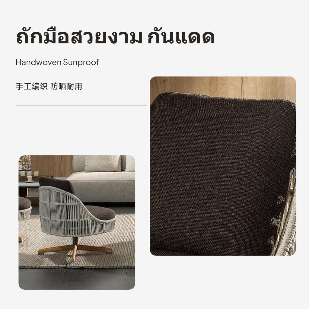 [Modern adaptable Outdoor Use] This outdoor patio rattan sofa set combines a contemporary minimalist design with high-quality teak, perfect for gardens, villas, balconies, and terraces.[Waterproof sun-resistant Features] Constructed with weather-resistant rattan and natural teak, this set withstands exposure to rain and sun, making it perfect for year-round outdoor leisure.[360° rotating Dining Chair] The included rotating dining chairs offer flexibility of movement and interactive comfort; removable and cleanable seat cushions ensure easy maintenance.[Sturdy Metal & Teak Construction] Featuring a robust aluminum alloy frame, firm teak base, and skilled welding, this furniture provides enduring stability without fear of rusting.[Flexible Arrangement for Any Scene] The set includes two sizes of round teak tables and several color choices for the rattan and cushions, allowing customization for gatherings, relaxation, or family dining.
